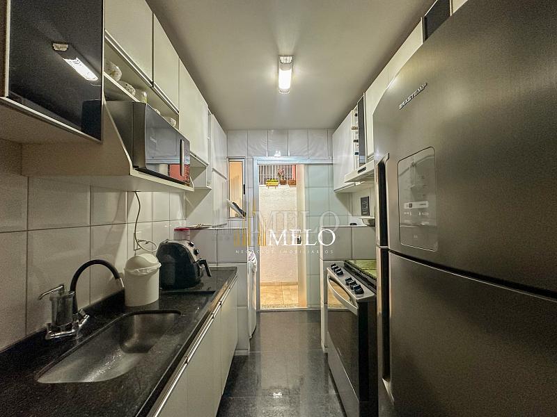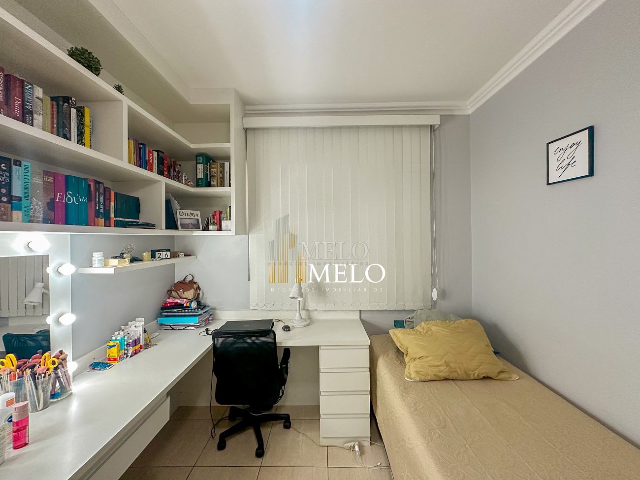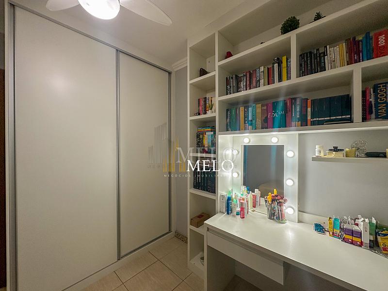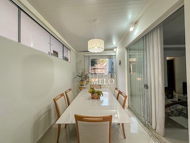Sala ampla para 2 ambientes, cozinha com armários, área de serviço independente com teto retrátil, 3 quartos, sendo 1 suíte climatizada com armários e varanda, banheiro social e espaço externo coberto.