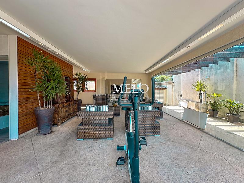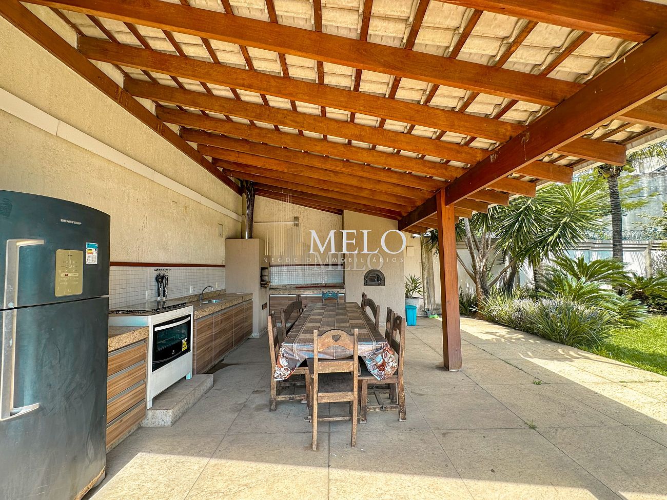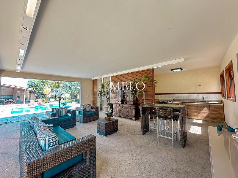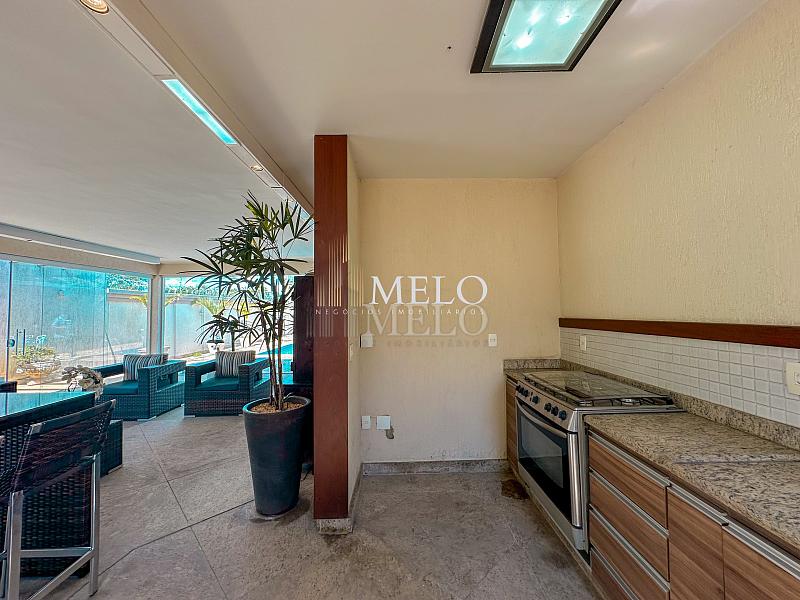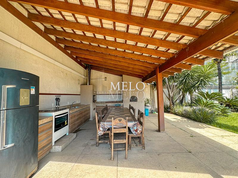 Área externa: Espaço gourmet com churrasqueira a carvão e forno, bancadas em granito, piscina com cascata, amplo salão com sauna e banheiro.