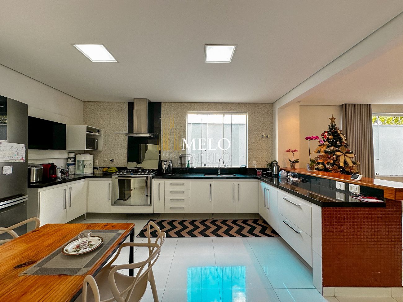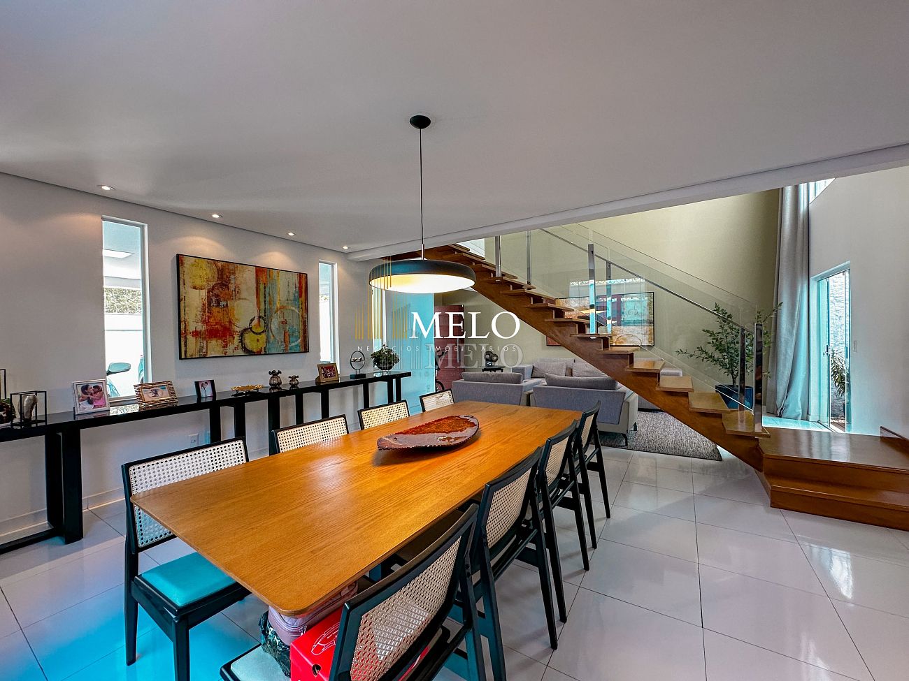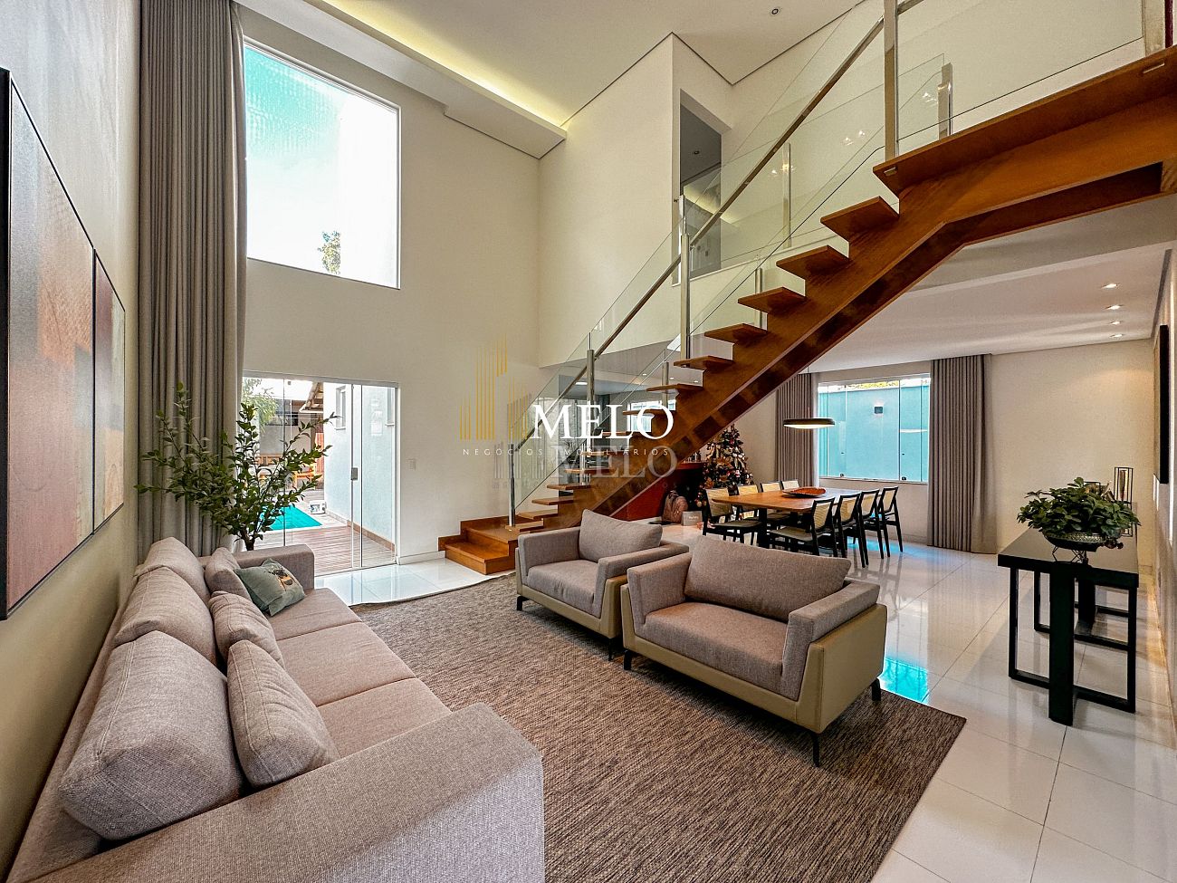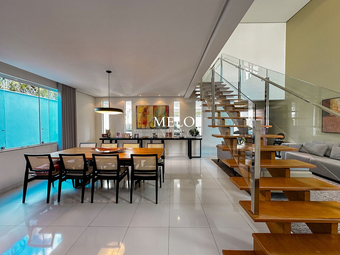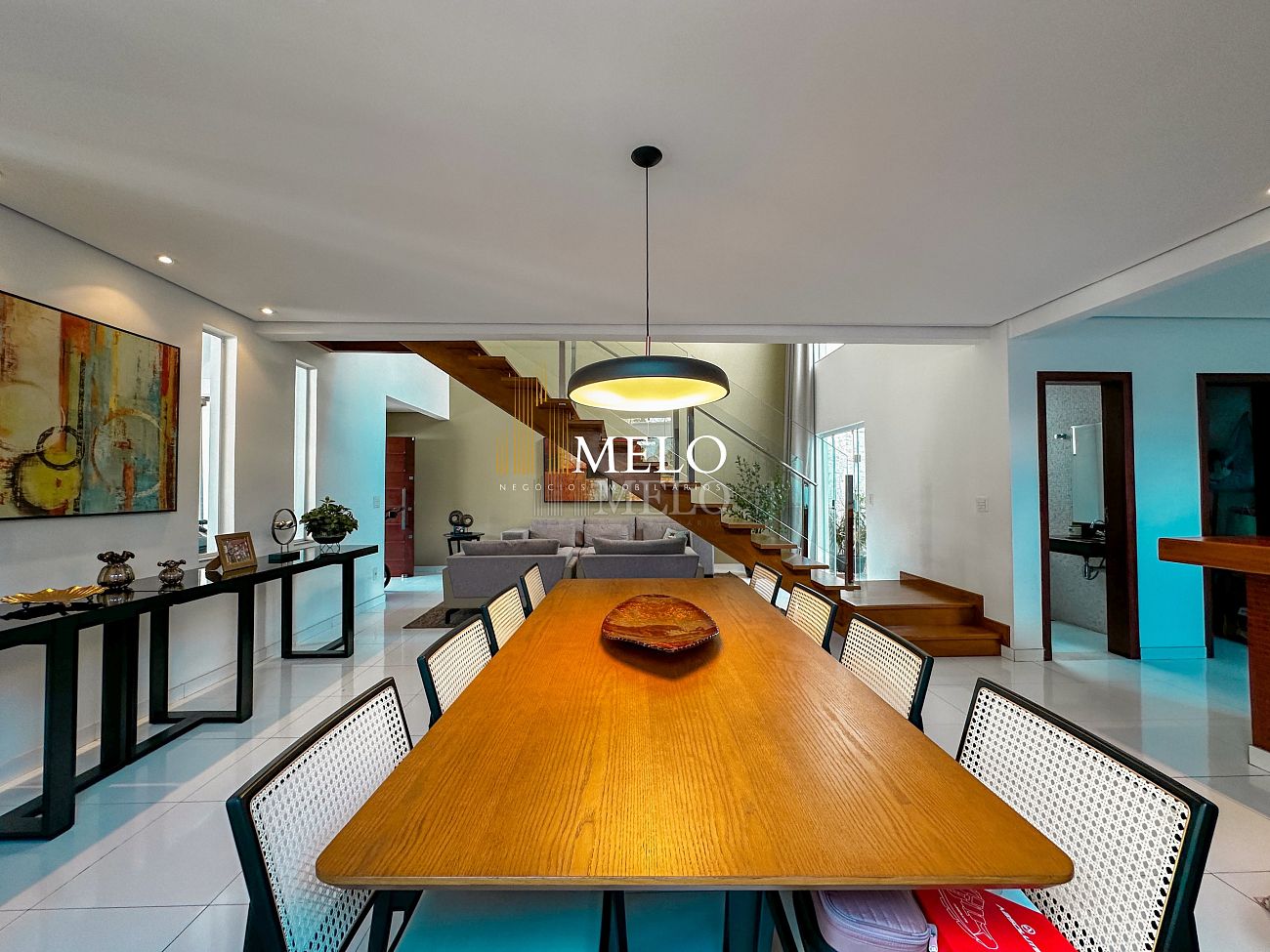 Primeiro pavimento: Sala ampla com pé direito duplo; Copa; Cozinha Americana , armários planejados, bancada; Despensa; Lavabo , Armários planejados; Área gourmet montada , Churrasqueira , Ducha , Piscina;
