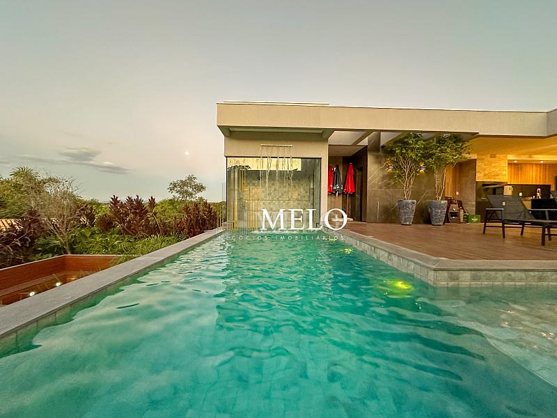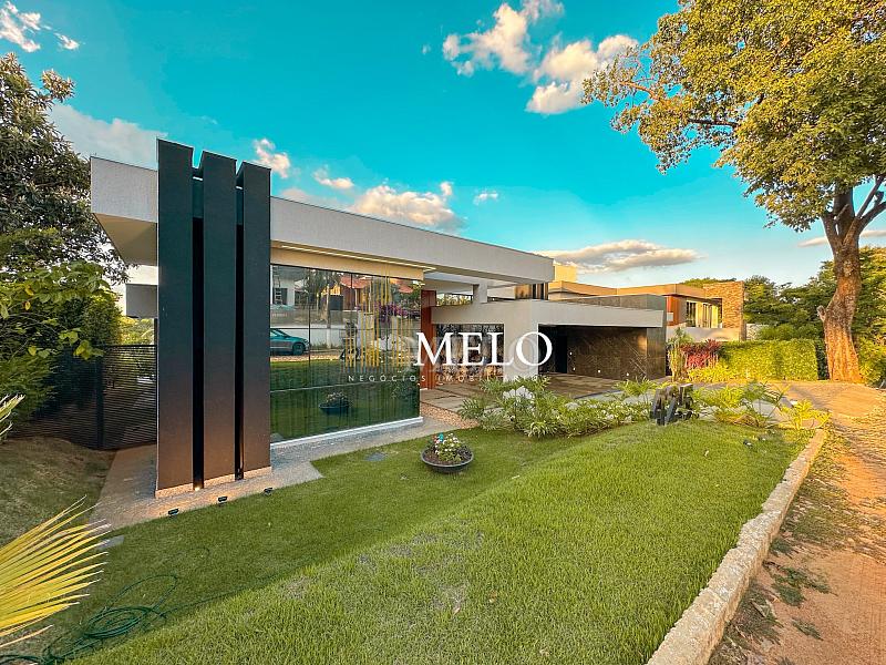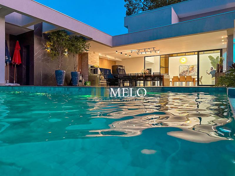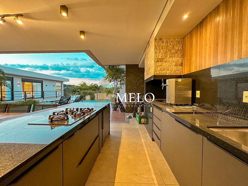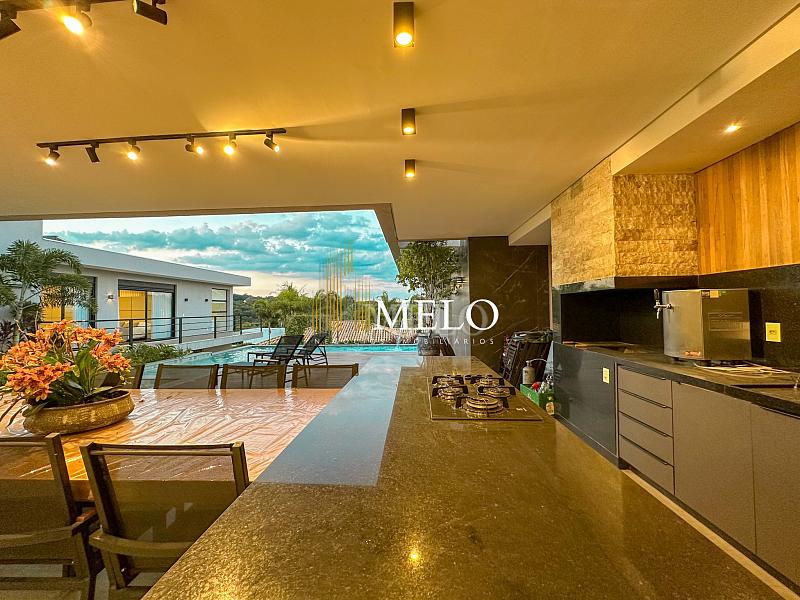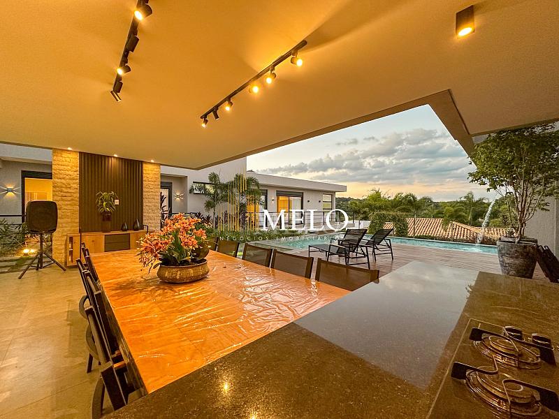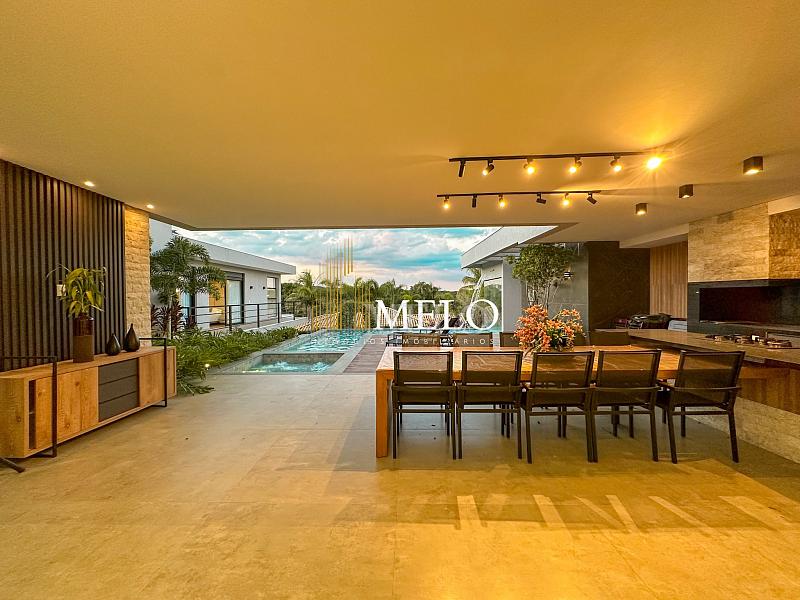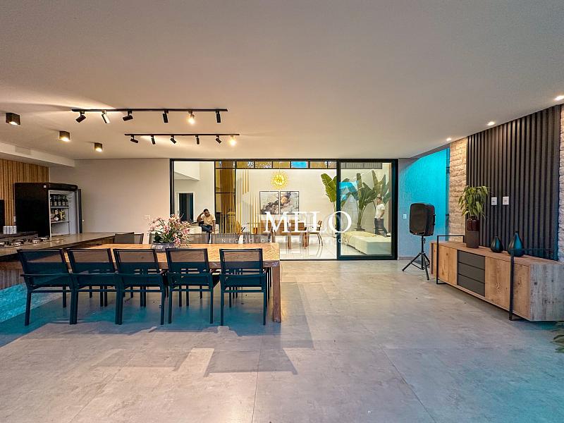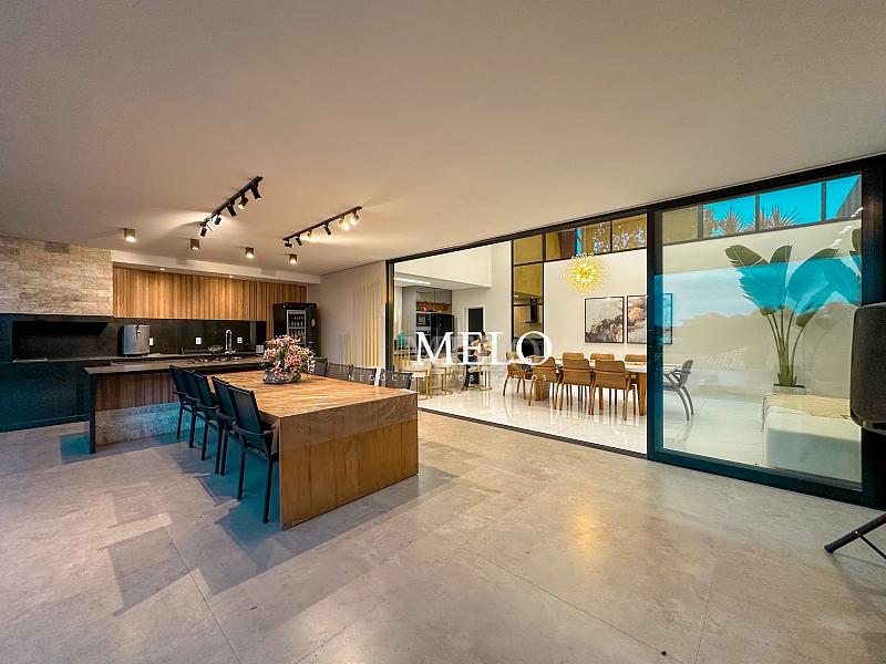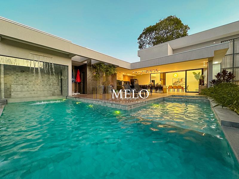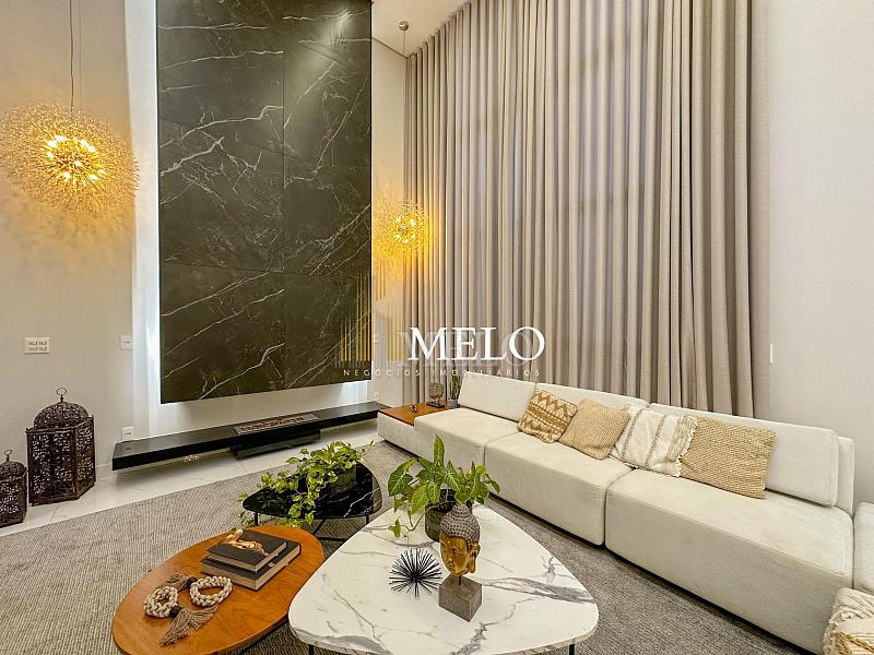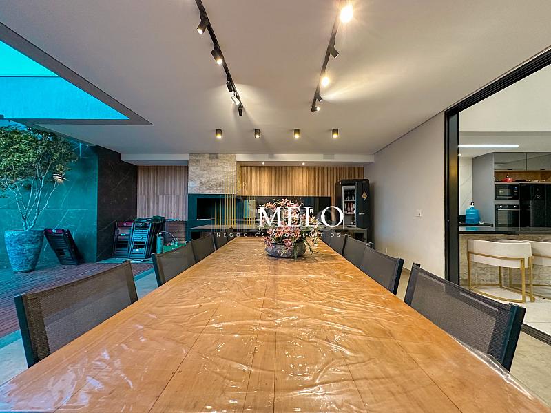 Composta por uma sala de estar espaçosa com pé direito duplo, integrada a sala de jantar, sala de TV toda mobiliada, 4 quartos, sendo 4 suítes com closet, DCE completo, cozinha gourmet com armários personalizados com integração a área gourmet. Externo composto por área gourmet com piscina, sauna, lavabo, lago de carpas com balanço, fogo de chão e quarto de adega.