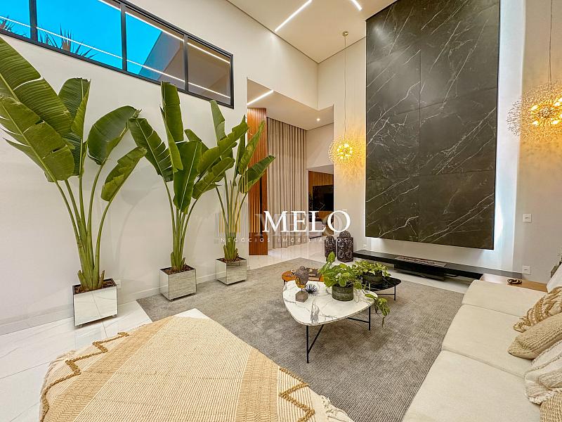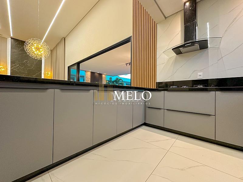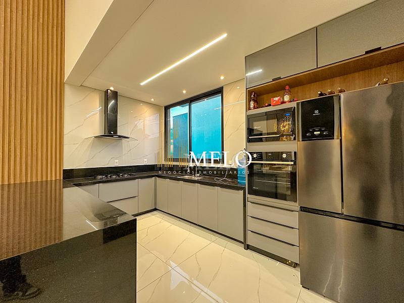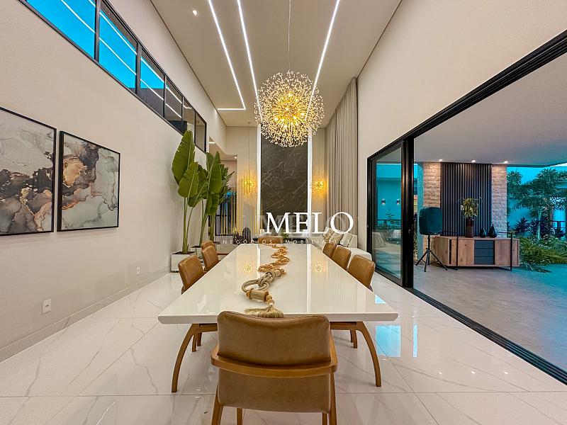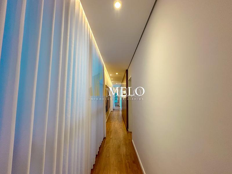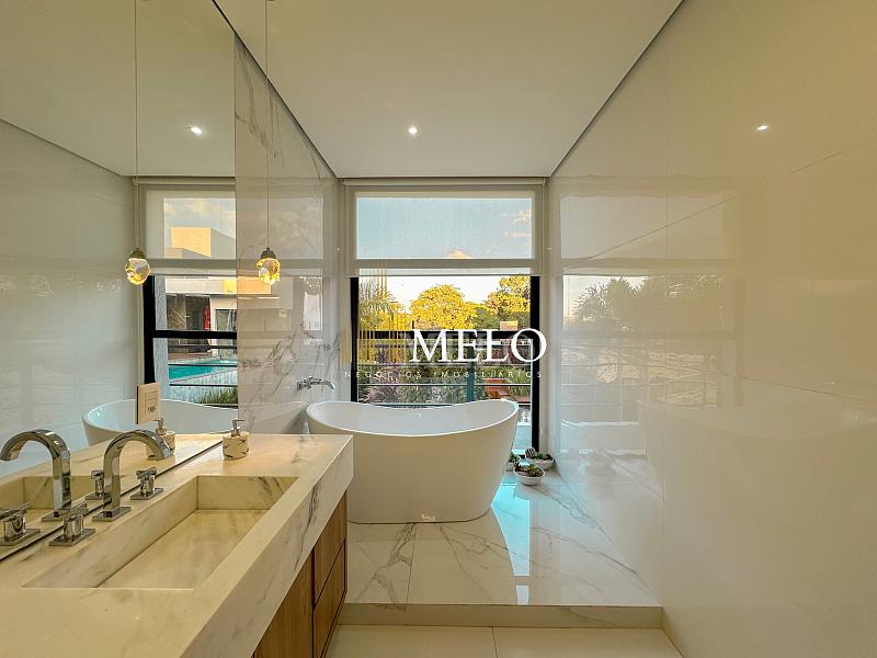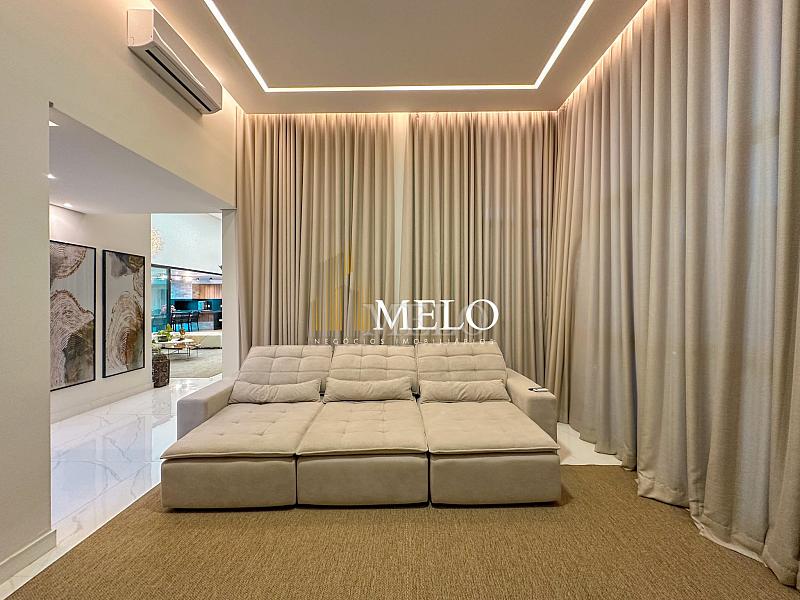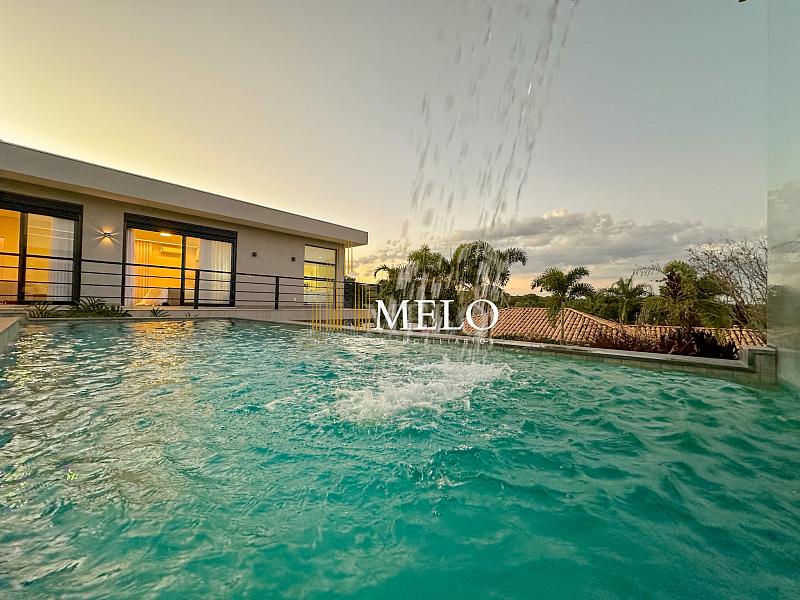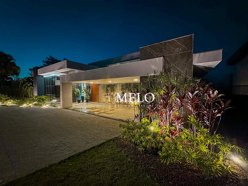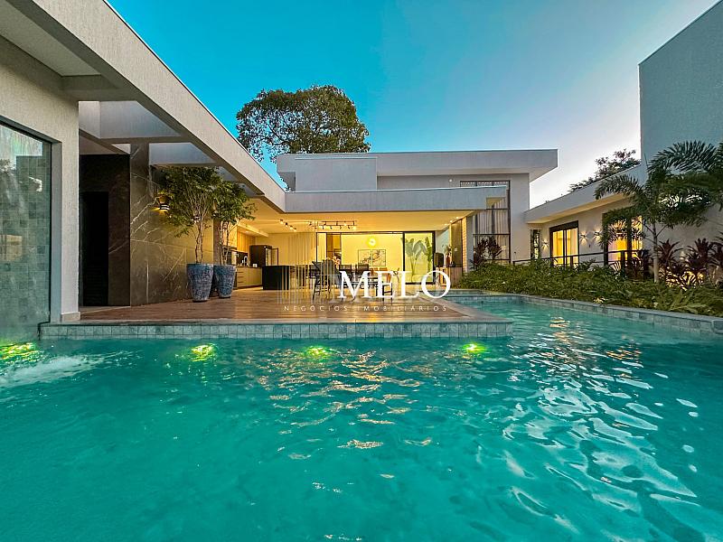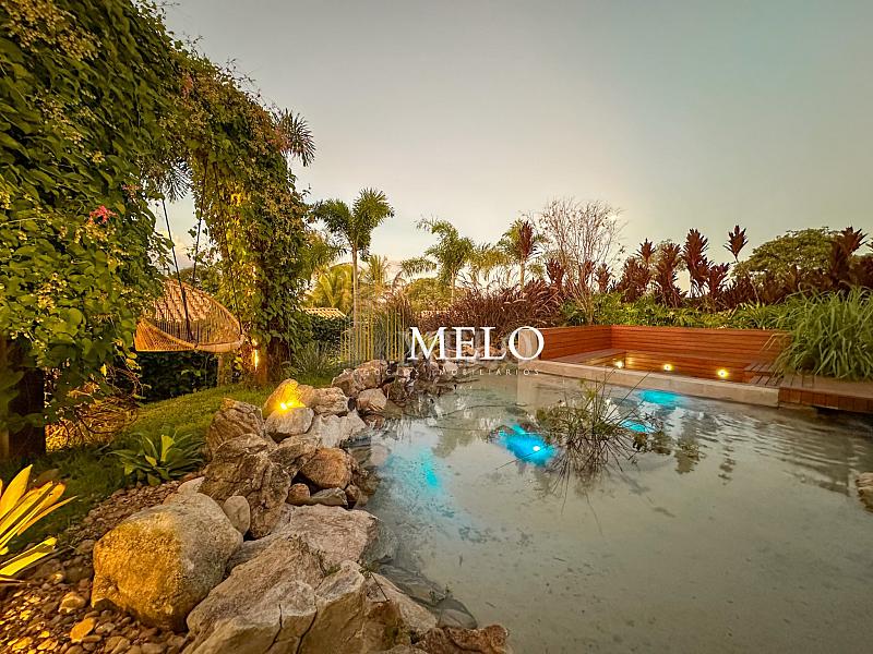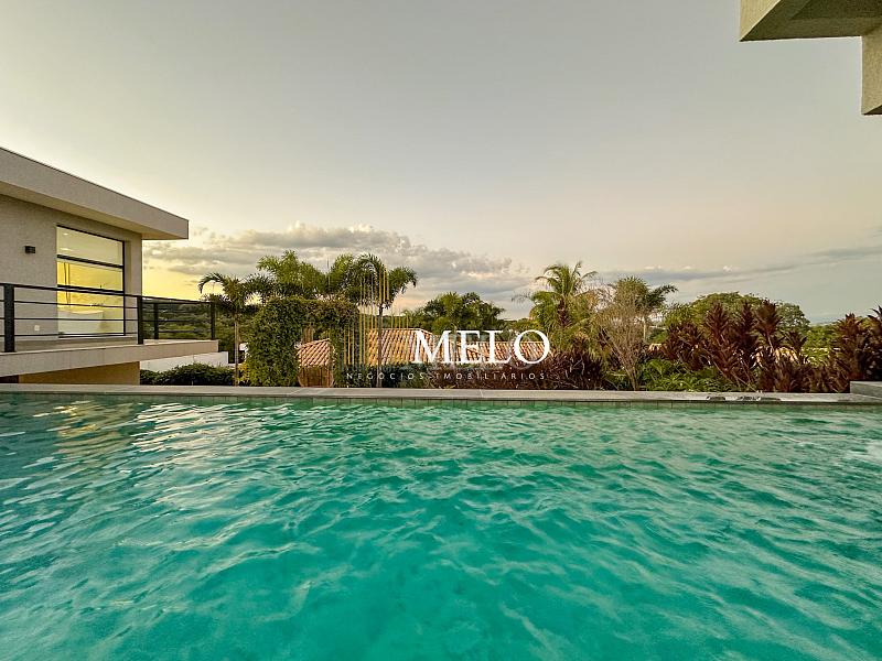 Composta por uma sala de estar espaçosa com pé direito duplo, integrada a sala de jantar, sala de TV toda mobiliada, 4 quartos, sendo 4 suítes com closet, DCE completo, cozinha gourmet com armários personalizados com integração a área gourmet. Externo composto por área gourmet com piscina, sauna, lavabo, lago de carpas com balanço, fogo de chão e quarto de adega.