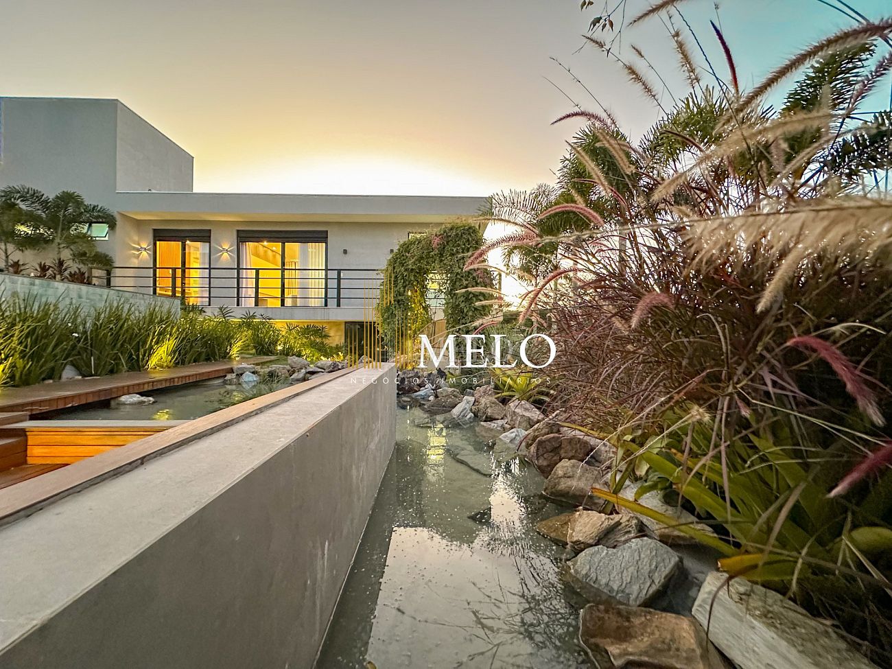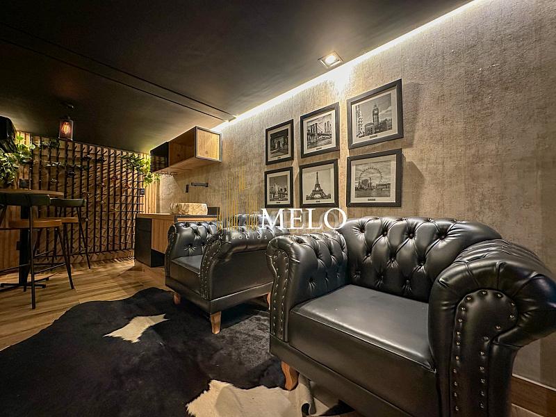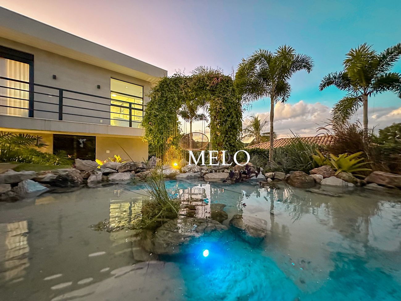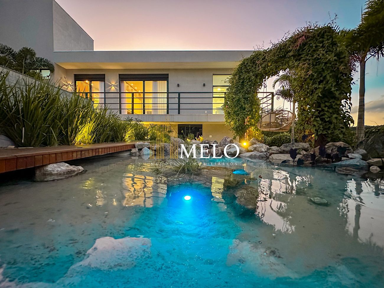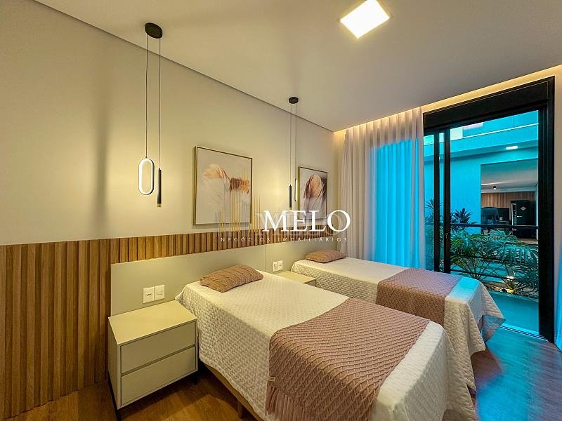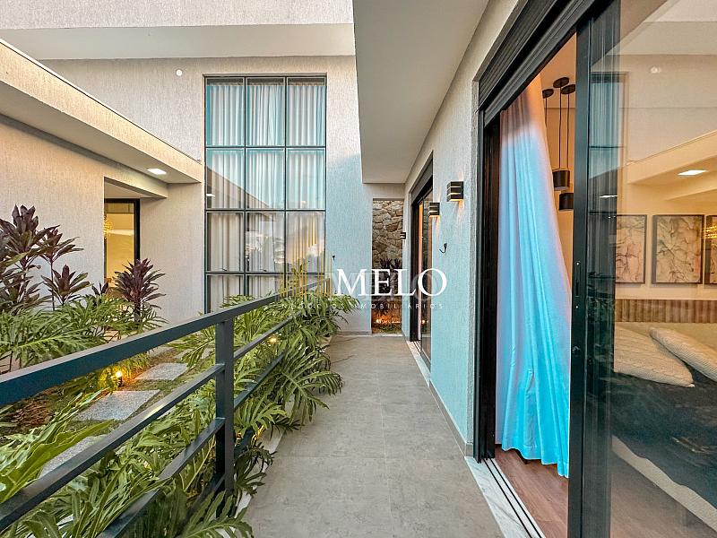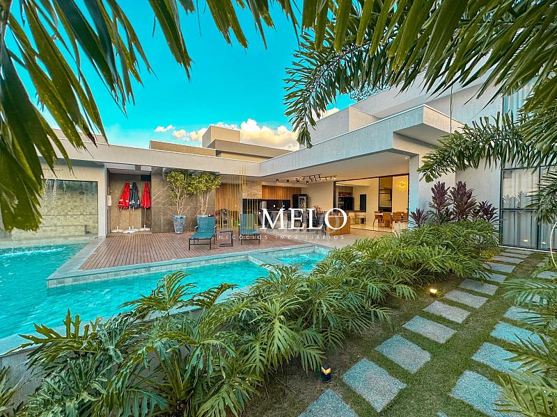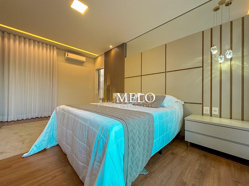 Composta por uma sala de estar espaçosa com pé direito duplo, integrada a sala de jantar, sala de TV toda mobiliada, 4 quartos, sendo 4 suítes com closet, DCE completo, cozinha gourmet com armários personalizados com integração a área gourmet. Externo composto por área gourmet com piscina, sauna, lavabo, lago de carpas com balanço, fogo de chão e quarto de adega.