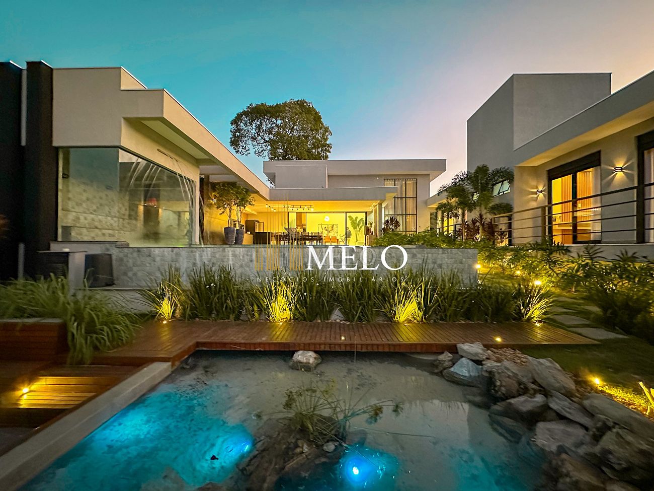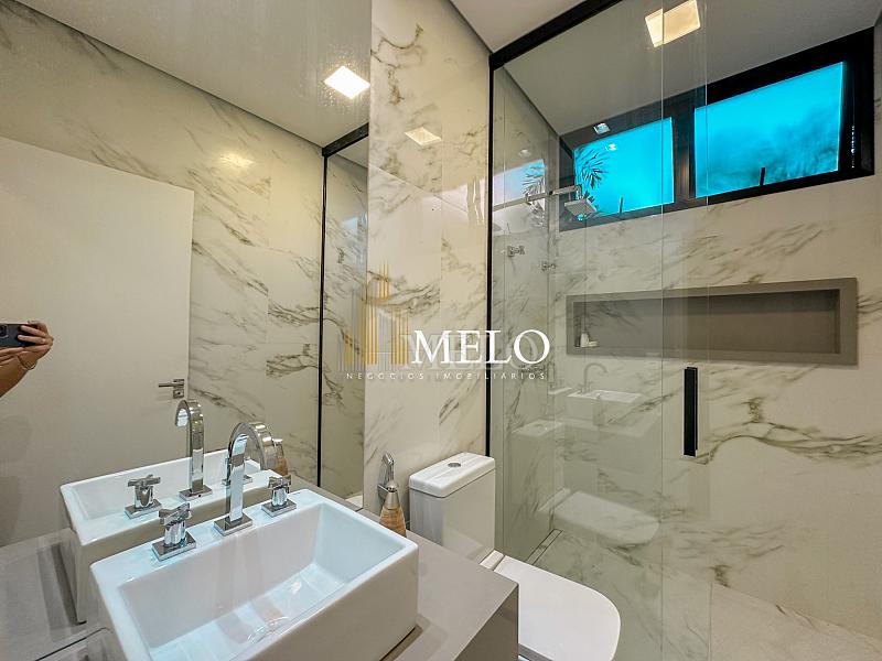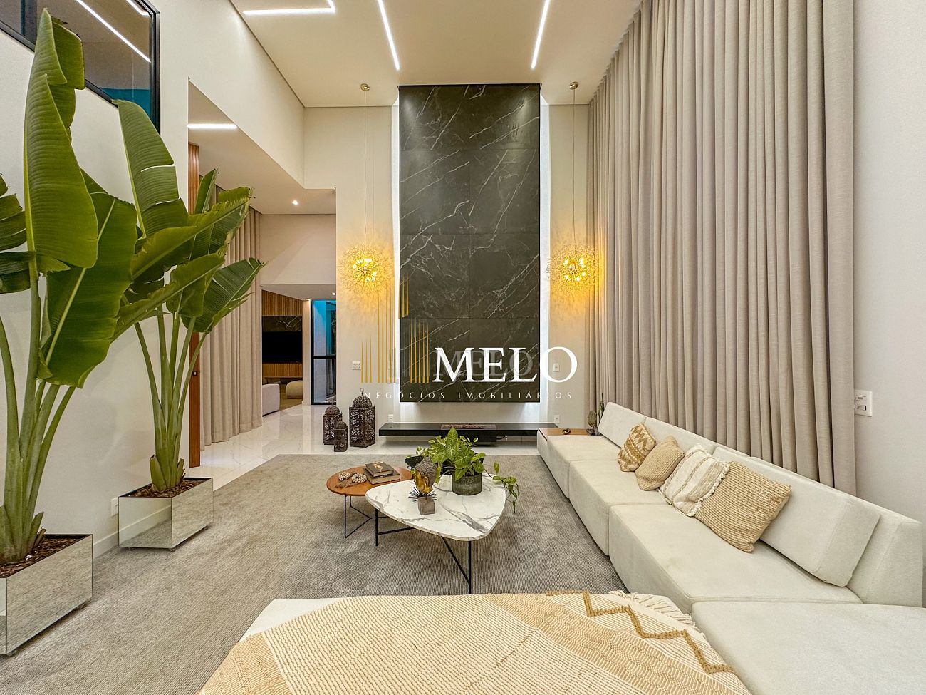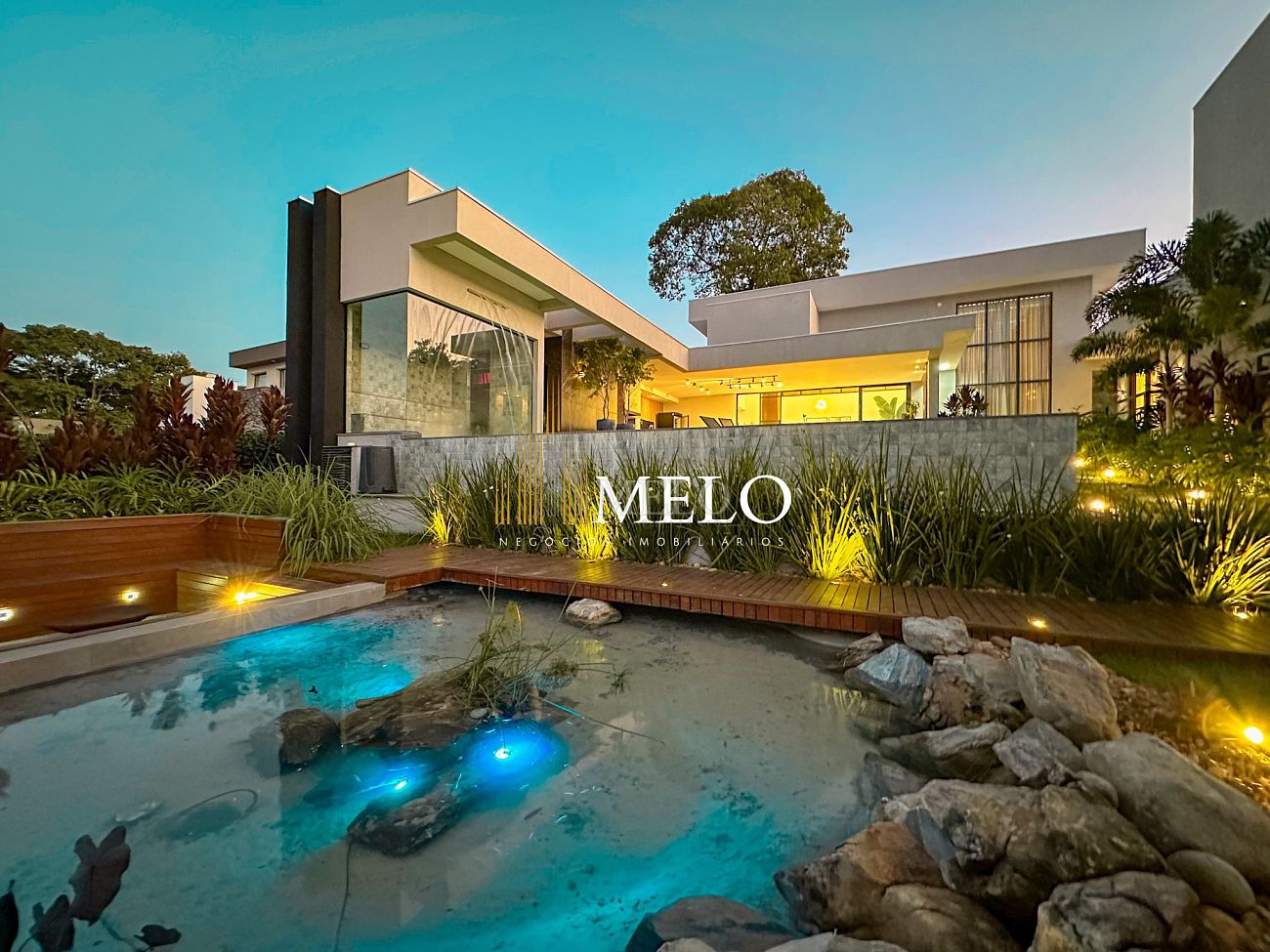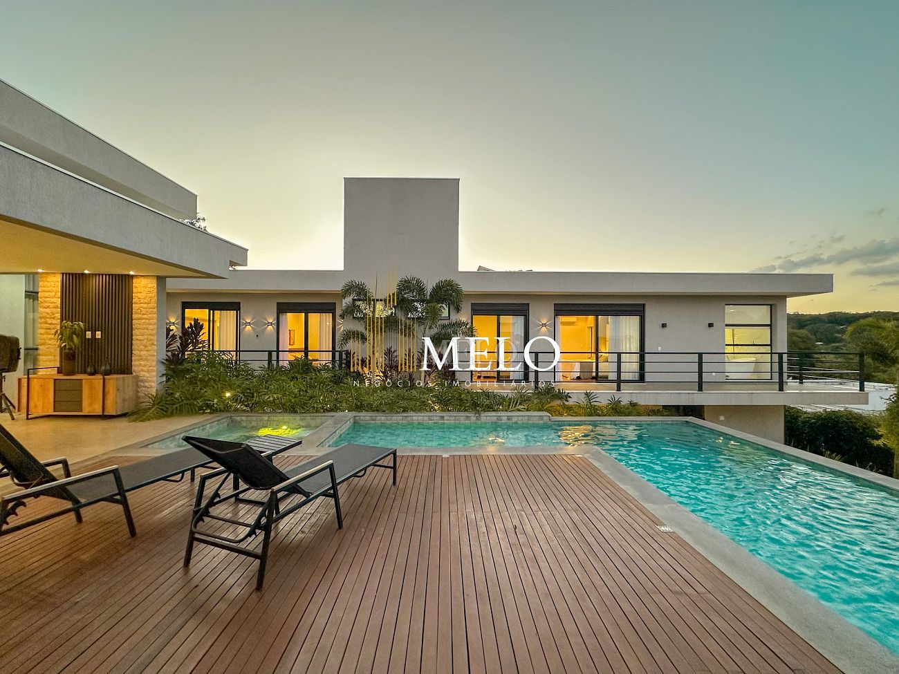Composta por uma sala de estar espaçosa com pé direito duplo, integrada a sala de jantar, sala de TV toda mobiliada, 4 quartos, sendo 4 suítes com closet, DCE completo, cozinha gourmet com armários personalizados com integração a área gourmet. Externo composto por área gourmet com piscina, sauna, lavabo, lago de carpas com balanço, fogo de chão e quarto de adega.