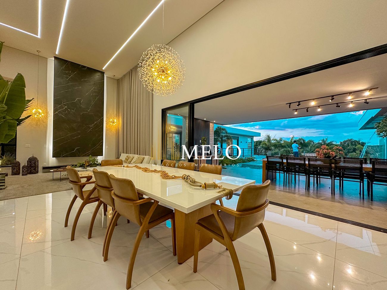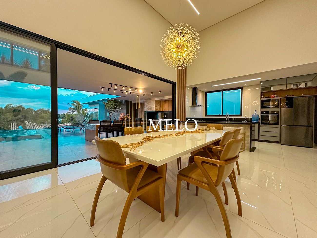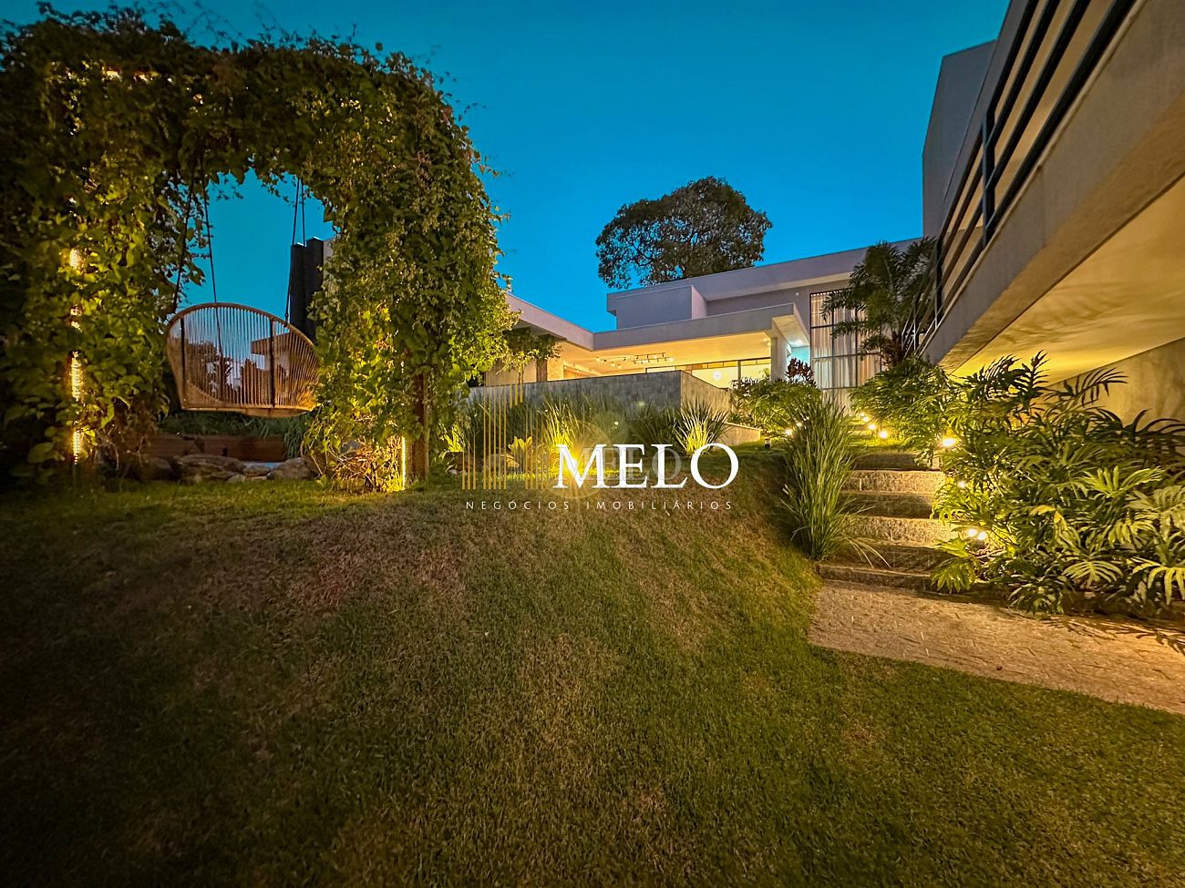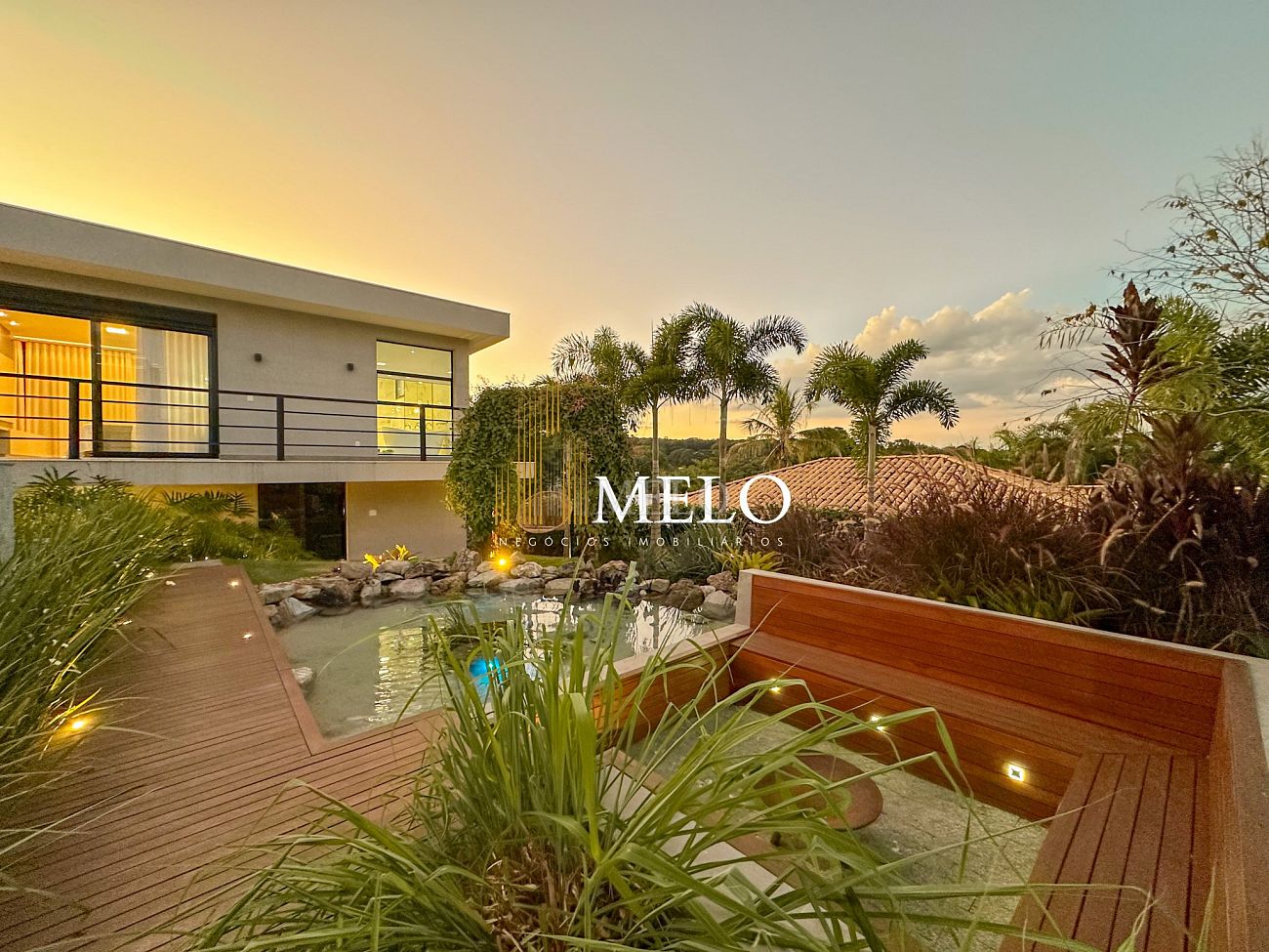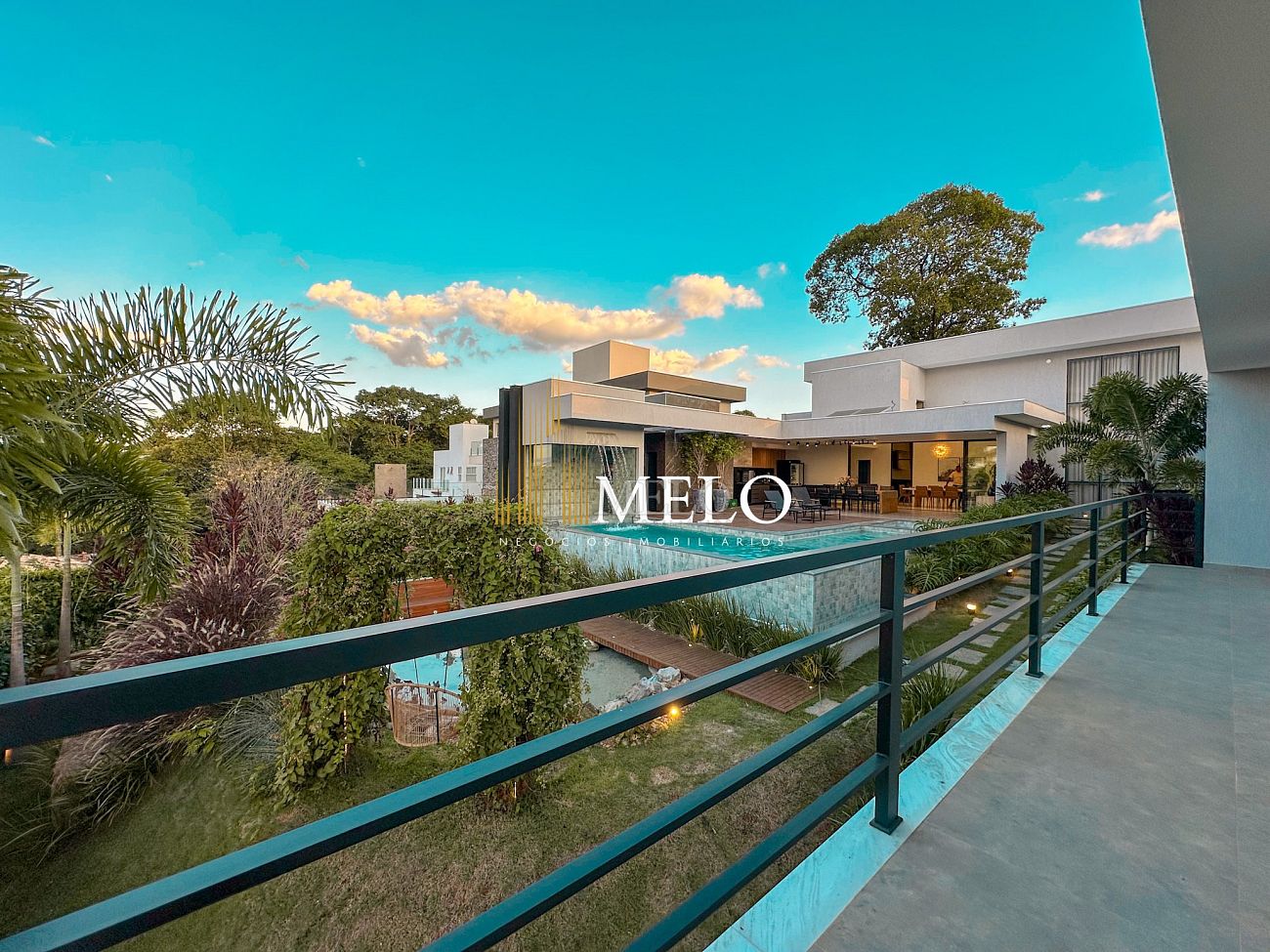 Composta por uma sala de estar espaçosa com pé direito duplo, integrada a sala de jantar, sala de TV toda mobiliada, 4 quartos, sendo 4 suítes com closet, DCE completo, cozinha gourmet com armários personalizados com integração a área gourmet. Externo composto por área gourmet com piscina, sauna, lavabo, lago de carpas com balanço, fogo de chão e quarto de adega.