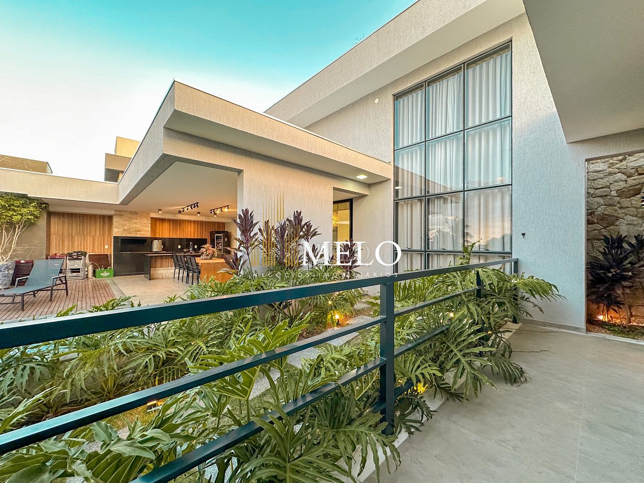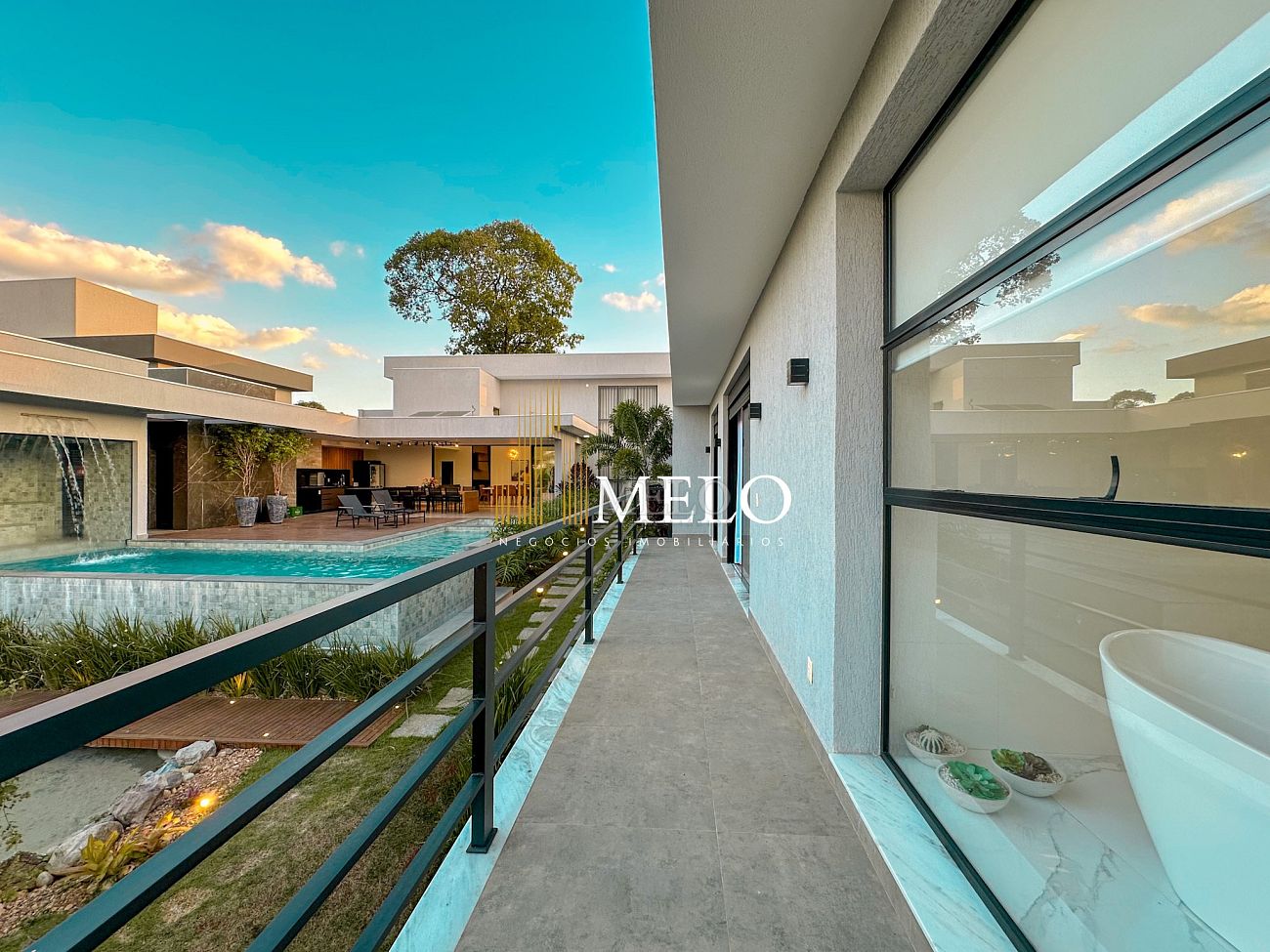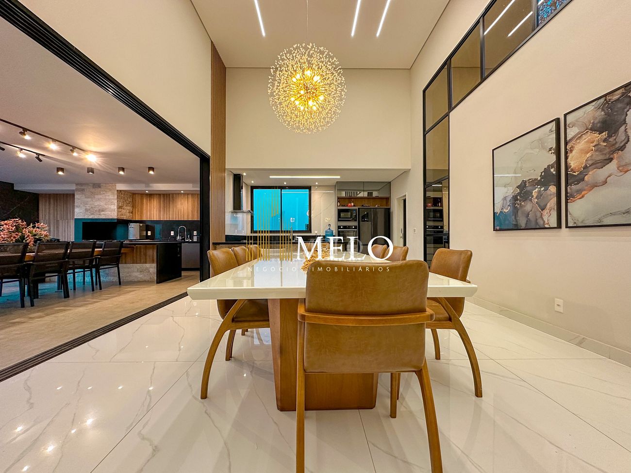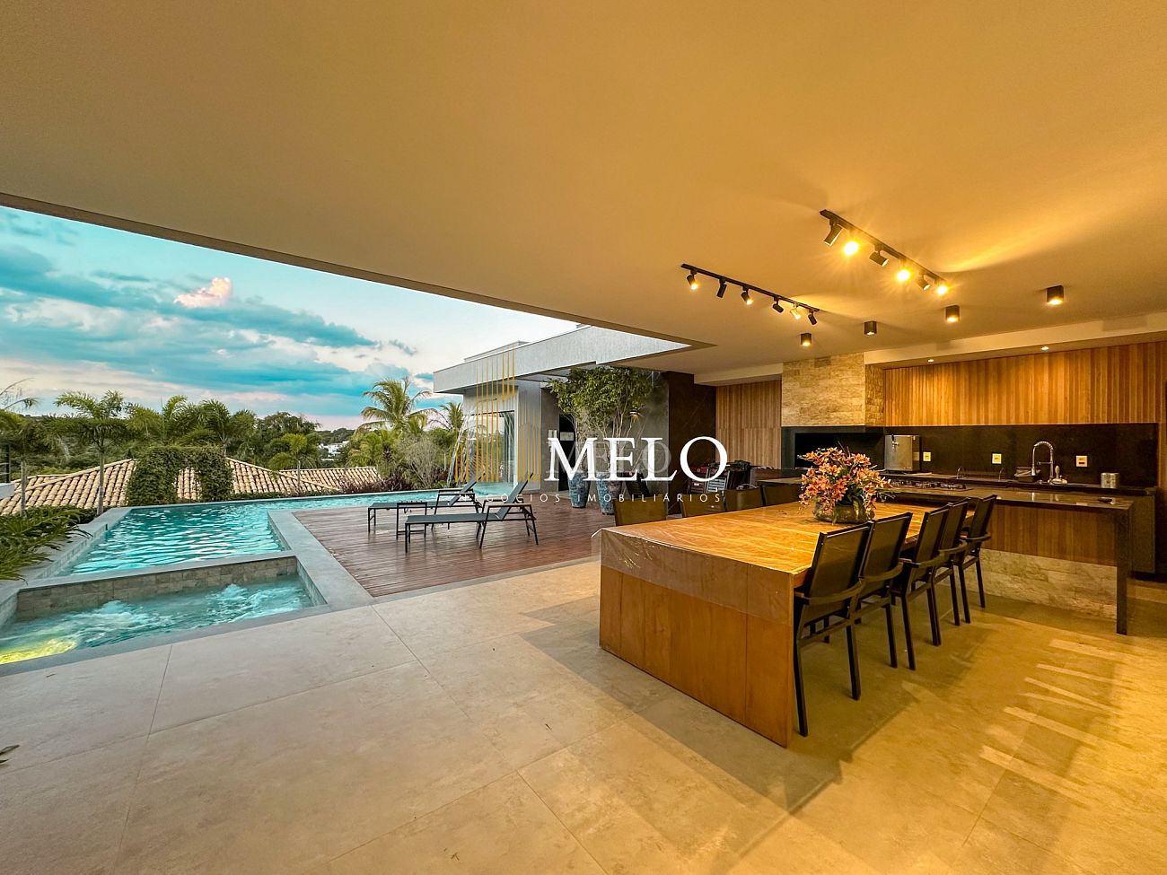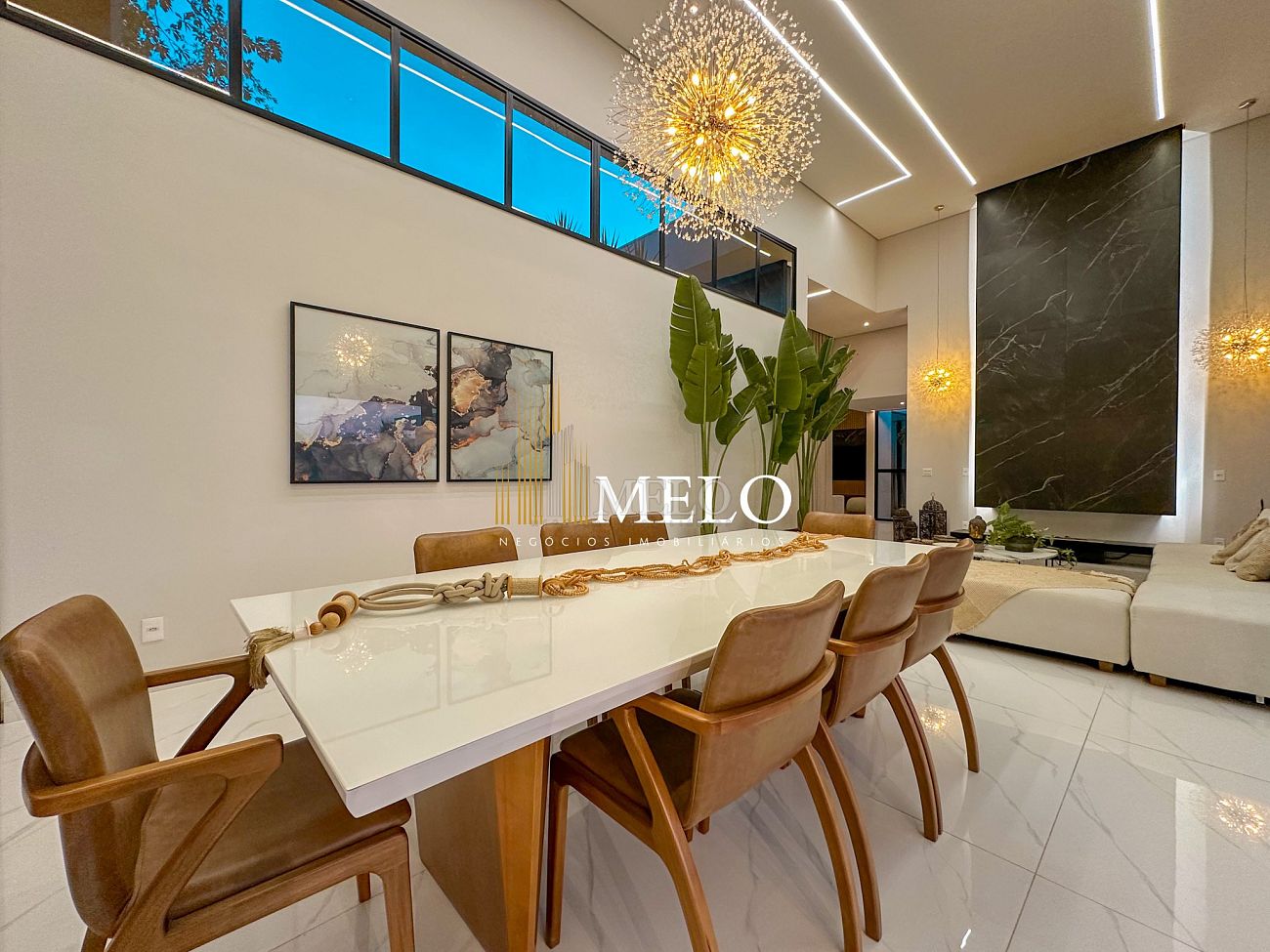 Composta por uma sala de estar espaçosa com pé direito duplo, integrada a sala de jantar, sala de TV toda mobiliada, 4 quartos, sendo 4 suítes com closet, DCE completo, cozinha gourmet com armários personalizados com integração a área gourmet. Externo composto por área gourmet com piscina, sauna, lavabo, lago de carpas com balanço, fogo de chão e quarto de adega.