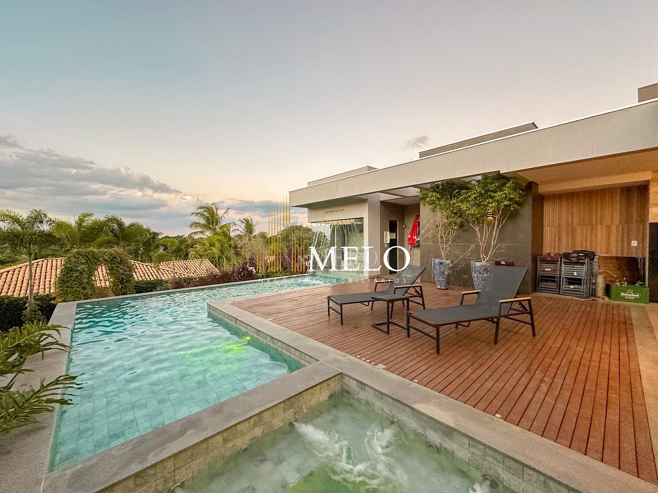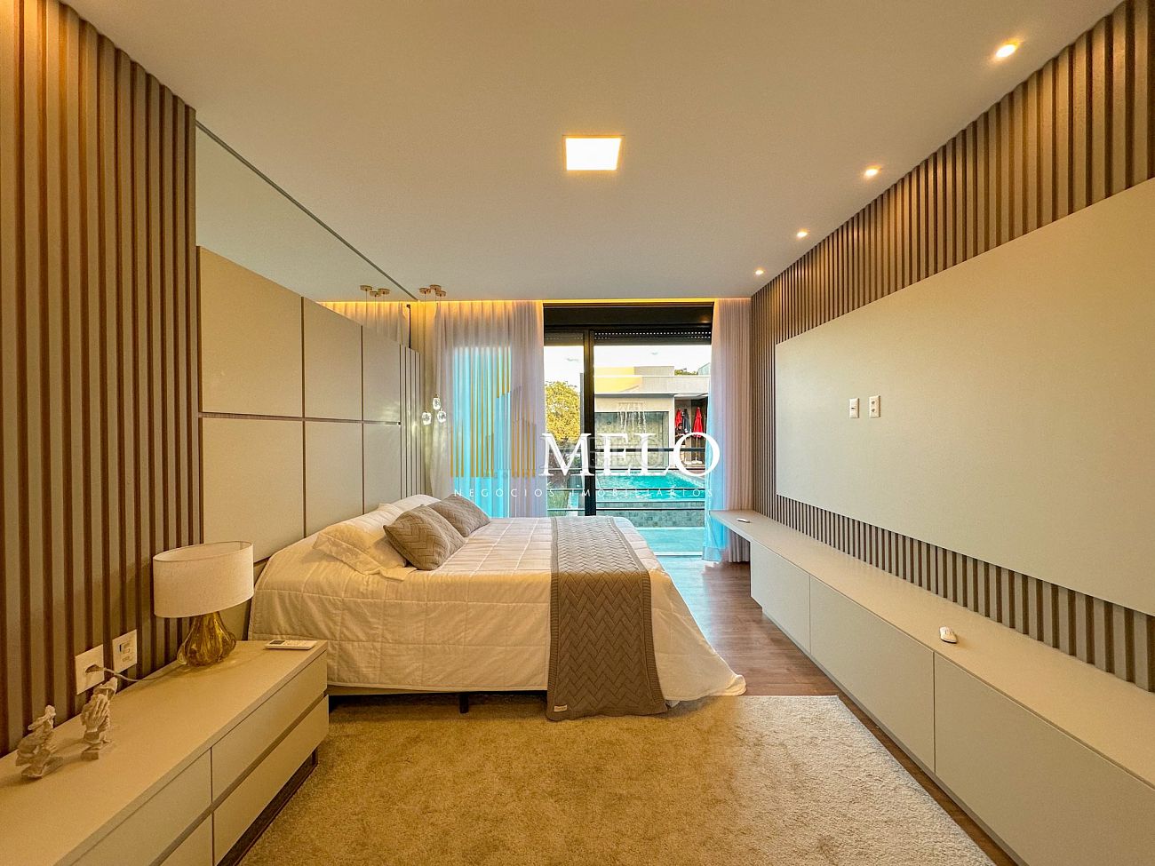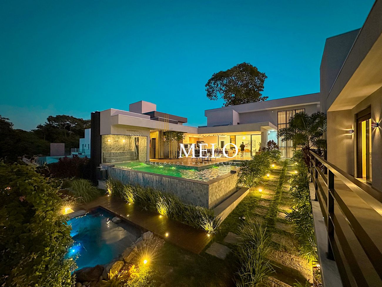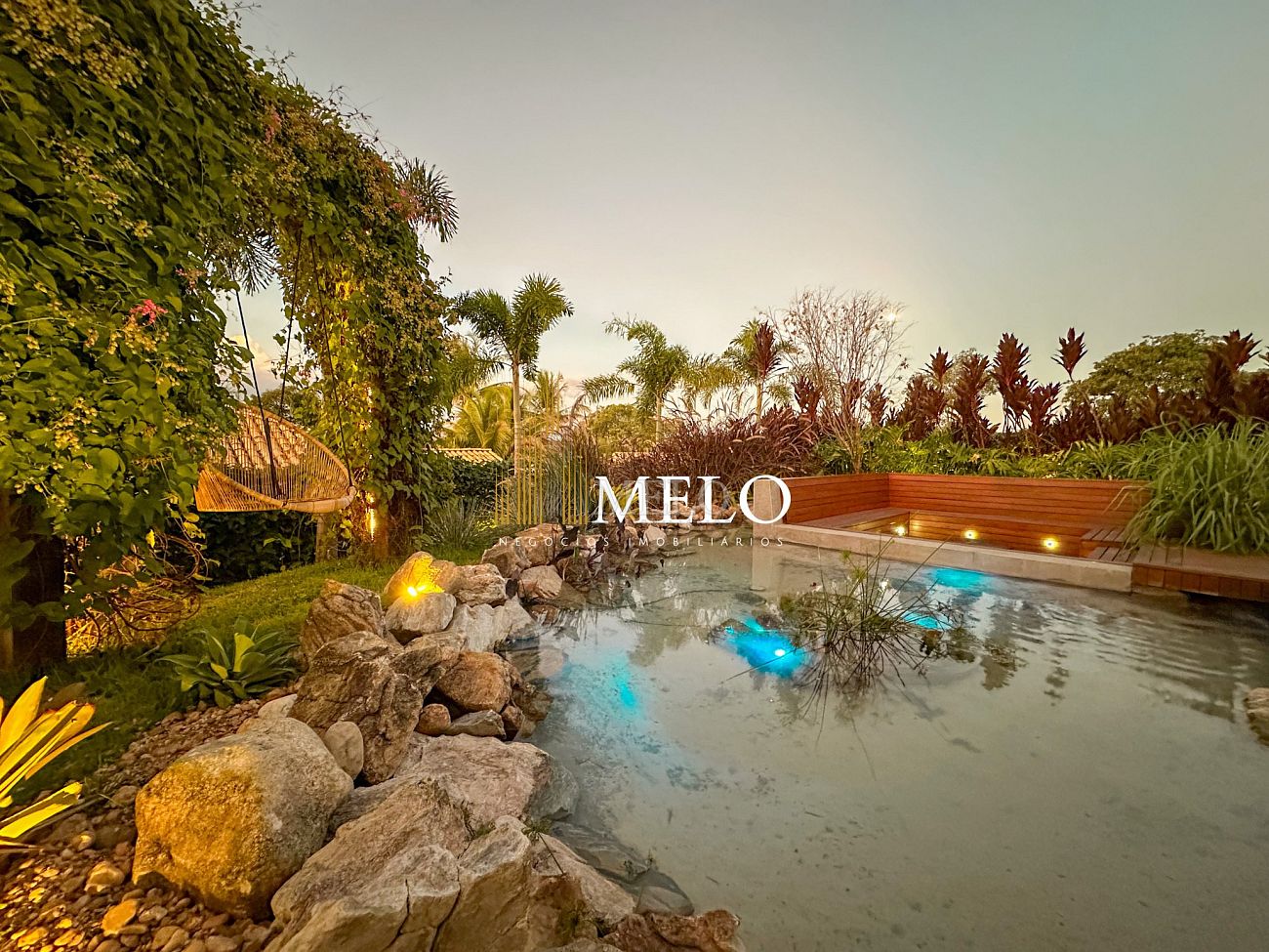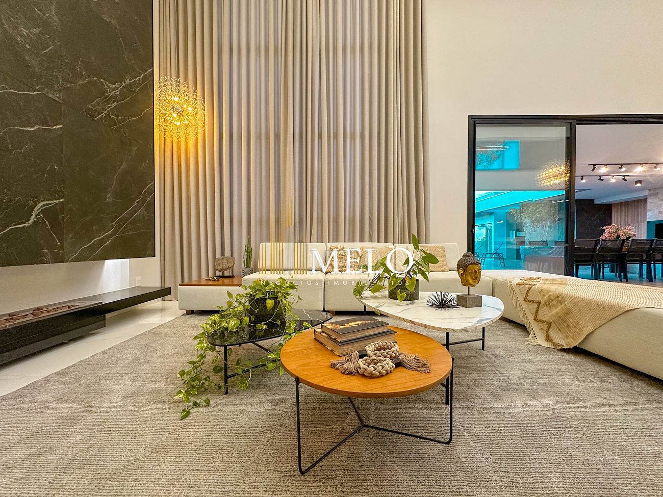 Composta por uma sala de estar espaçosa com pé direito duplo, integrada a sala de jantar, sala de TV toda mobiliada, 4 quartos, sendo 4 suítes com closet, DCE completo, cozinha gourmet com armários personalizados com integração a área gourmet. Externo composto por área gourmet com piscina, sauna, lavabo, lago de carpas com balanço, fogo de chão e quarto de adega.