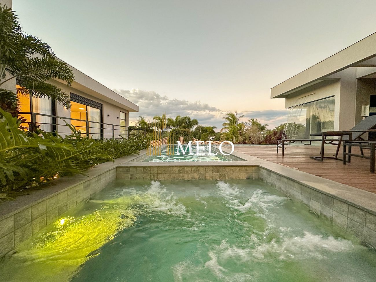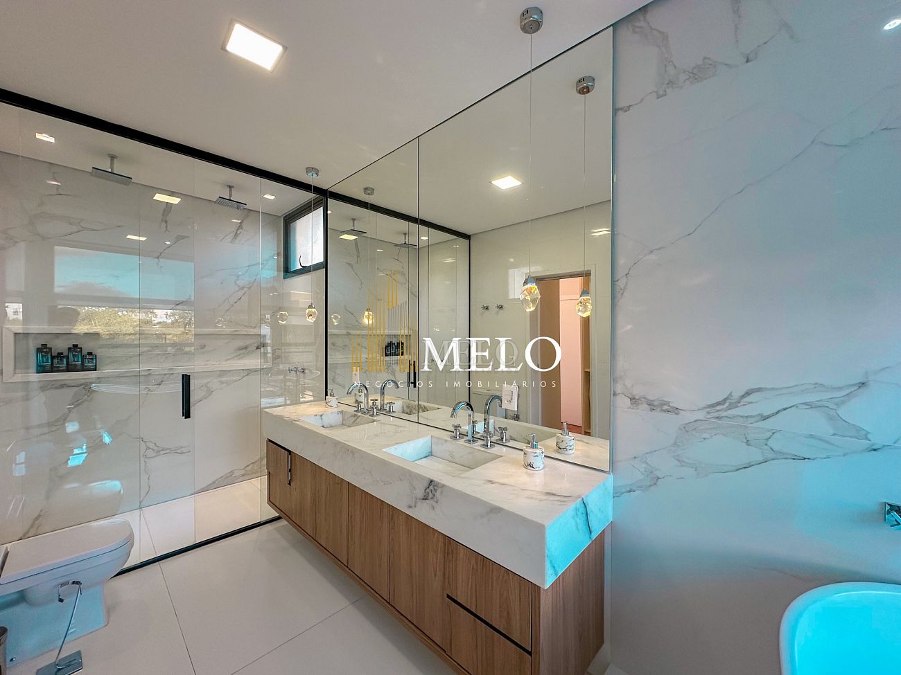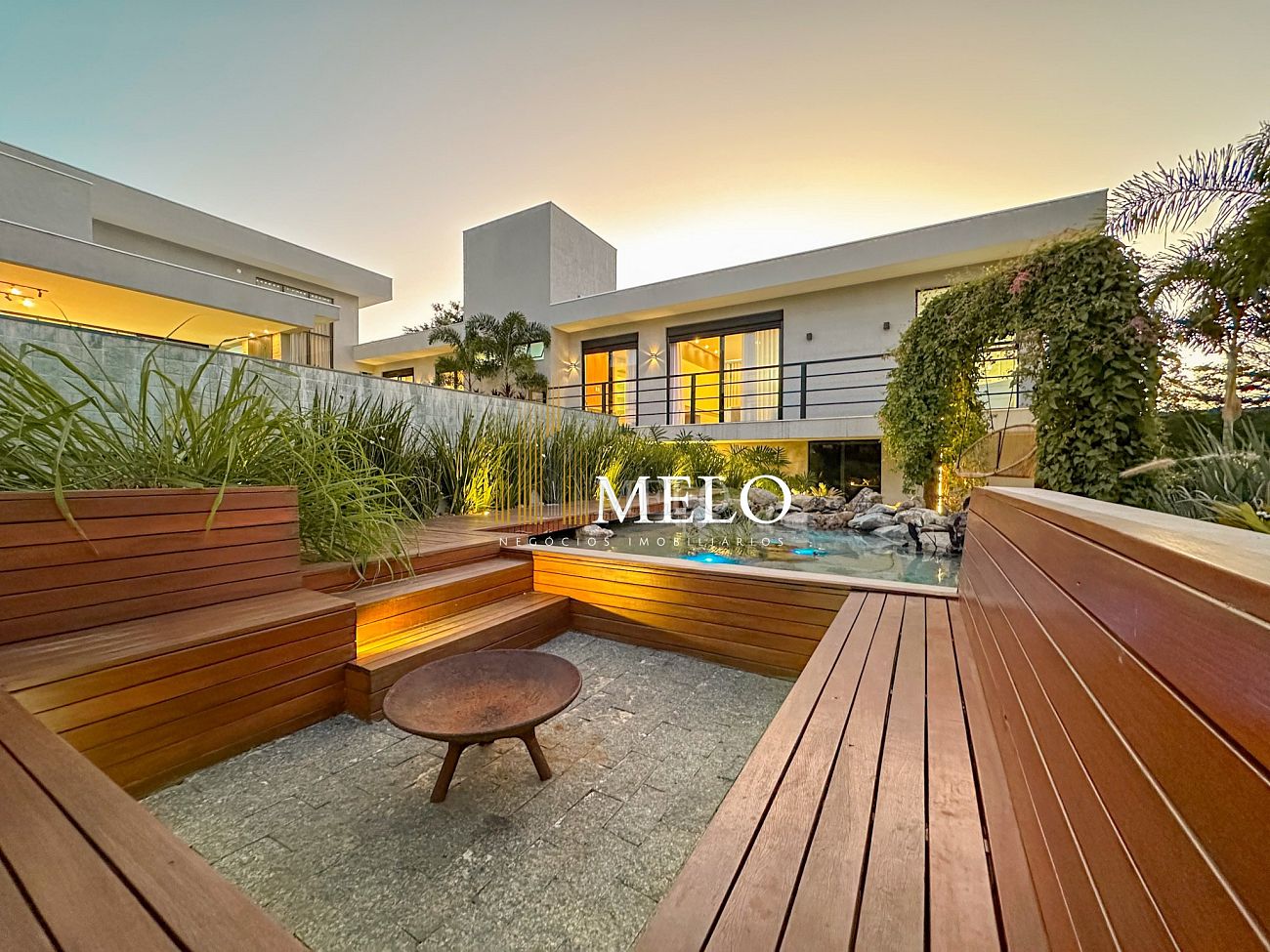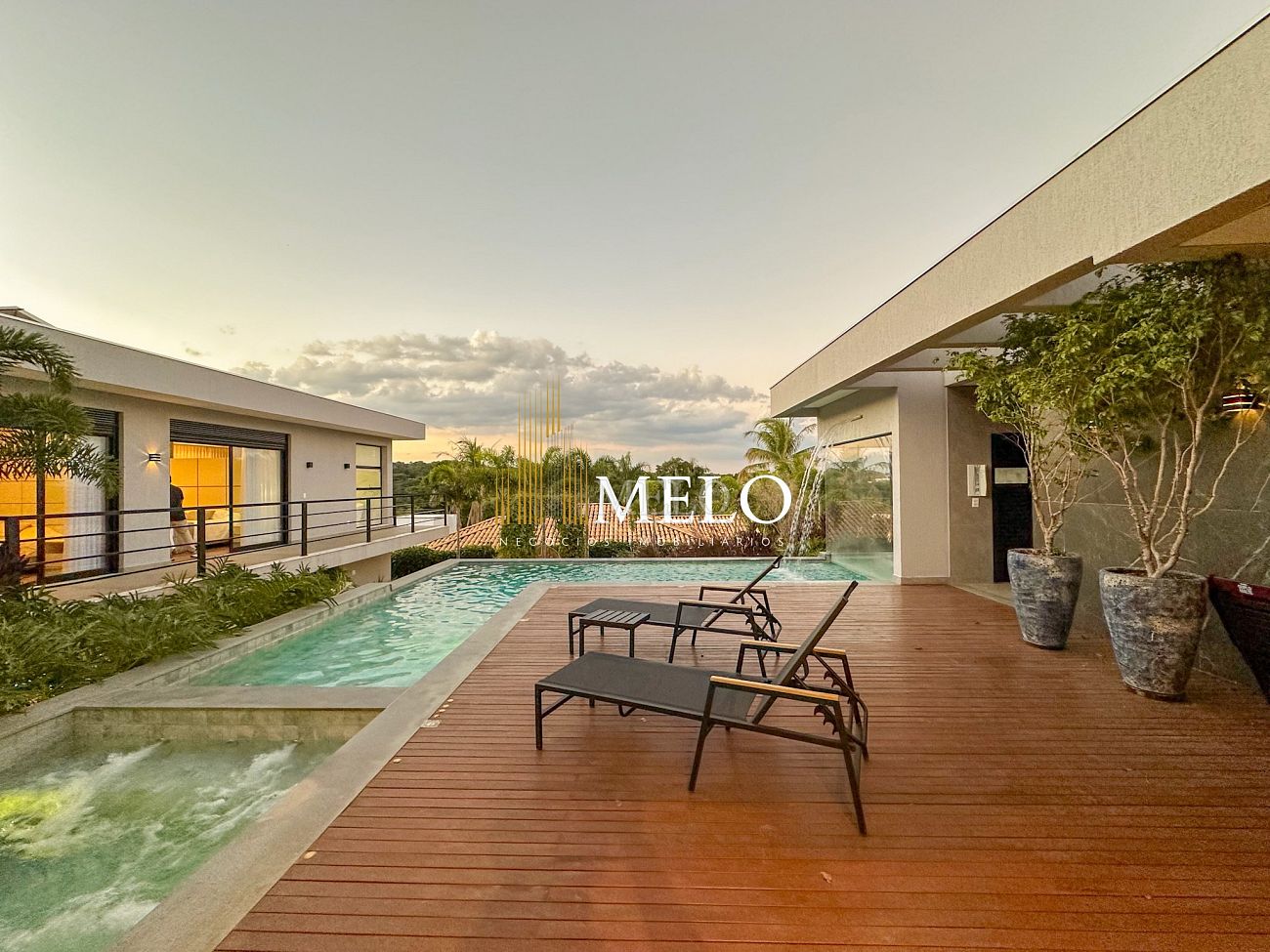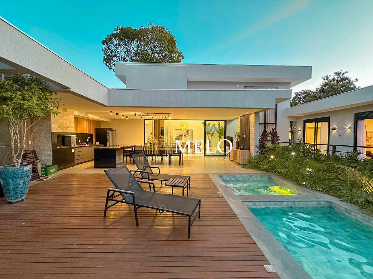 Composta por uma sala de estar espaçosa com pé direito duplo, integrada a sala de jantar, sala de TV toda mobiliada, 4 quartos, sendo 4 suítes com closet, DCE completo, cozinha gourmet com armários personalizados com integração a área gourmet. Externo composto por área gourmet com piscina, sauna, lavabo, lago de carpas com balanço, fogo de chão e quarto de adega.