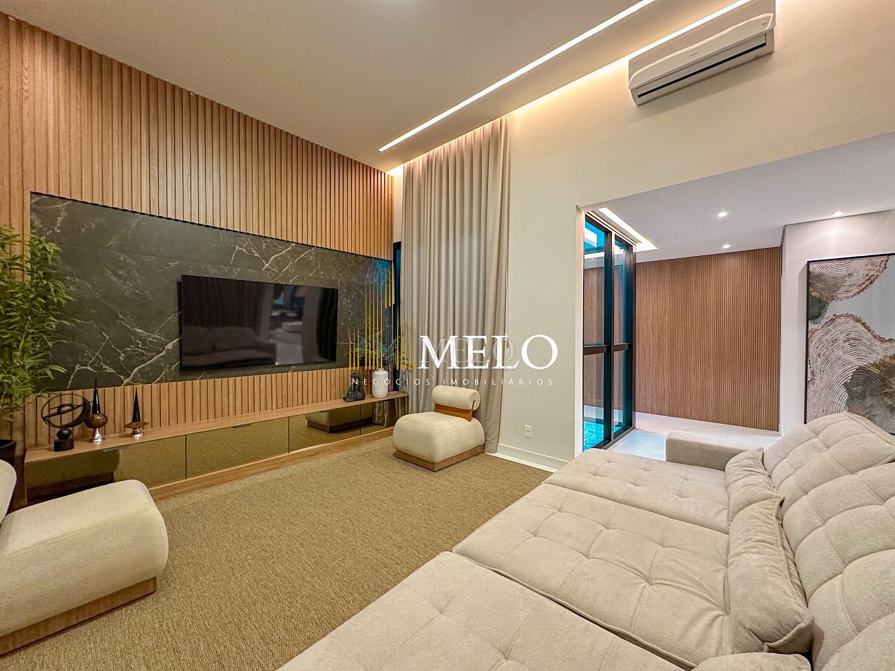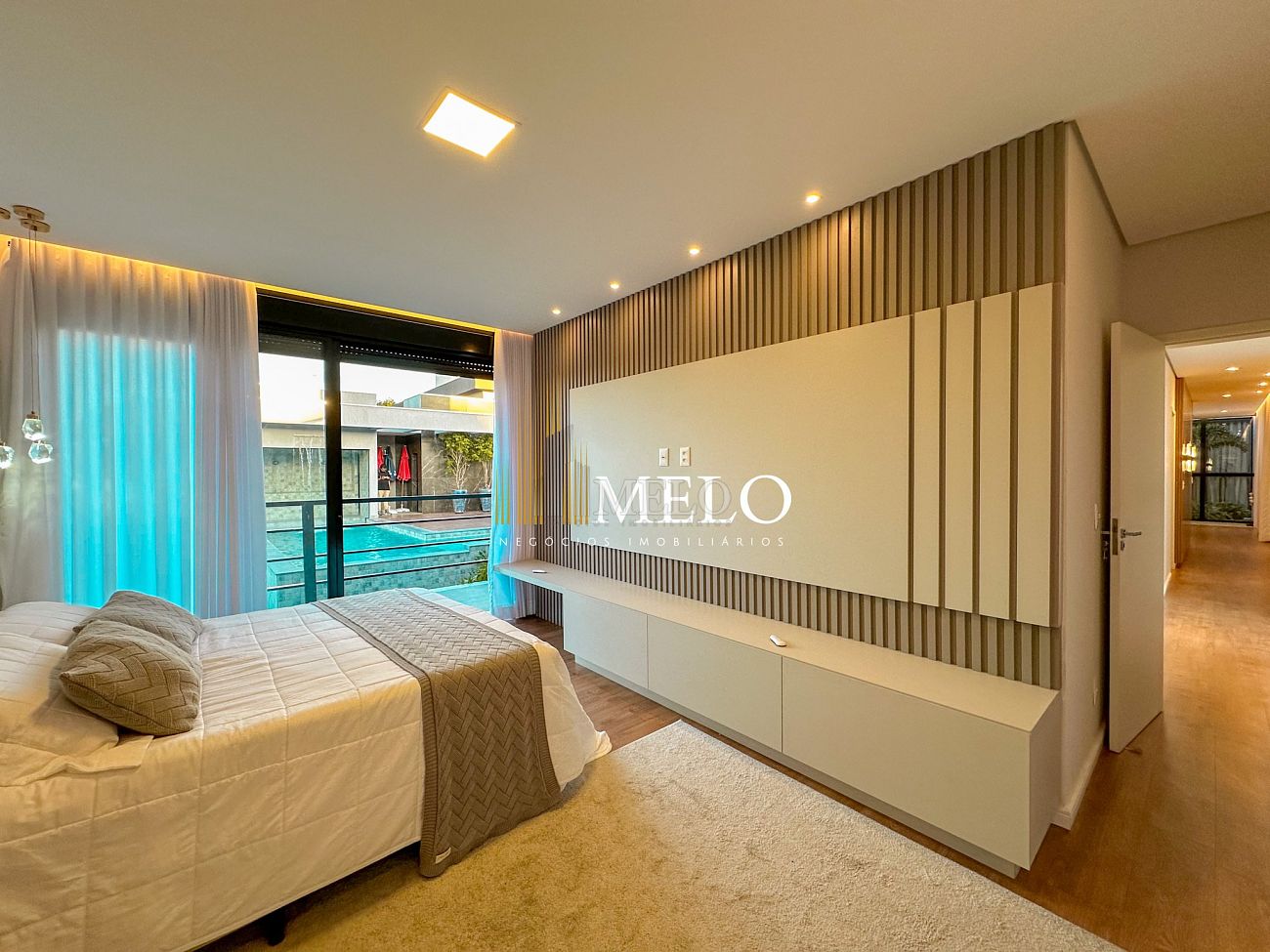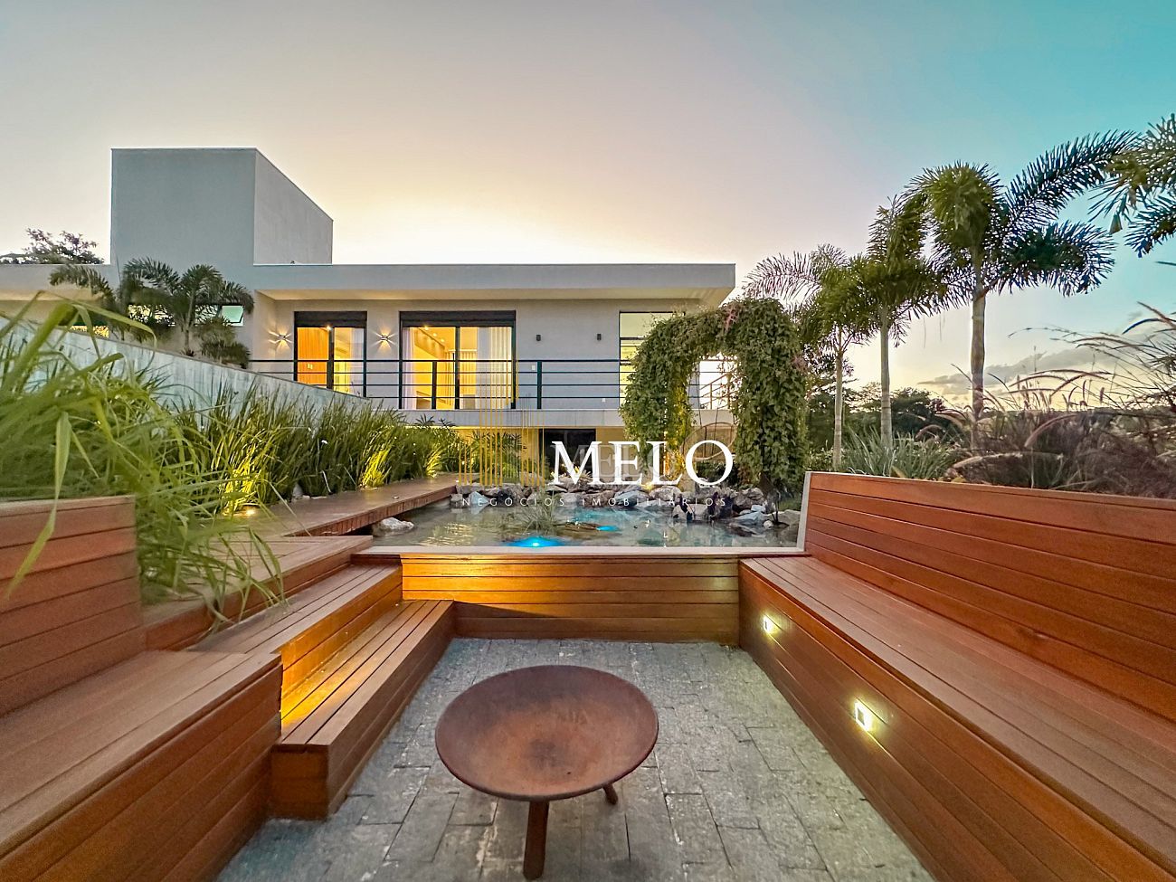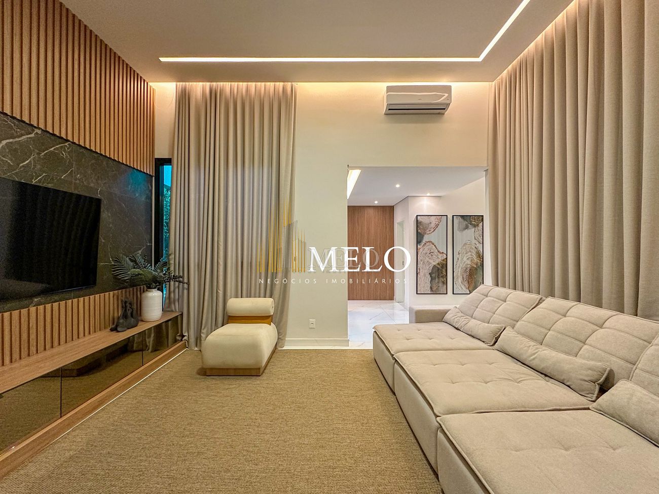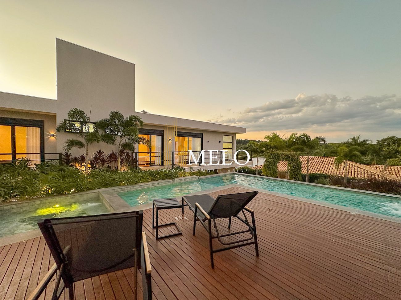 Composta por uma sala de estar espaçosa com pé direito duplo, integrada a sala de jantar, sala de TV toda mobiliada, 4 quartos, sendo 4 suítes com closet, DCE completo, cozinha gourmet com armários personalizados com integração a área gourmet. Externo composto por área gourmet com piscina, sauna, lavabo, lago de carpas com balanço, fogo de chão e quarto de adega.