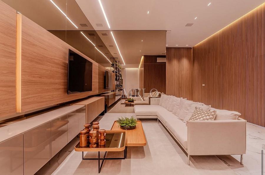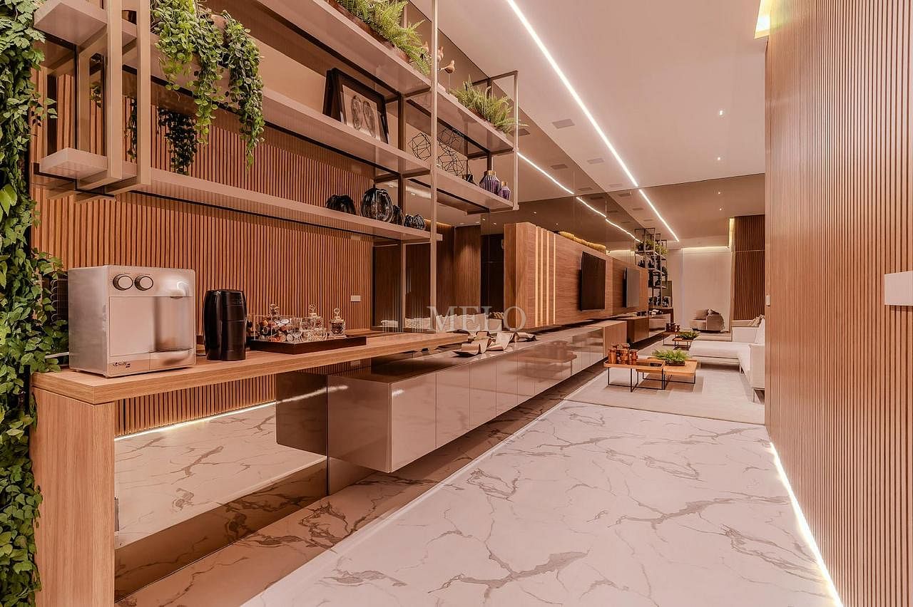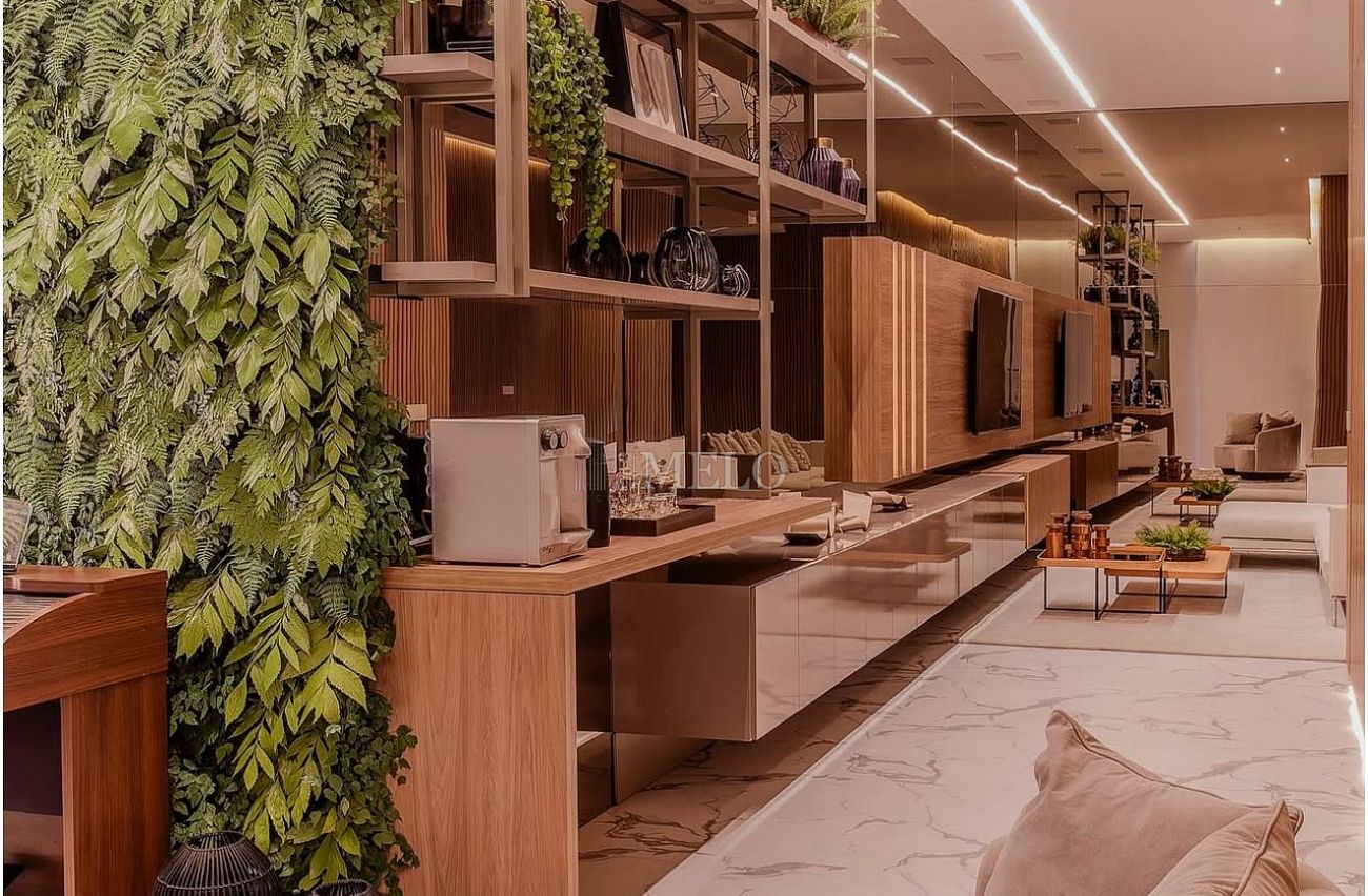 • Acabamentos premium, combinando pedra natural, madeira e iluminação arquitetônica