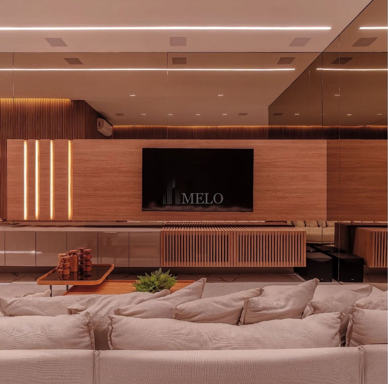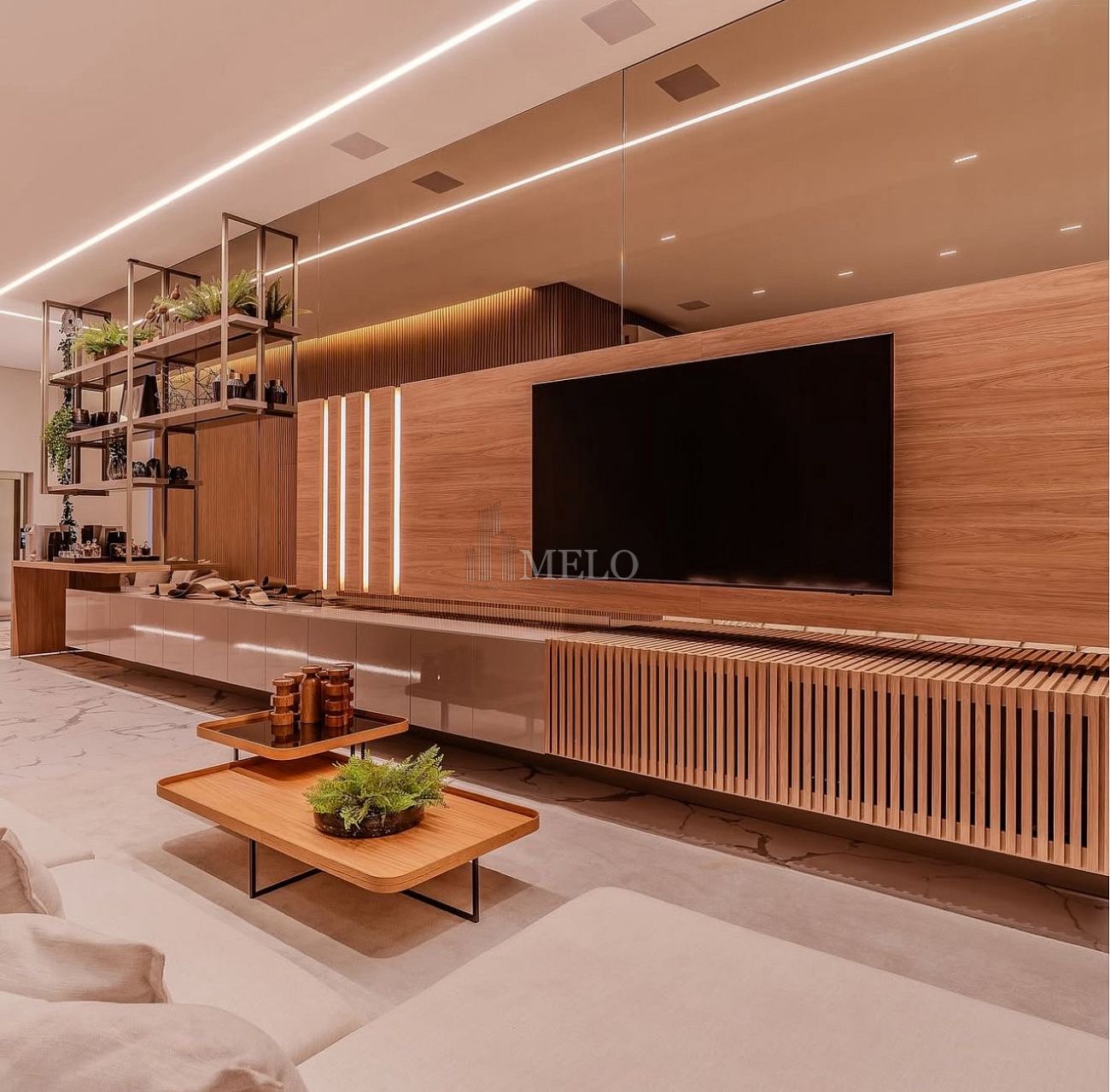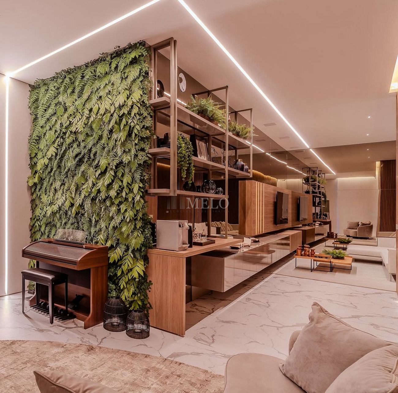 • Acabamentos premium, combinando pedra natural, madeira e iluminação arquitetônica