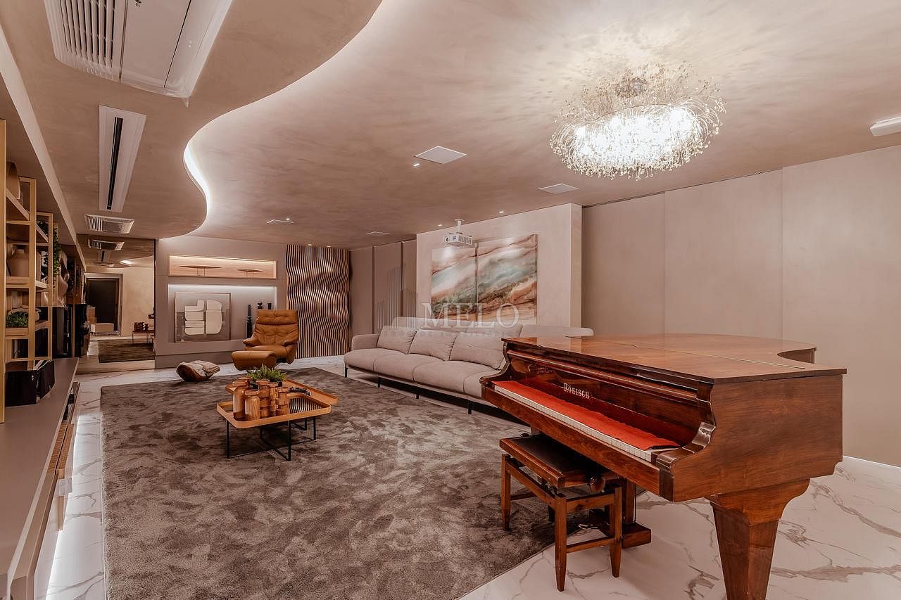 • Sala imponente com pé-direito elevado, integrando ambientes de estar, jantar e convivência
