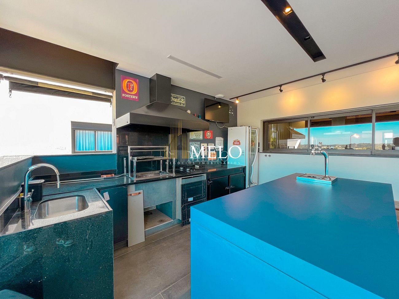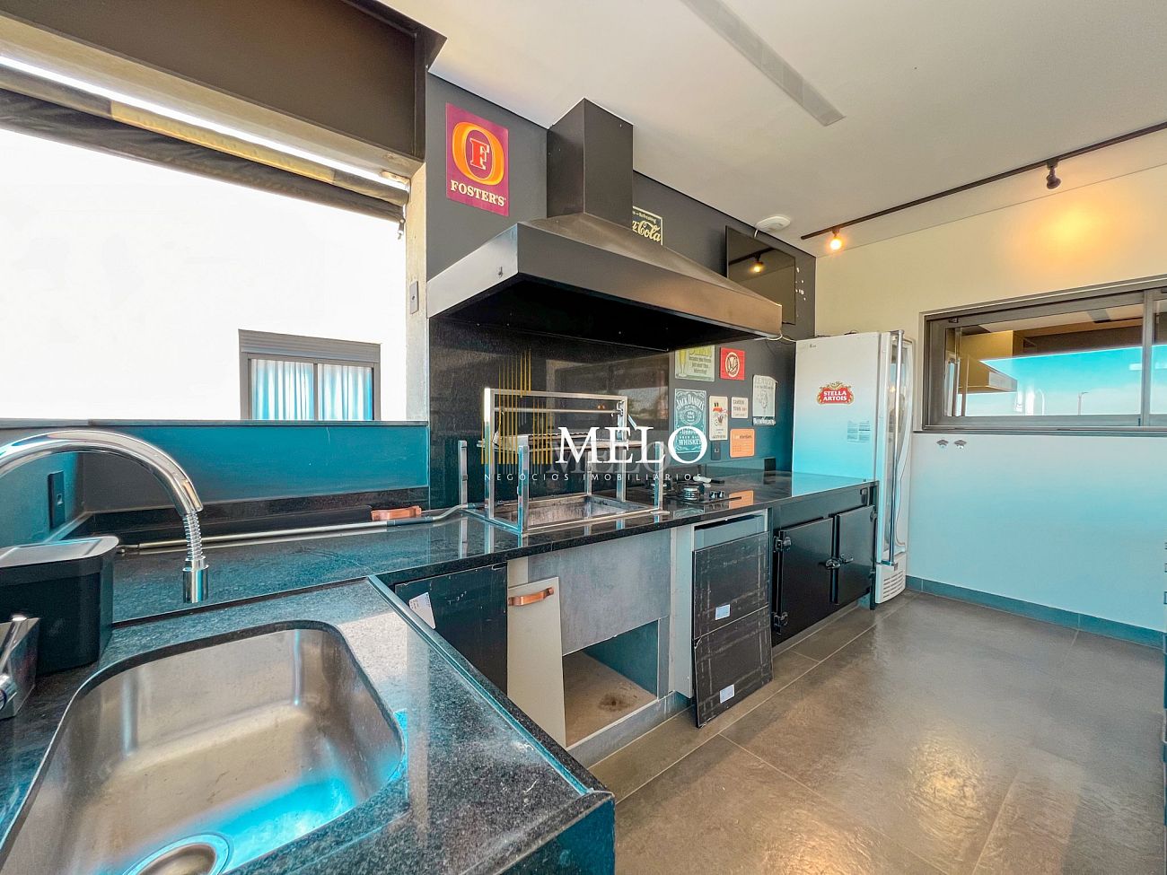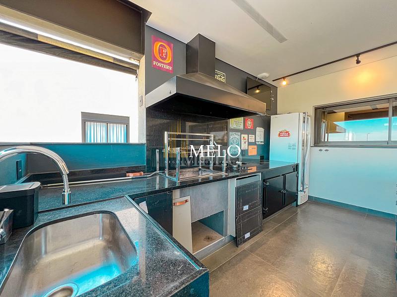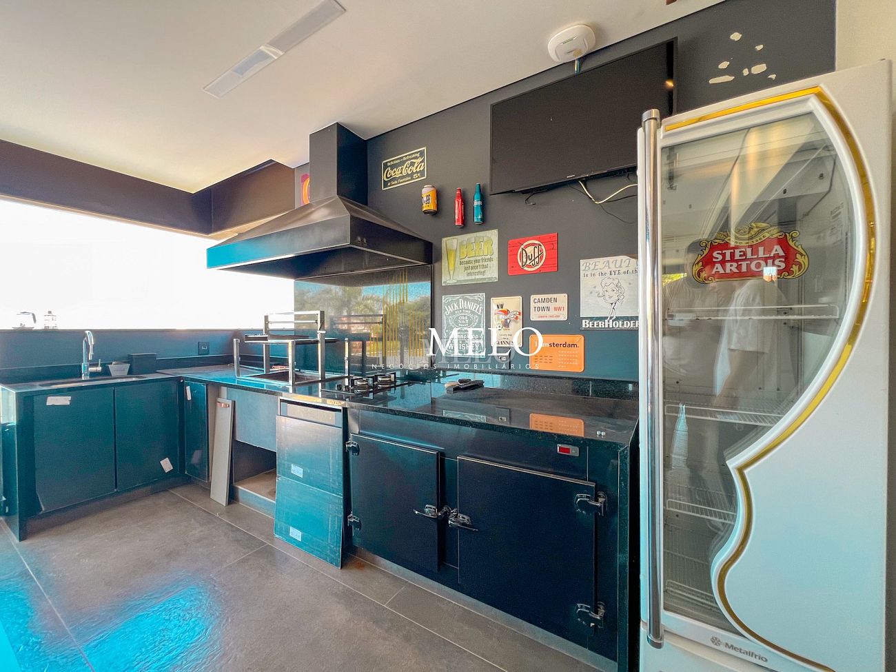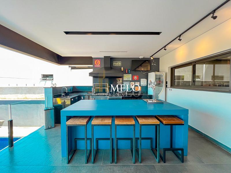 Varanda Gourmet completa com churrasqueira americana e coifa, com bancada em ilha e cooktop, geladeira e chopeira, mesa e bancada de bar com baquetas.