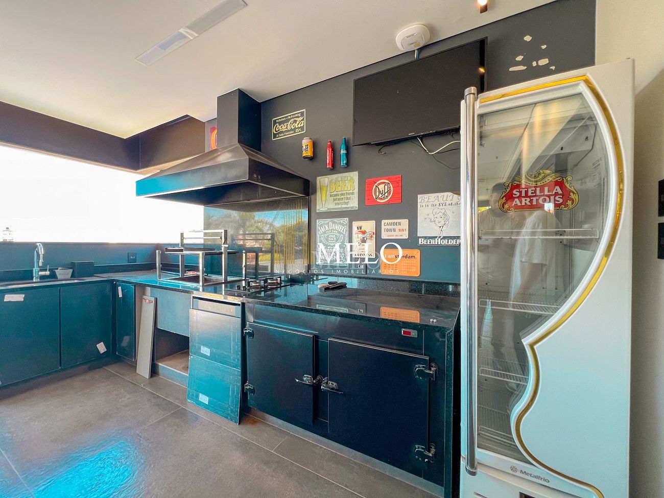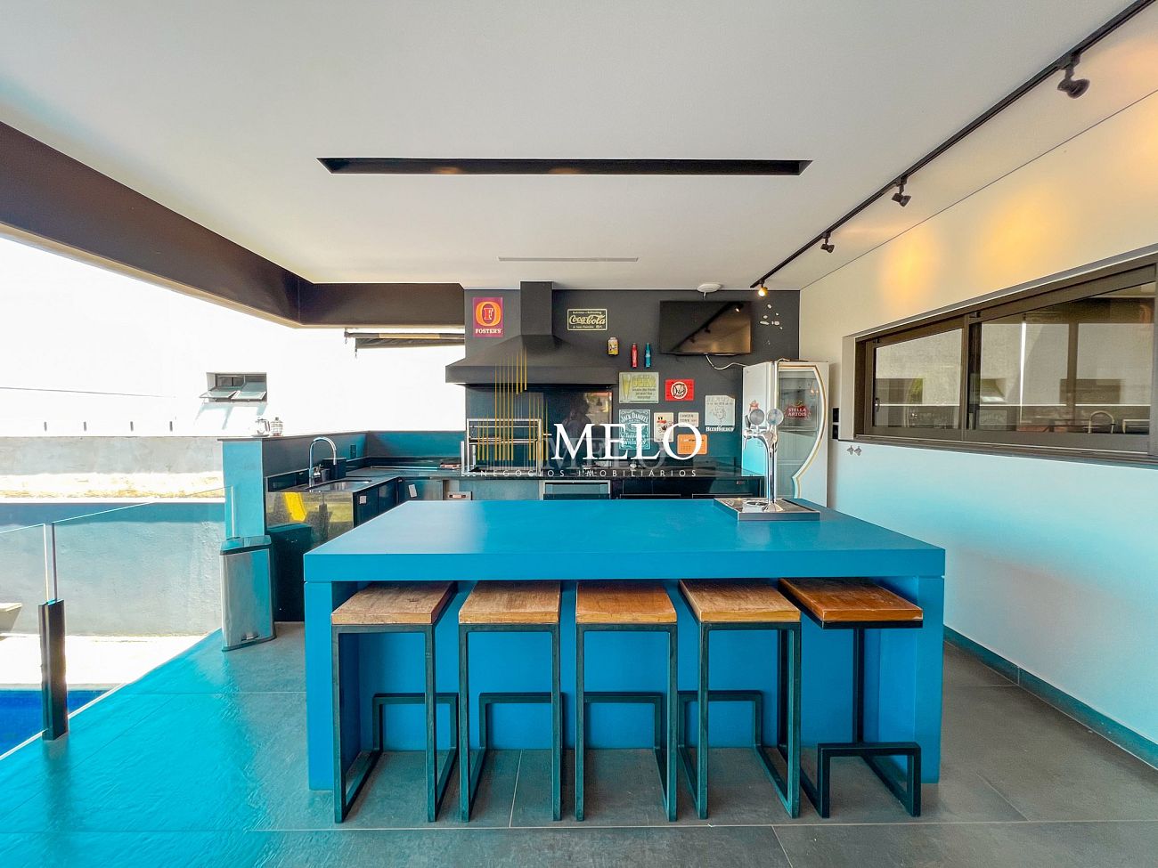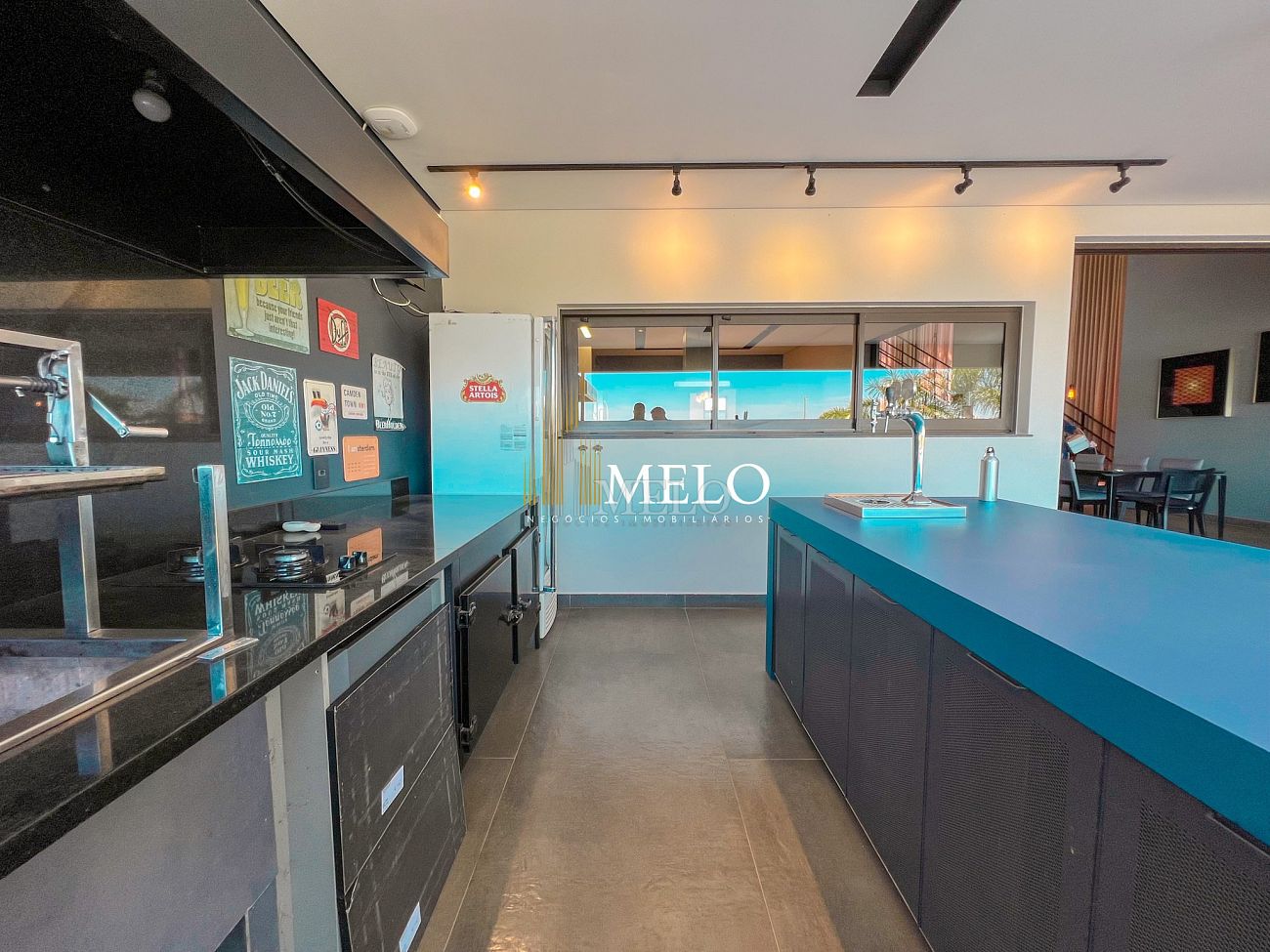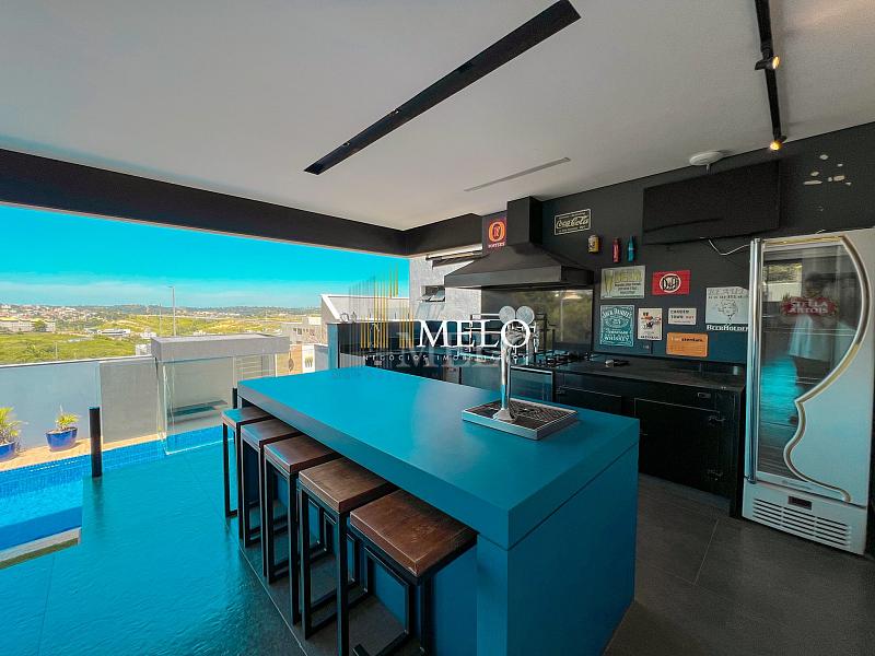 Varanda Gourmet completa com churrasqueira americana e coifa, com bancada em ilha e cooktop, geladeira e chopeira, mesa e bancada de bar com baquetas.