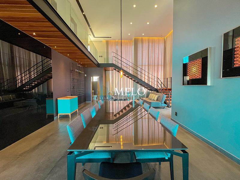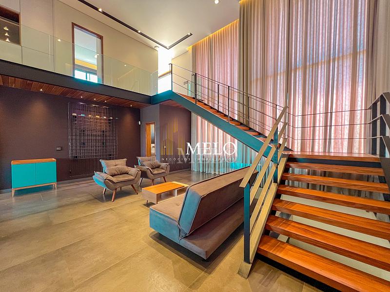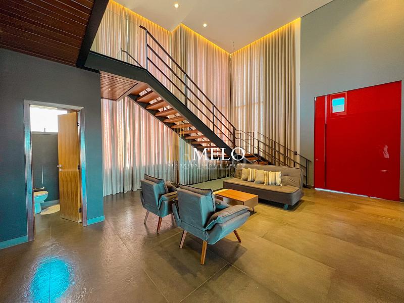Sala ampla com pé direito duplo, com estar e jantar, Mezanino.