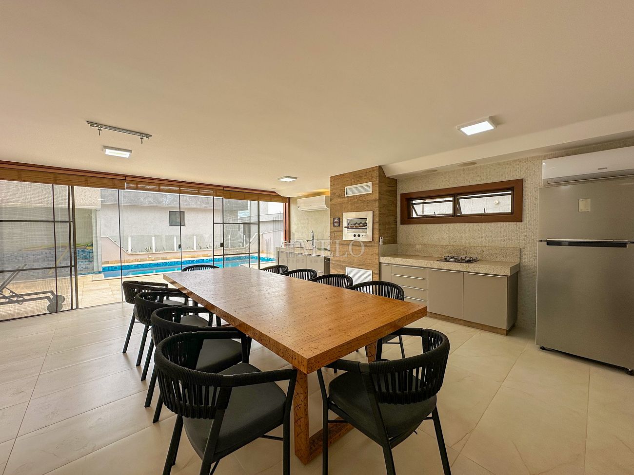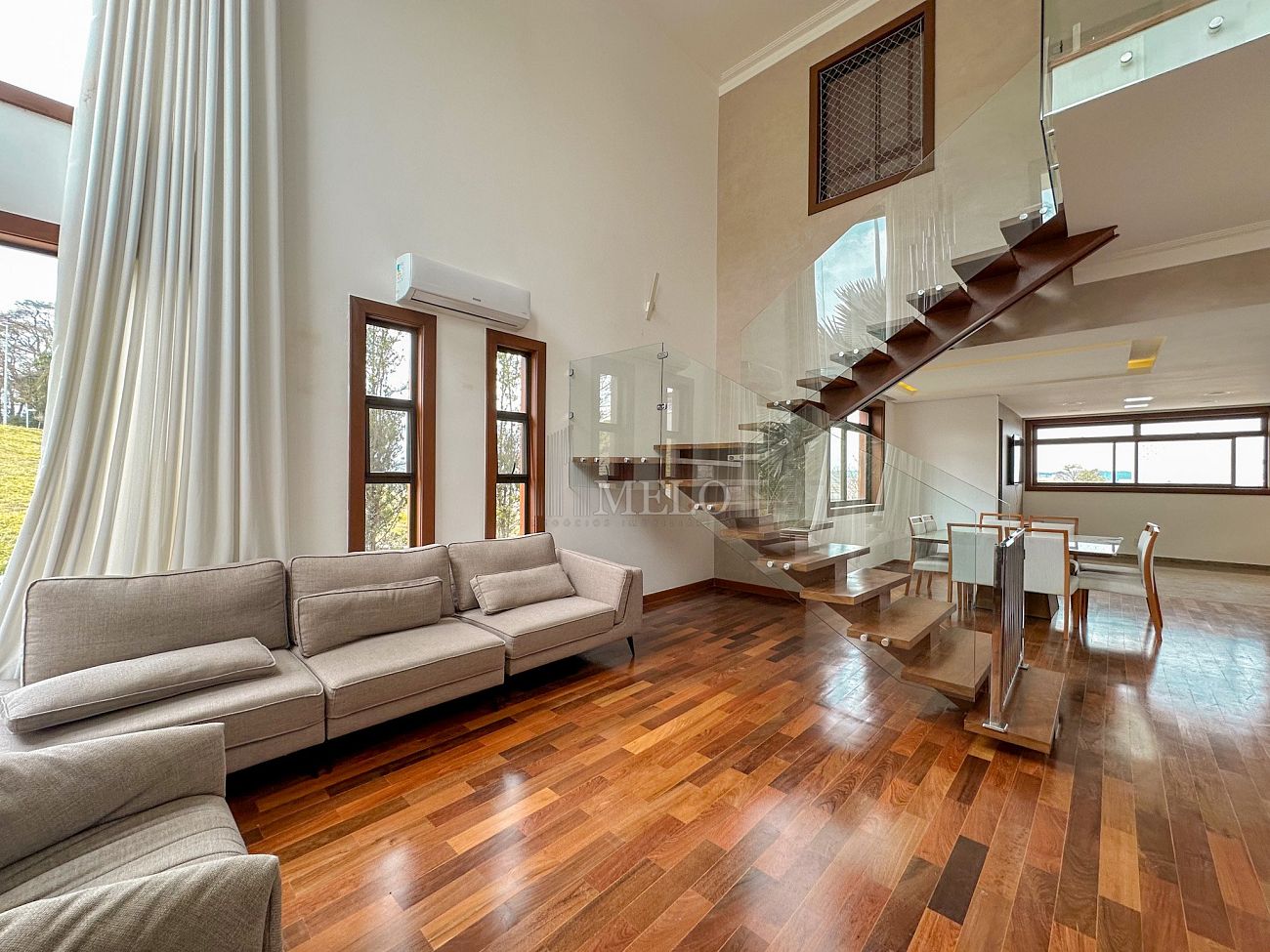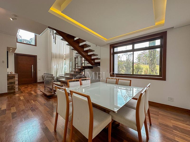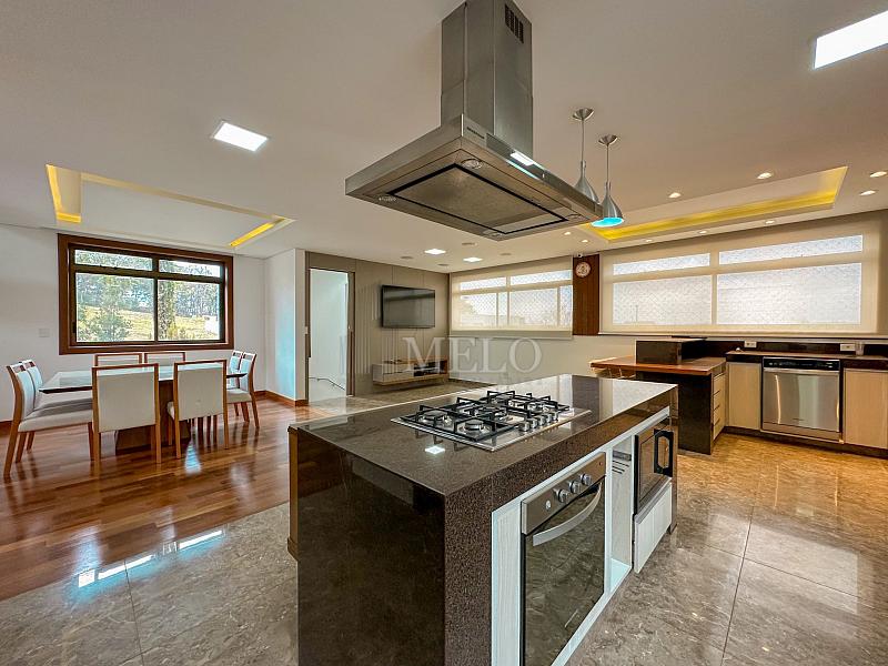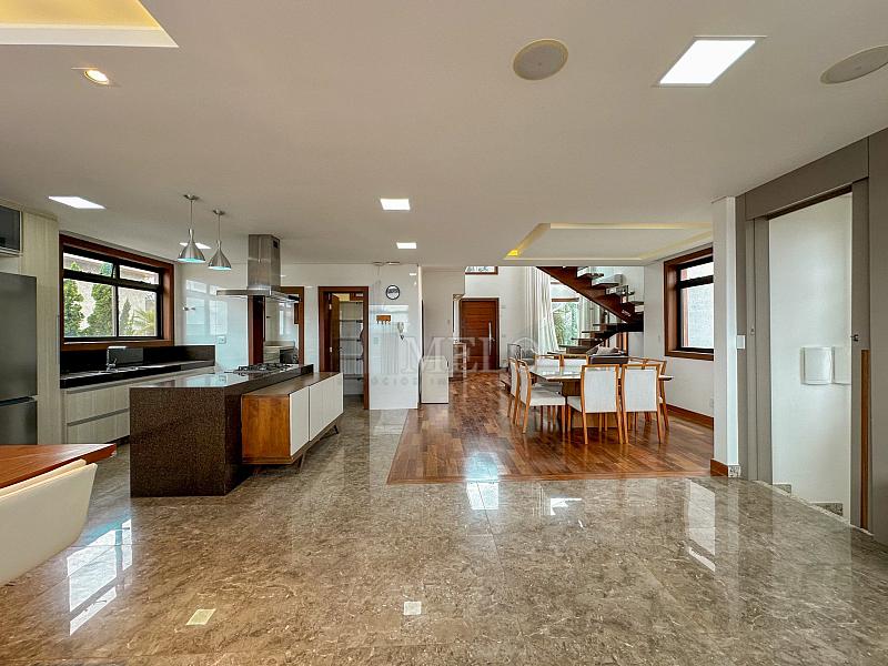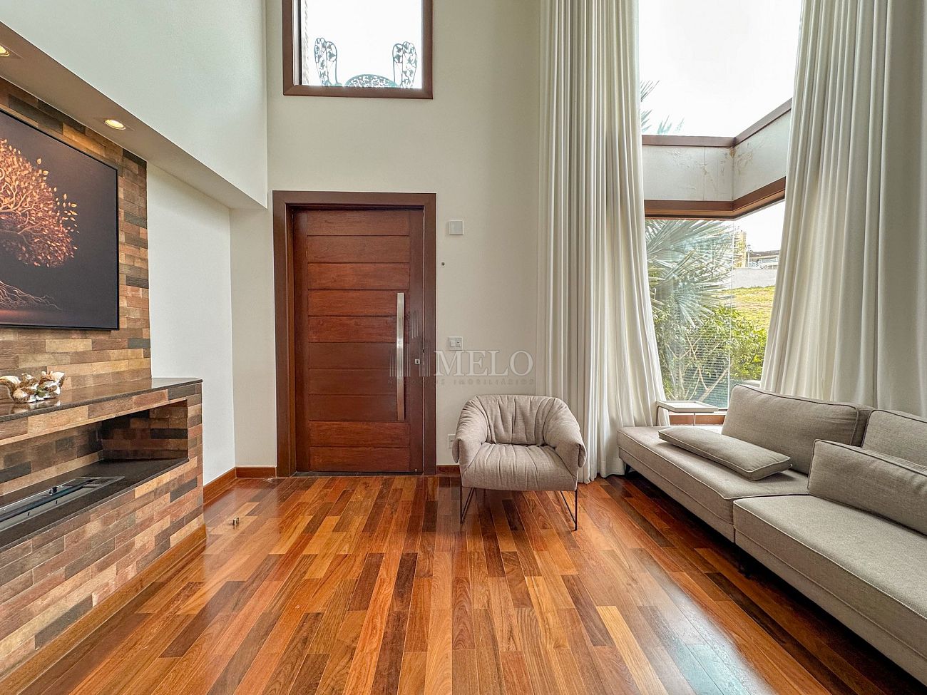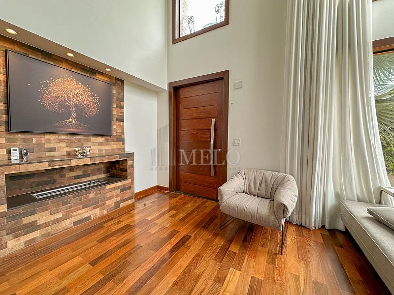 1º pavimento: sala ampla em conceito aberto com pé direito duplo, lareira e lavabo. Cozinha com ilha toda montada, adega, despensa, área de serviço.