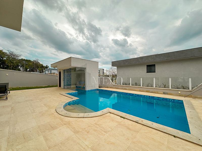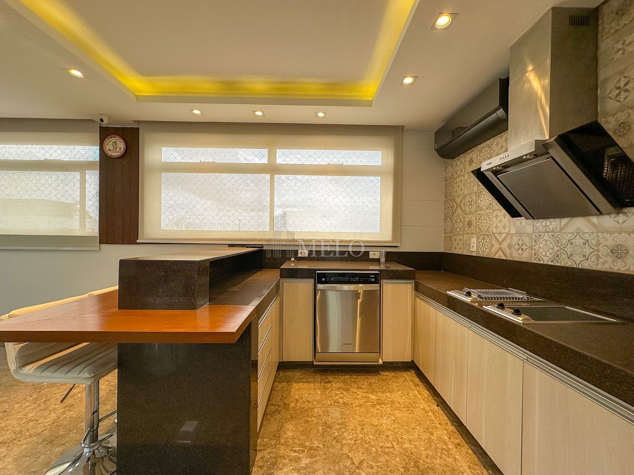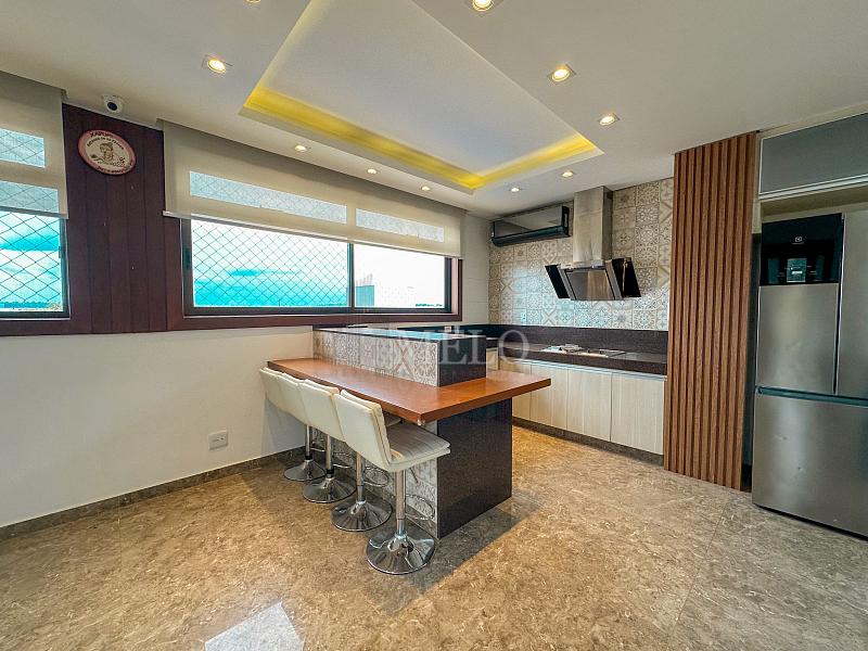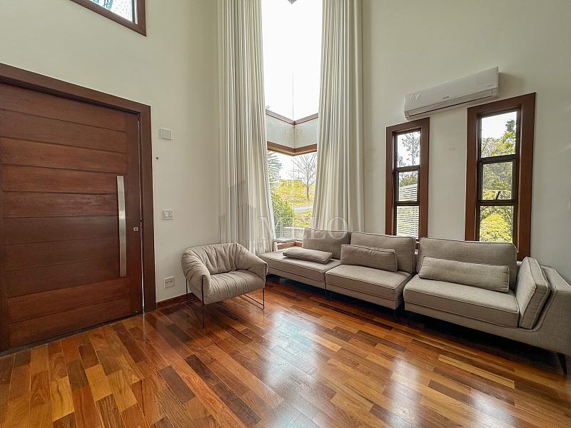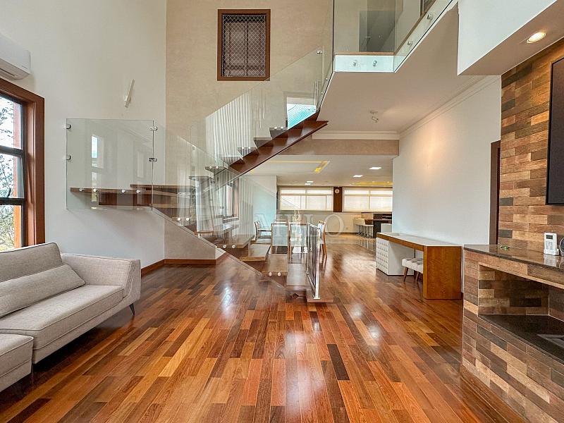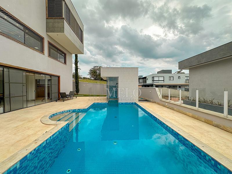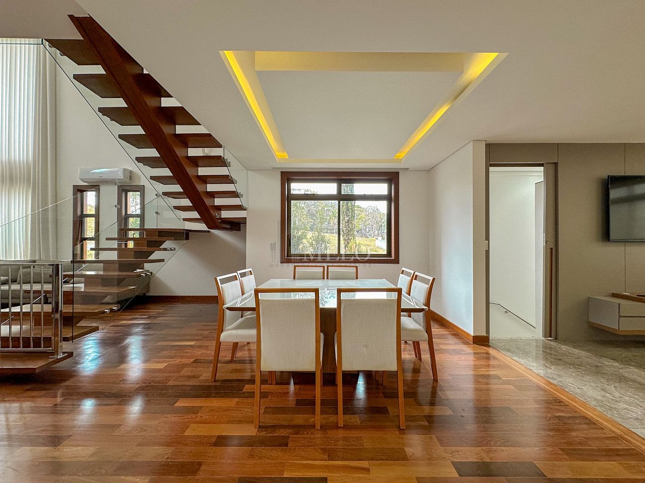 1º pavimento: sala ampla em conceito aberto com pé direito duplo, lareira e lavabo. Cozinha com ilha toda montada, adega, despensa, área de serviço.