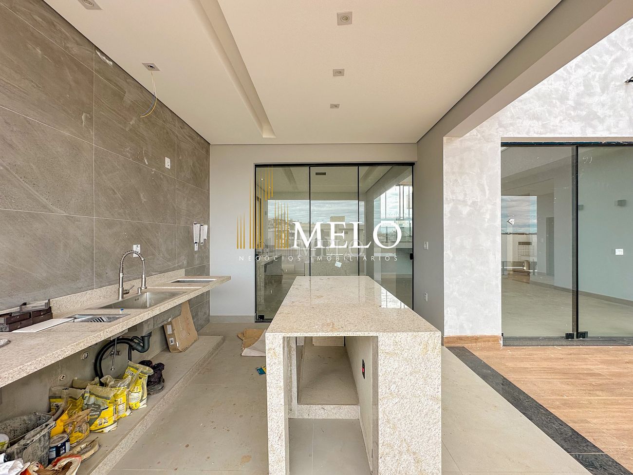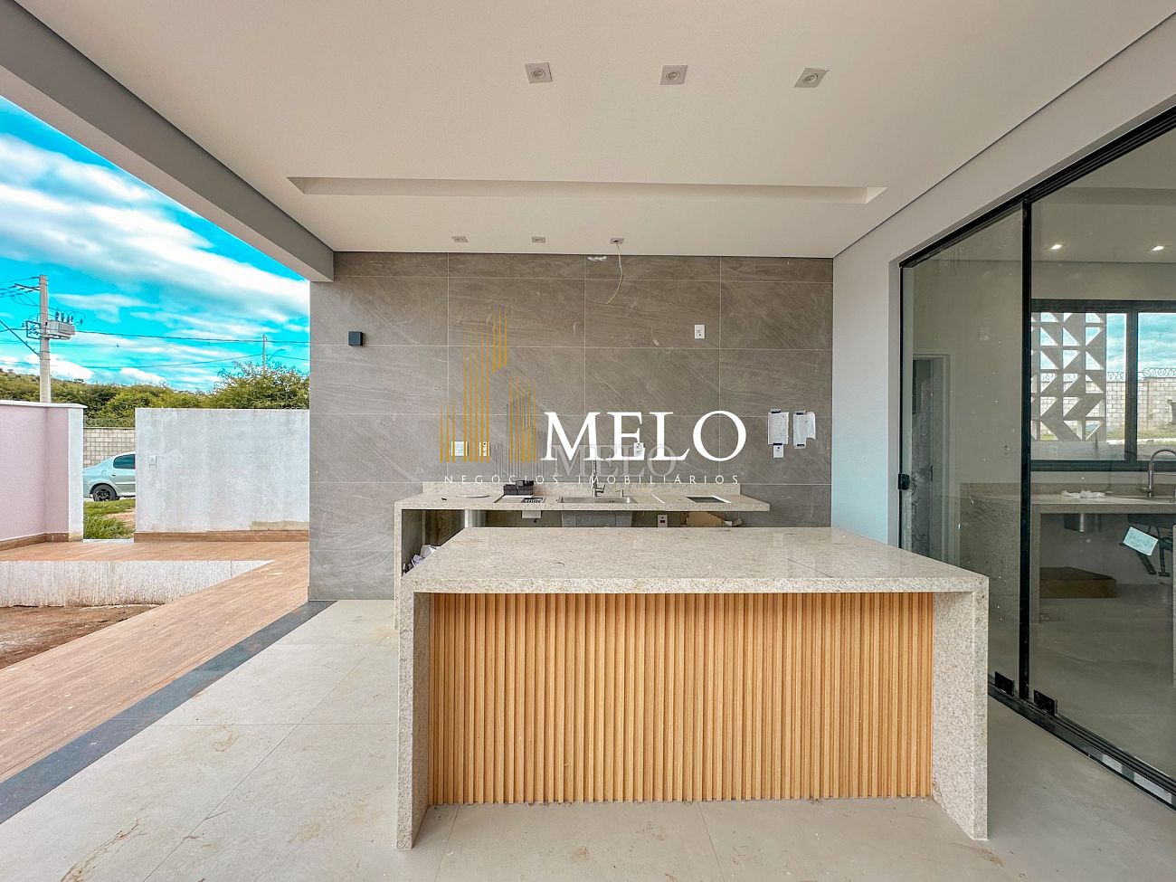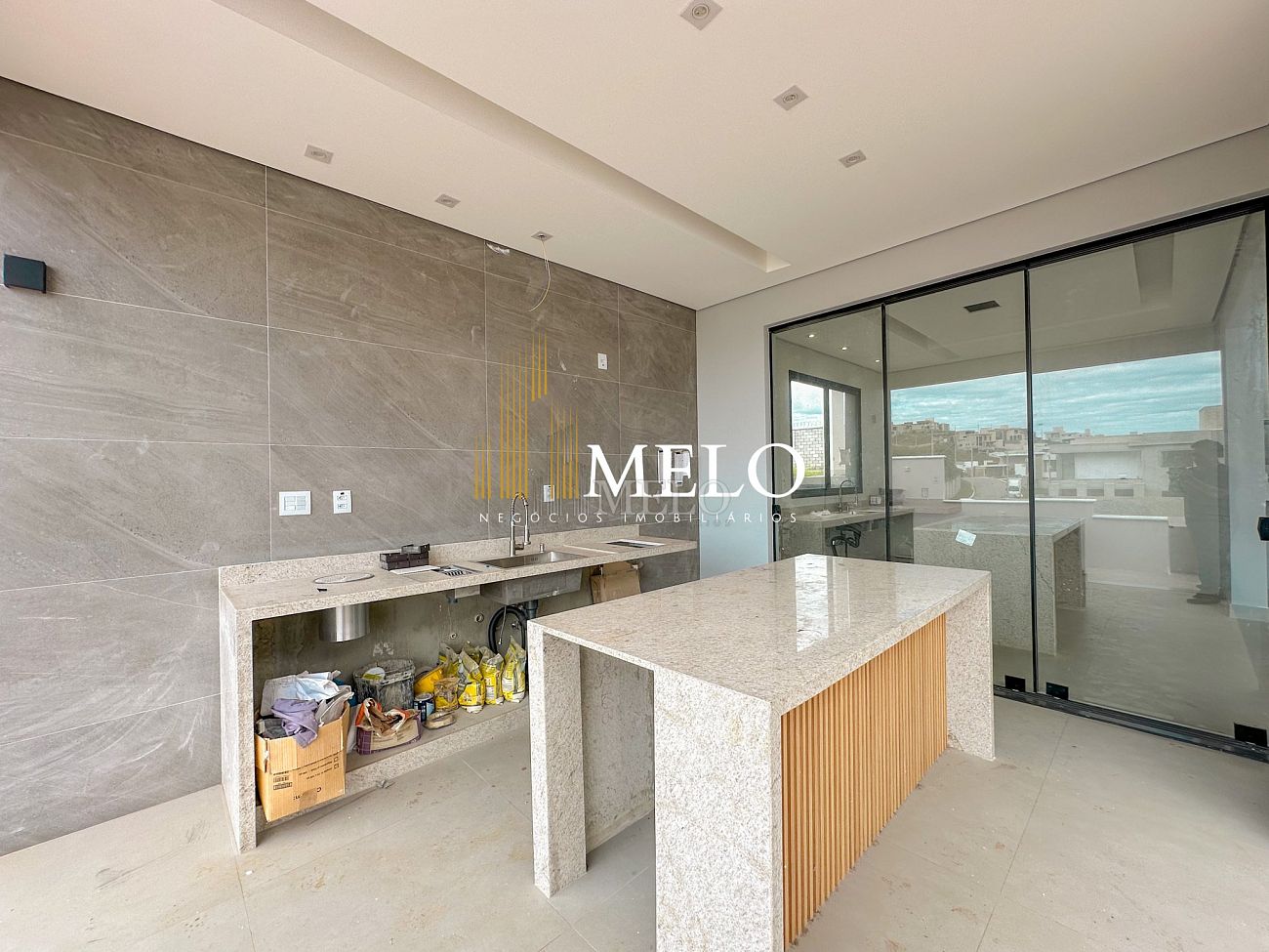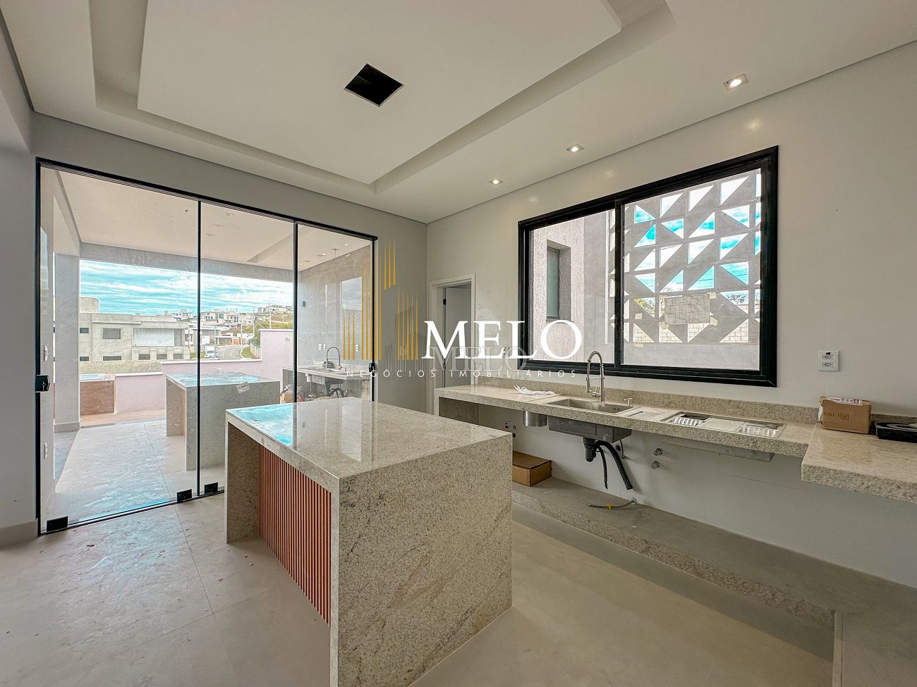 Espaço gourmet I bancada em granito, churrasqueira à carvão.