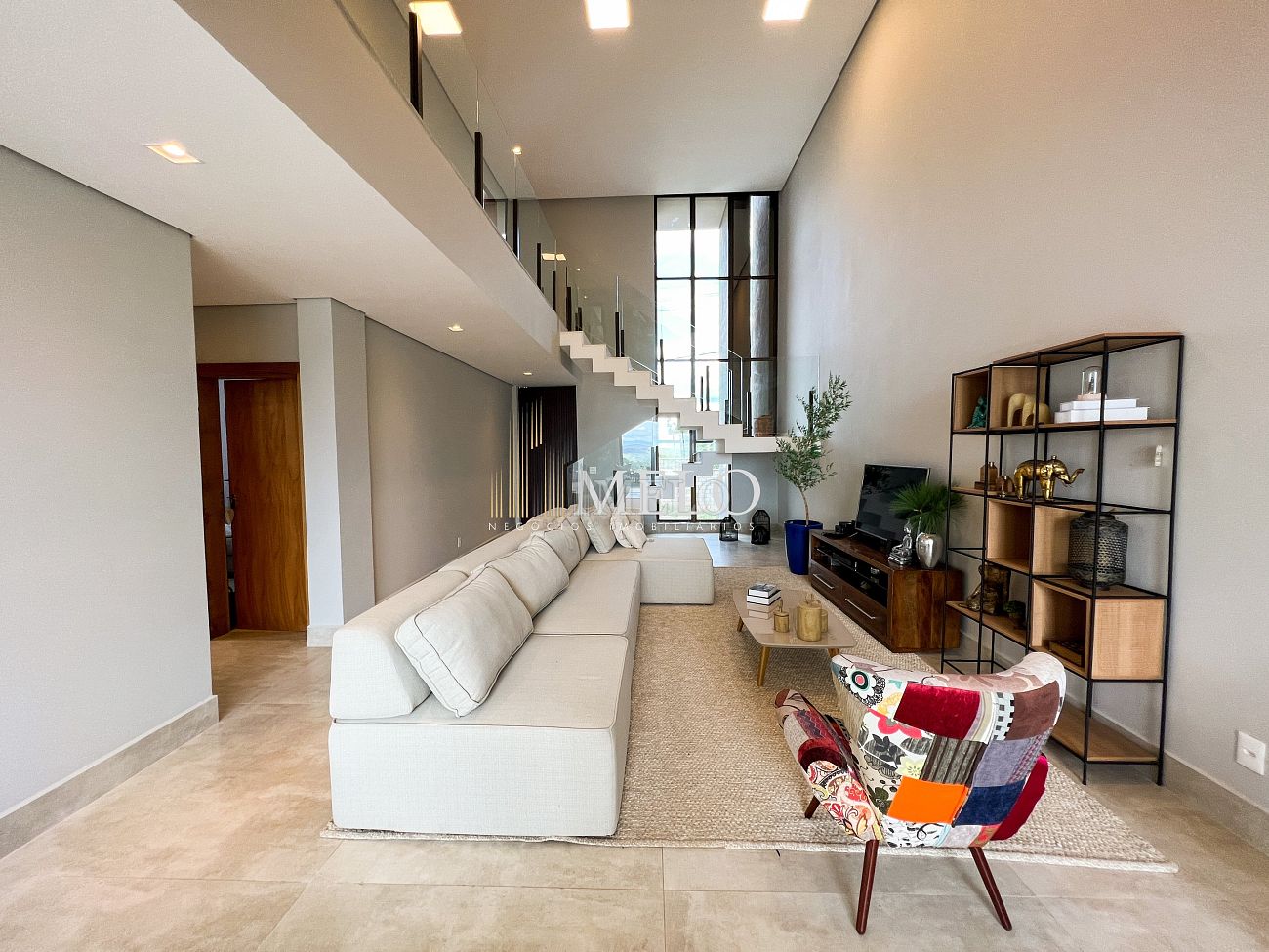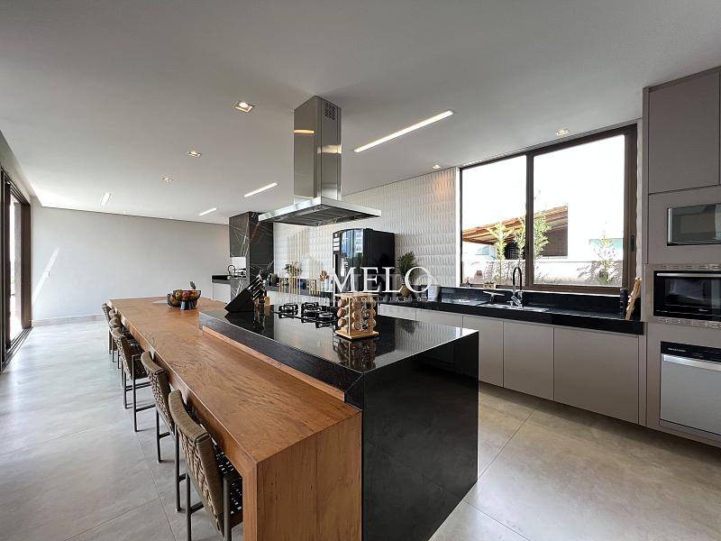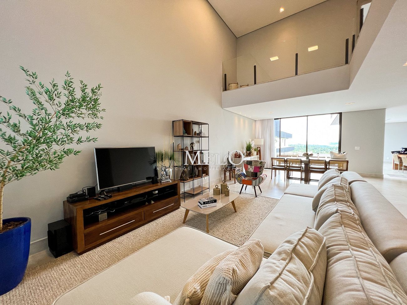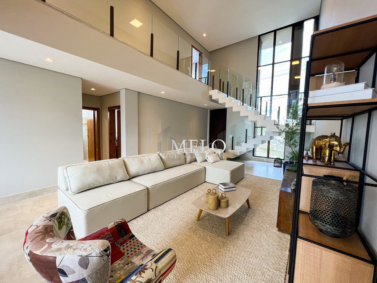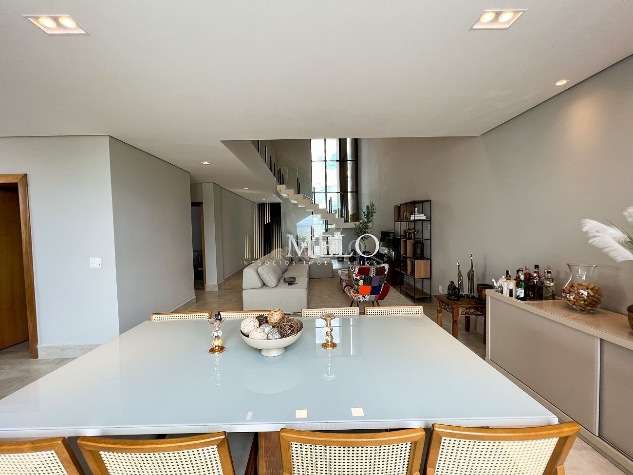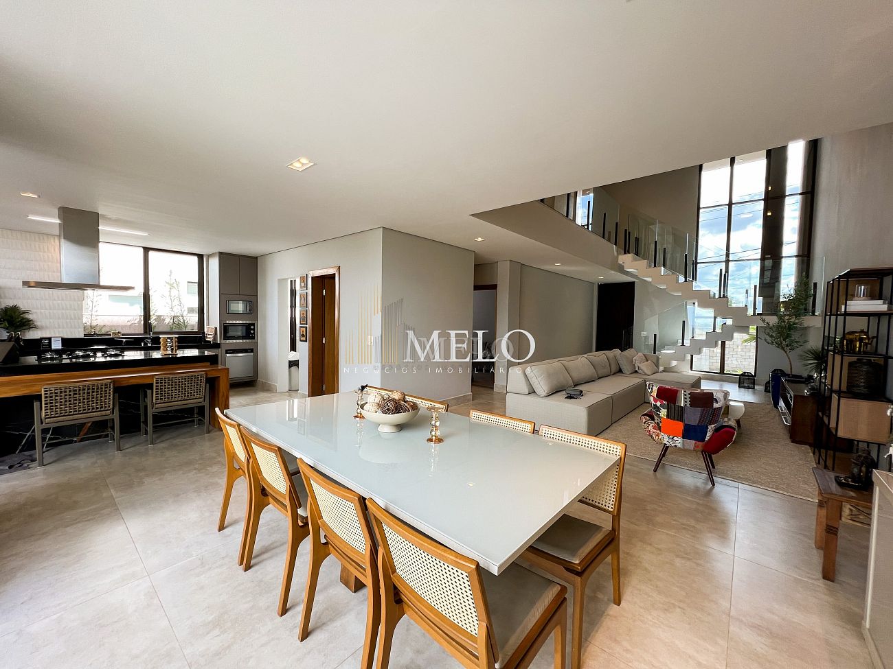 1° PAVIMENTO: Sala ampla com pé direito duplo integrada com cozinha e espaço gourmet. Despensa e área de serviço independente.