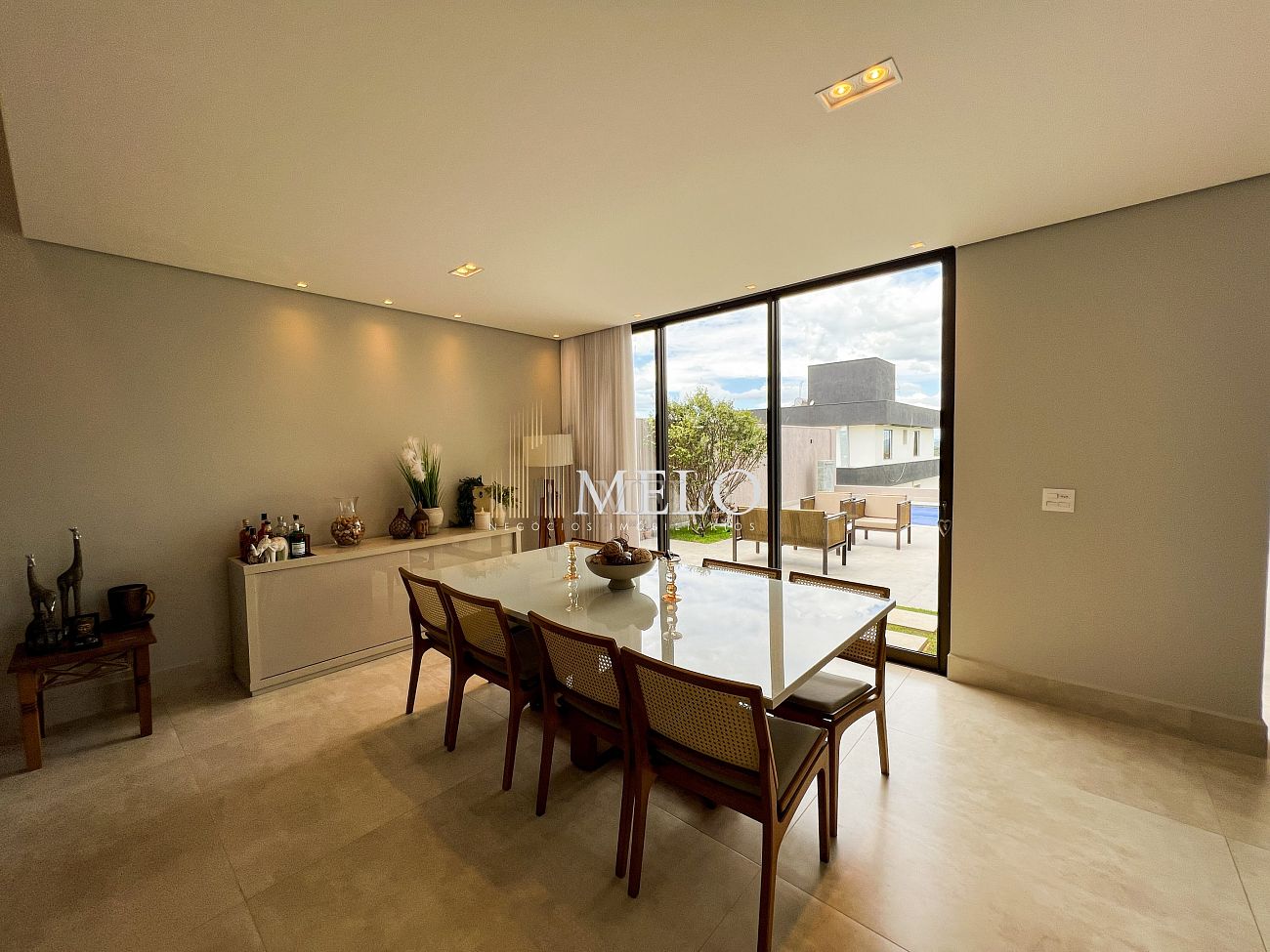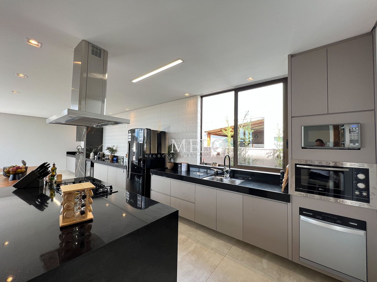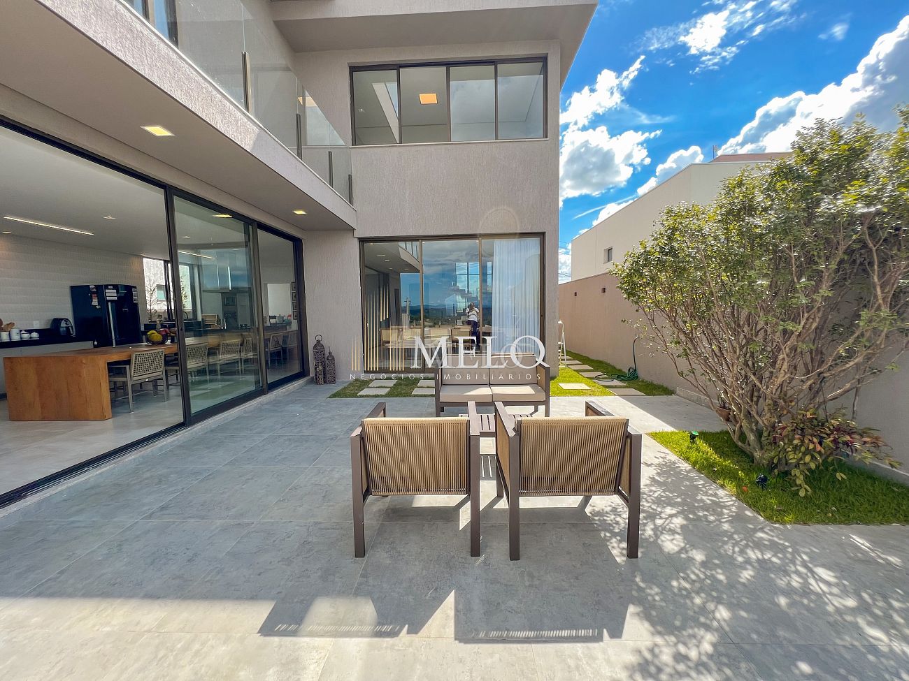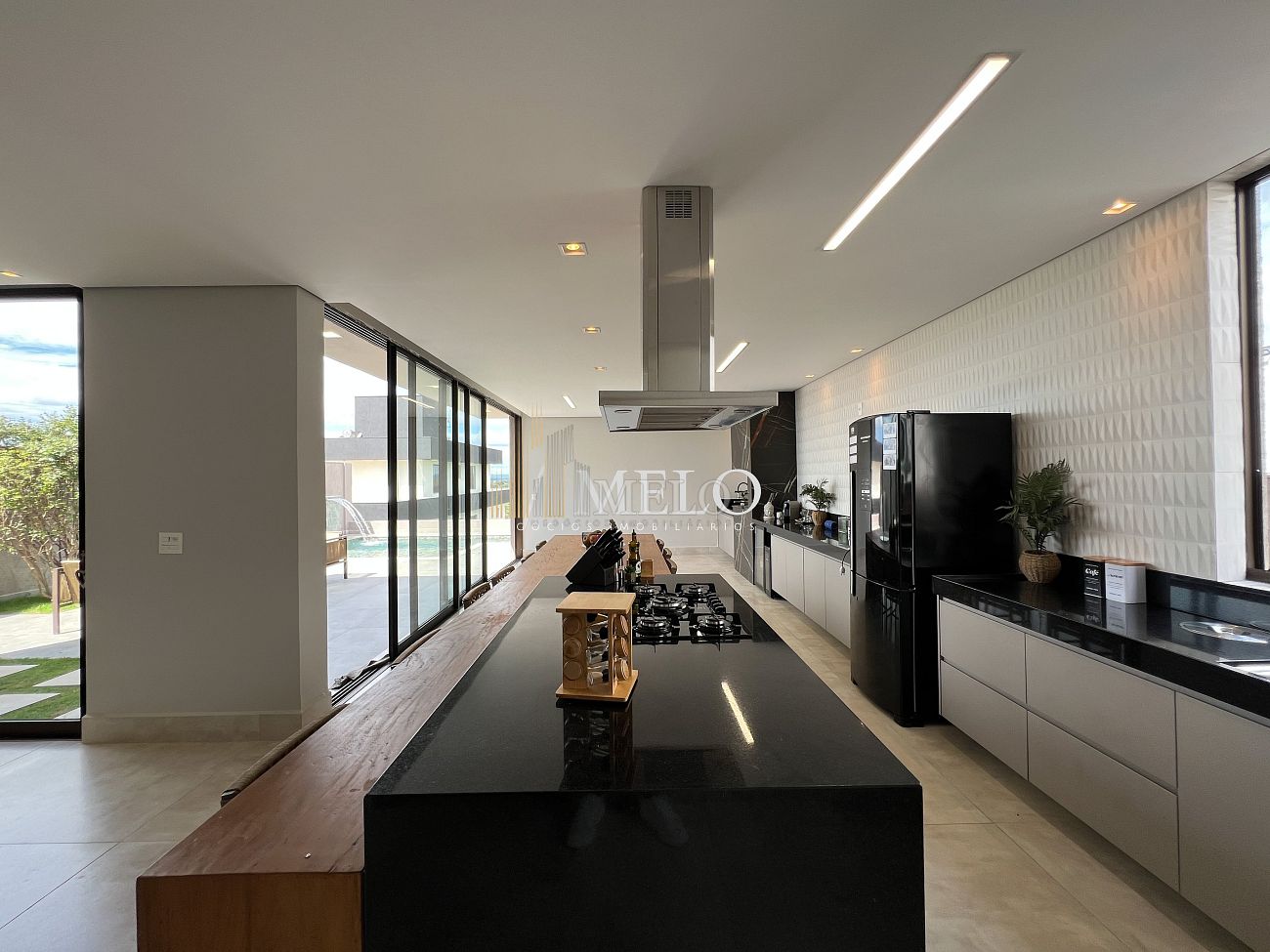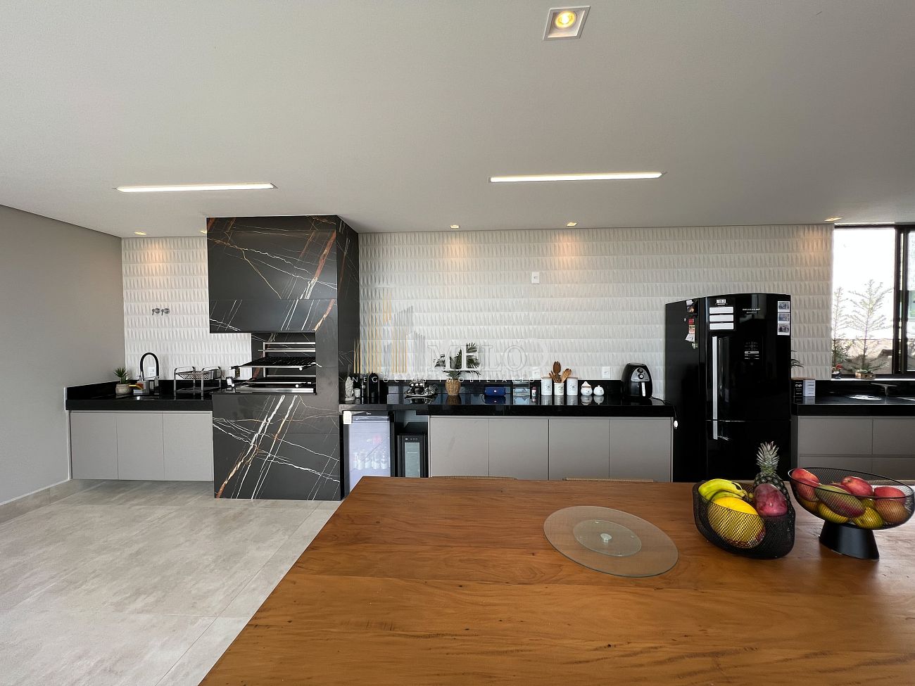 1° PAVIMENTO: Sala ampla com pé direito duplo integrada com cozinha e espaço gourmet. Despensa e área de serviço independente.