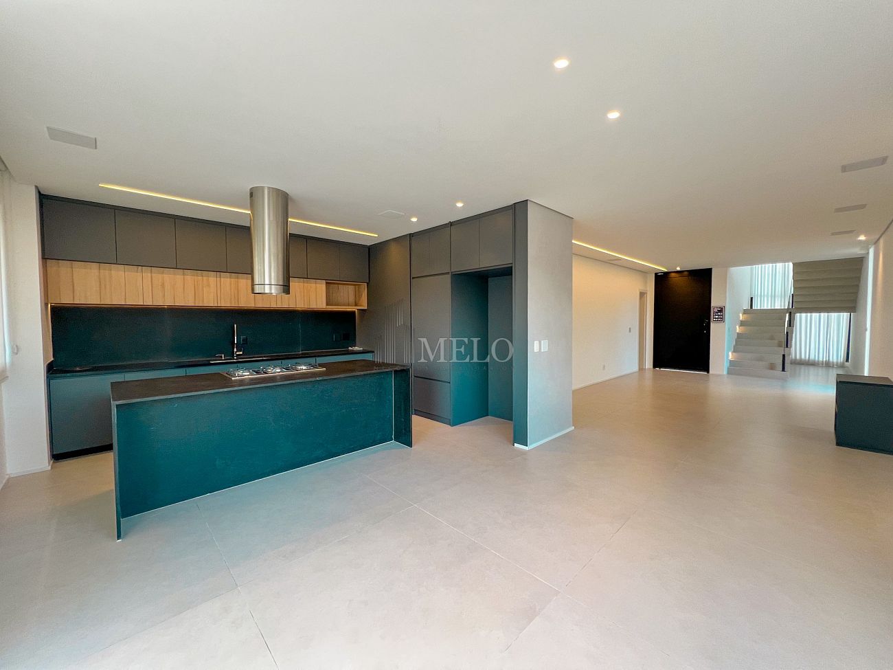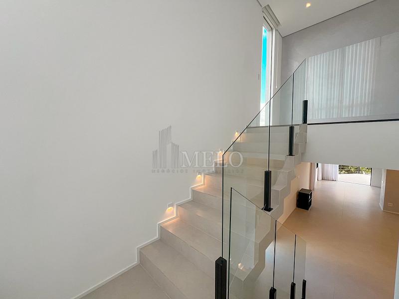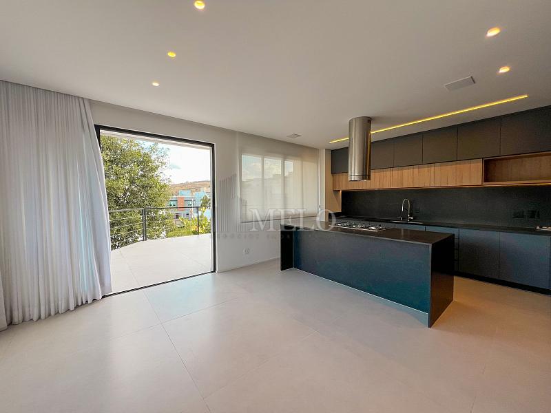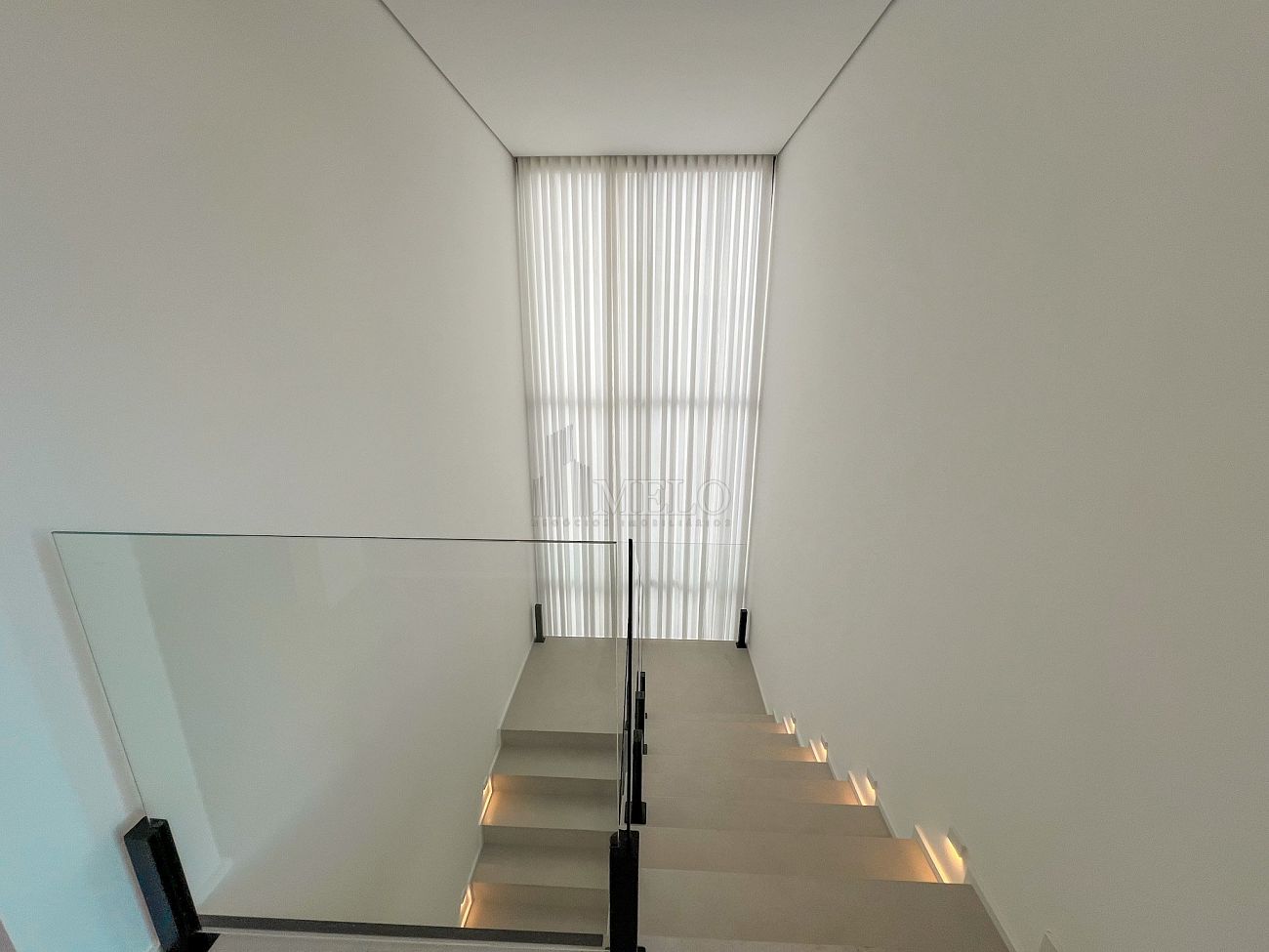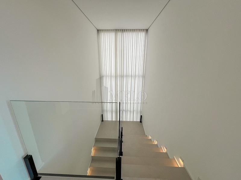 1º Andar - Área Interna: Ampla sala para três ambientes com sistema de som 5.1, lavabo de alto padrão, e cozinha em ilha equipada com cooktop, coifa e cuba dupla gourmet. Área de serviços com duas bancadas e escadaria com pé direito duplo. Espaço gourmet integrado com churrasqueira a carvão, deck monocromático e lavabo externo. Infraestrutura disponível para banheira de 8 lugares e 4 vagas de garagem, com ponto de conexão para carros elétricos.
