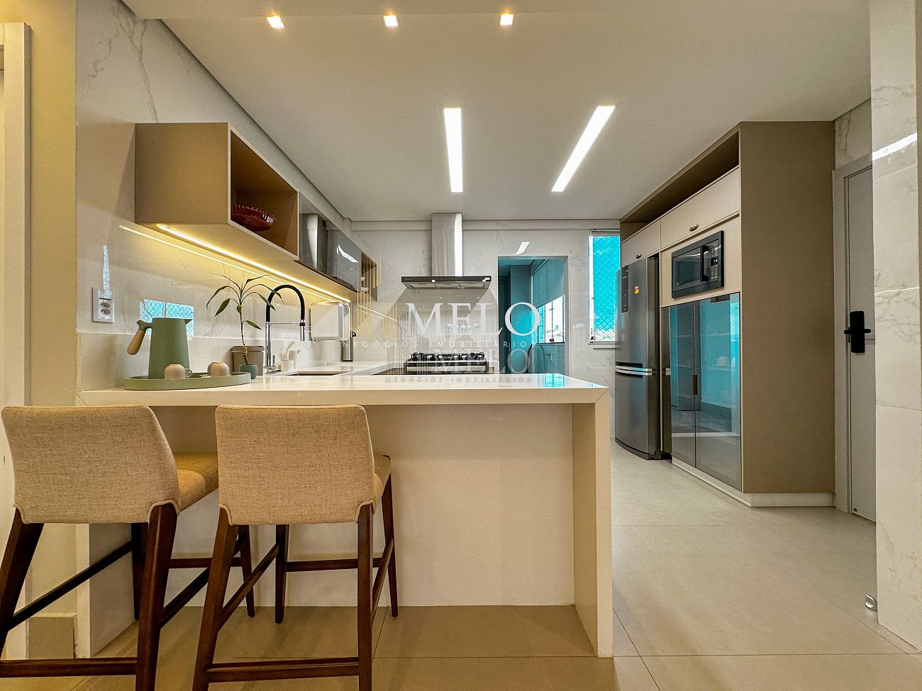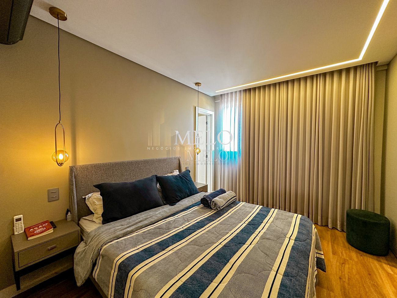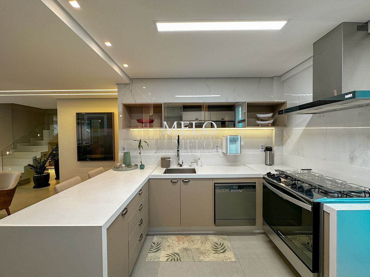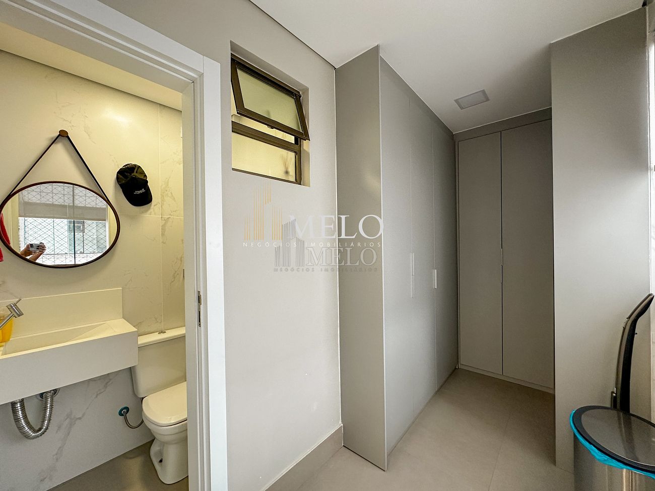 1° Pavimento: Sala ampla para dois ambientes, cozinha americana com armários, cooktop, forno, microondas, geladeira e bancada em quartzo branco, lavanderia com banheiro, banheiro social, 3 quartos com cama e armários planejados,1 suíte master com clouset.