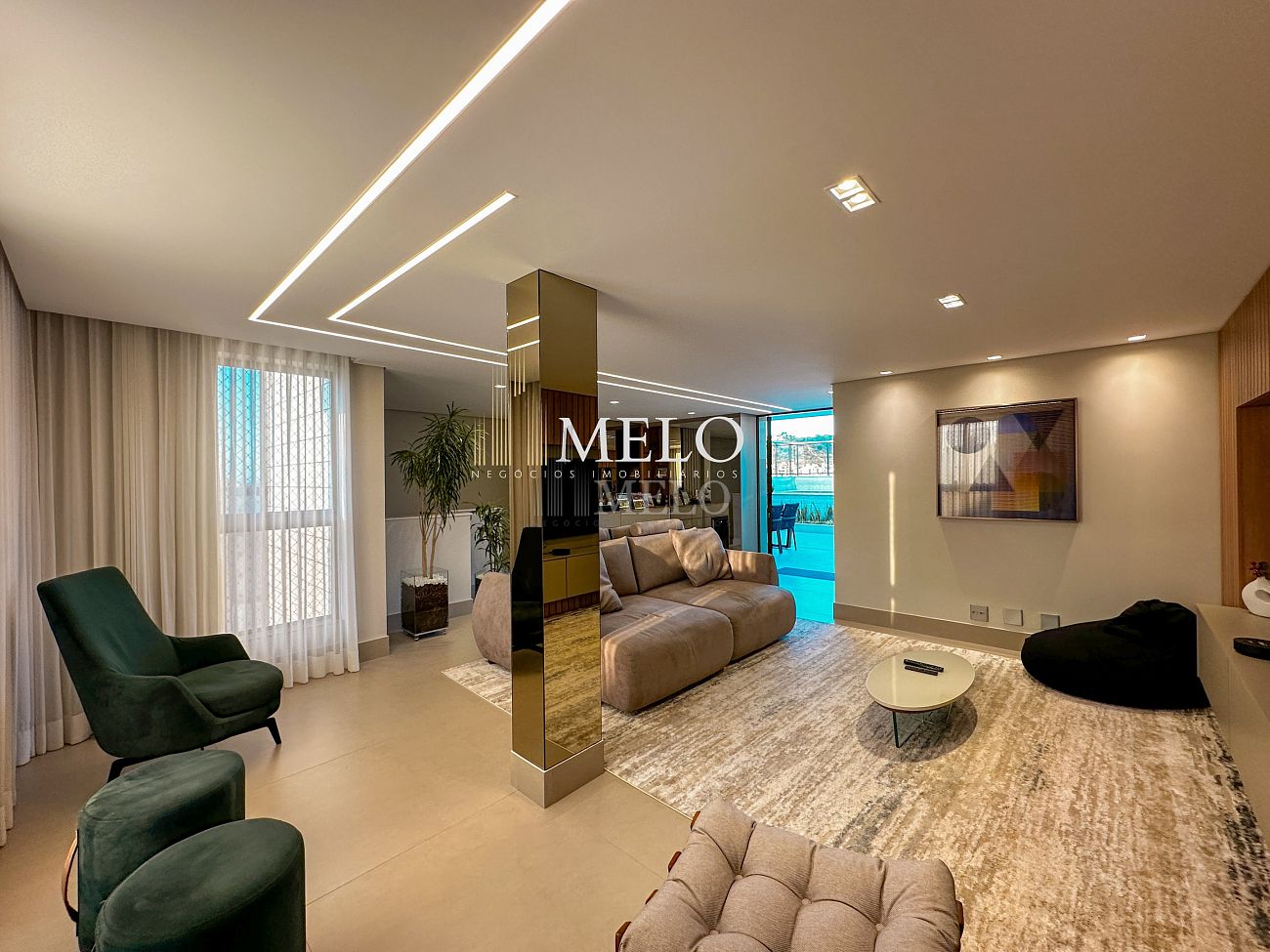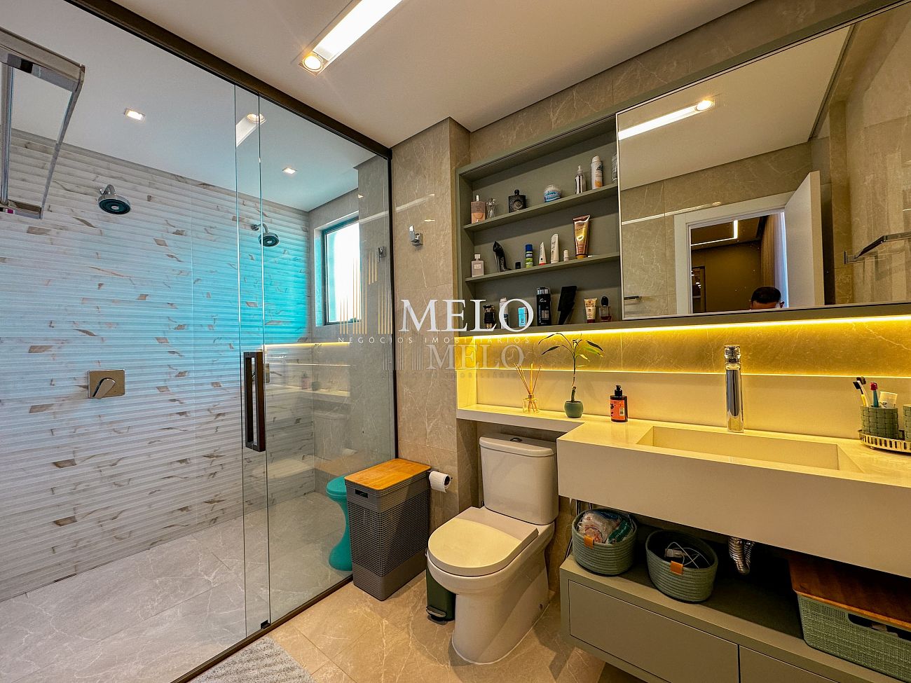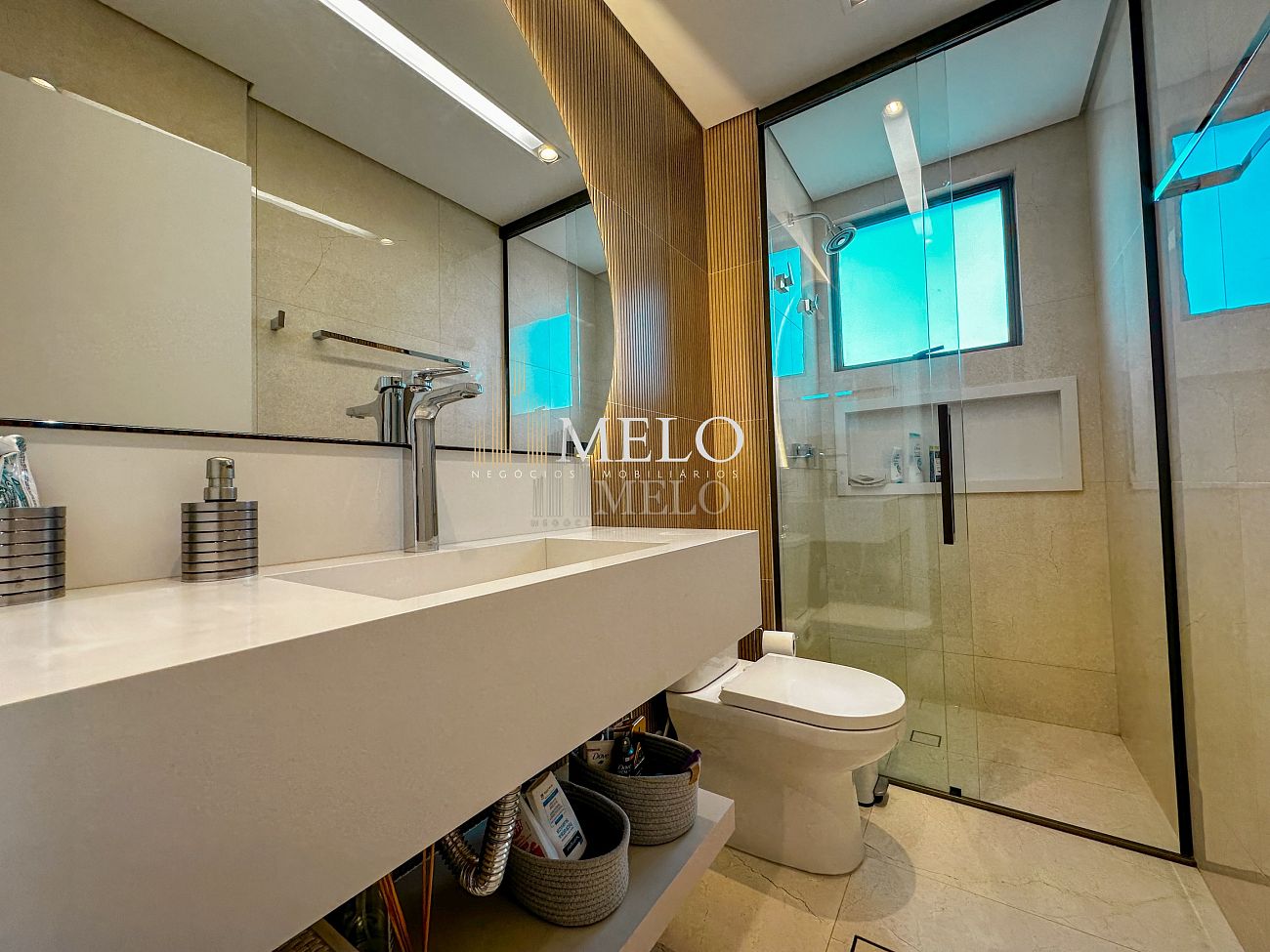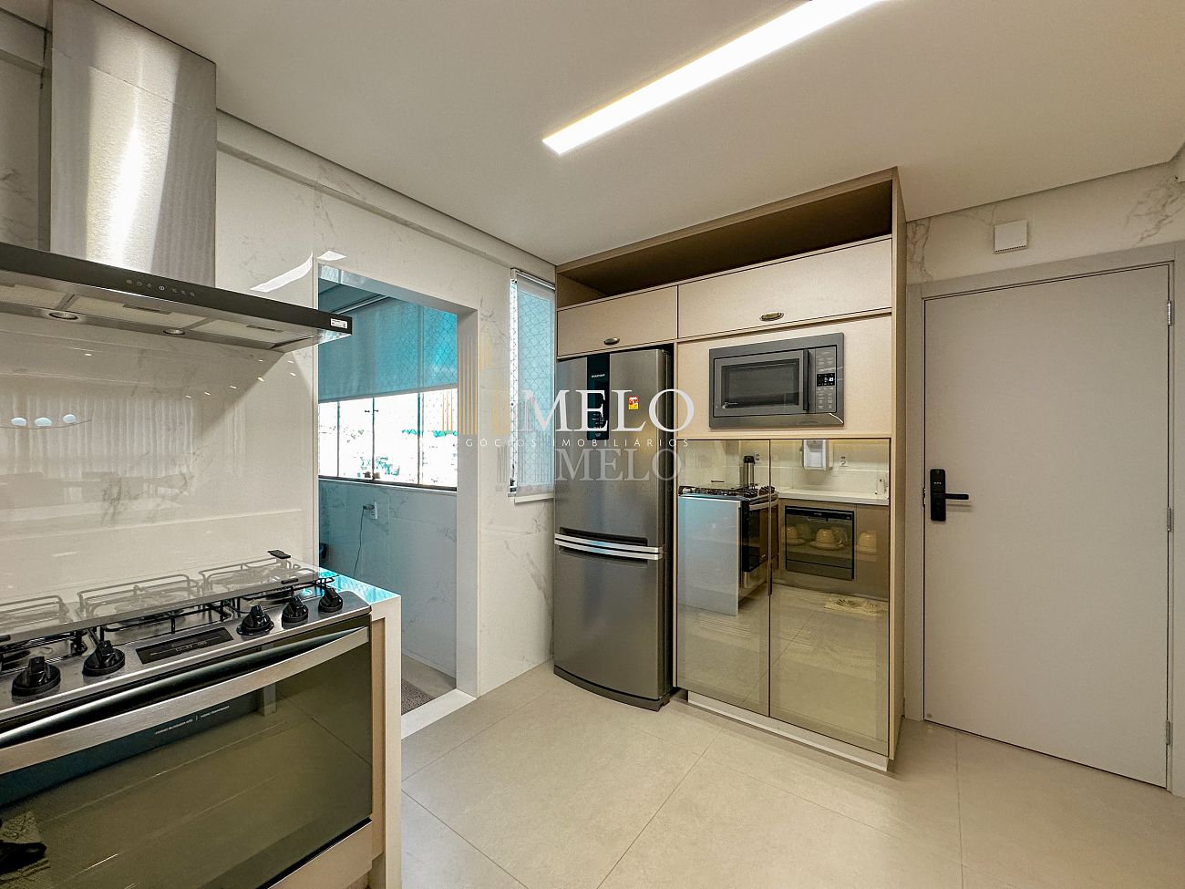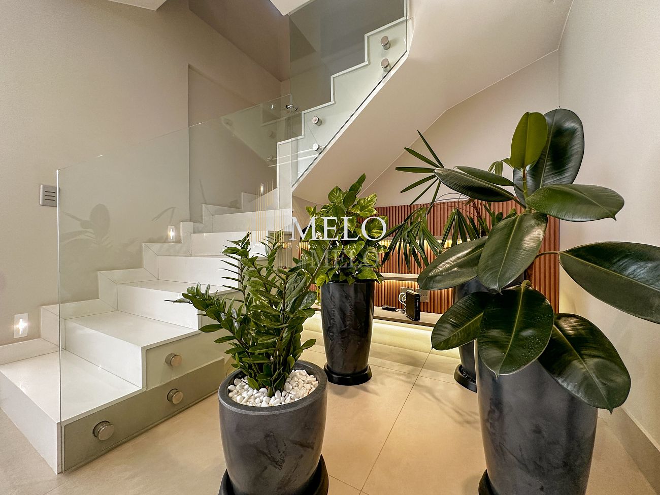 1° Pavimento: Sala ampla para dois ambientes, cozinha americana com armários, cooktop, forno, microondas, geladeira e bancada em quartzo branco, lavanderia com banheiro, banheiro social, 3 quartos com cama e armários planejados,1 suíte master com clouset.
