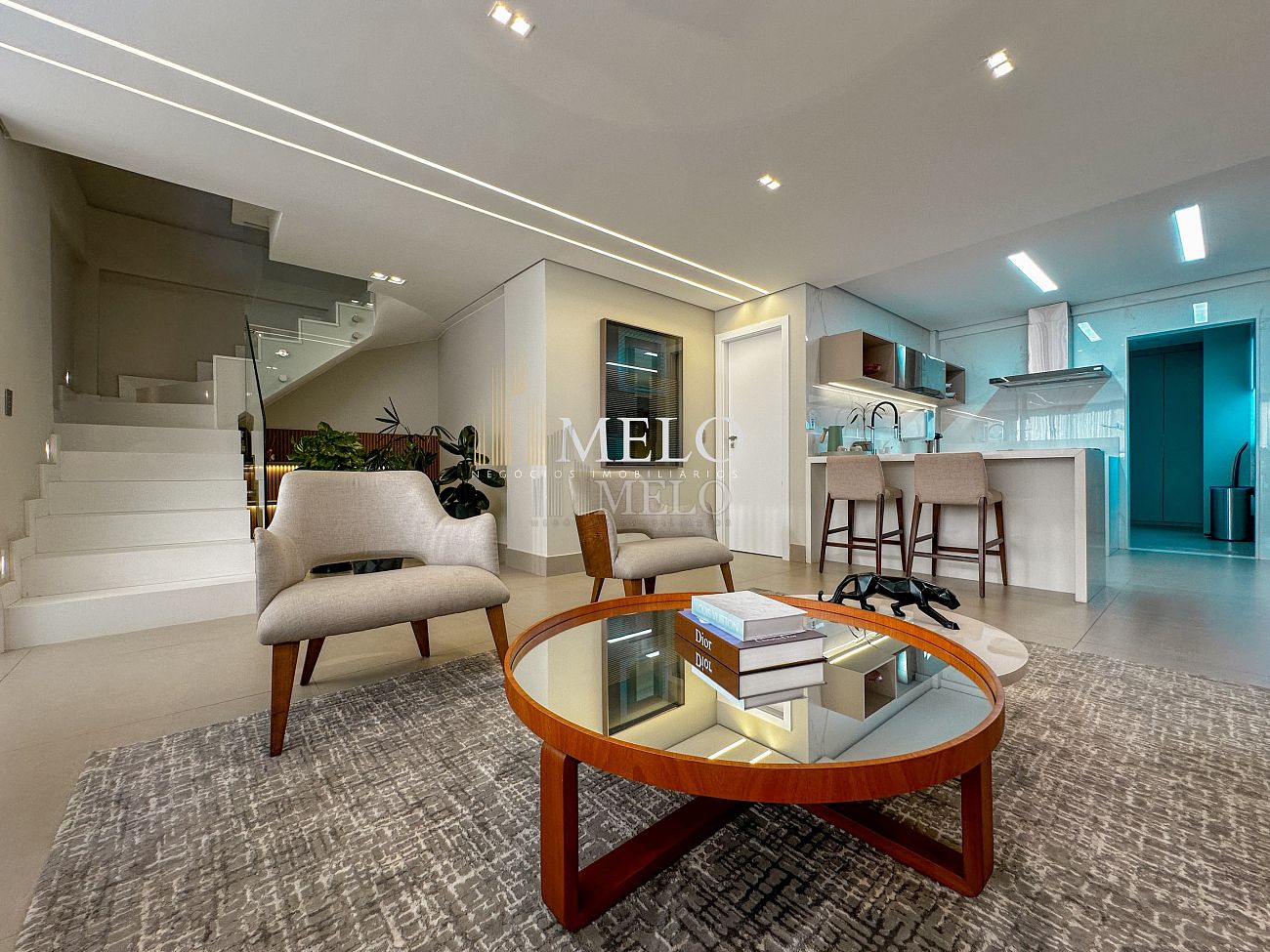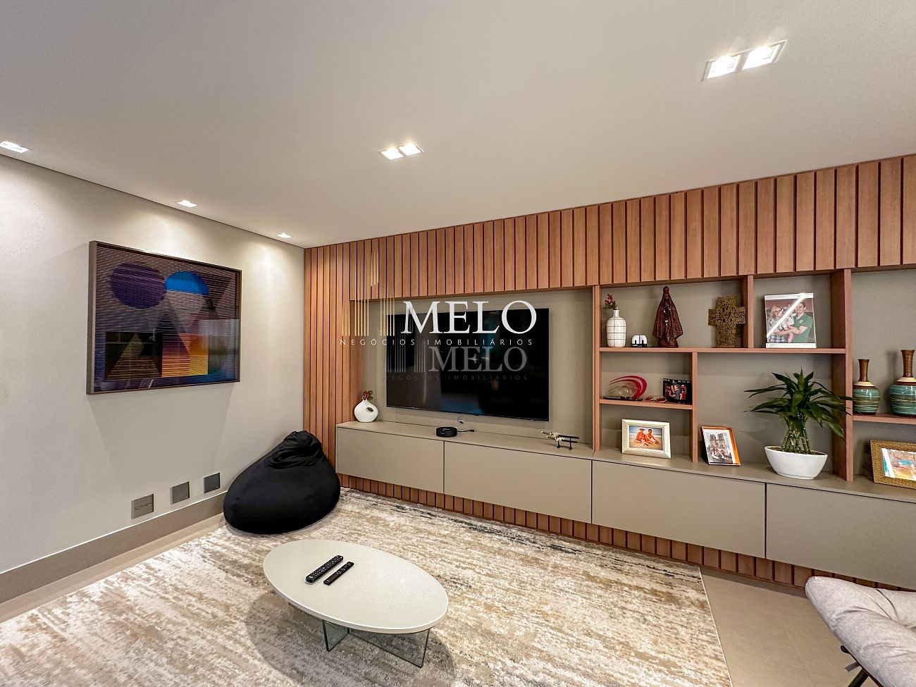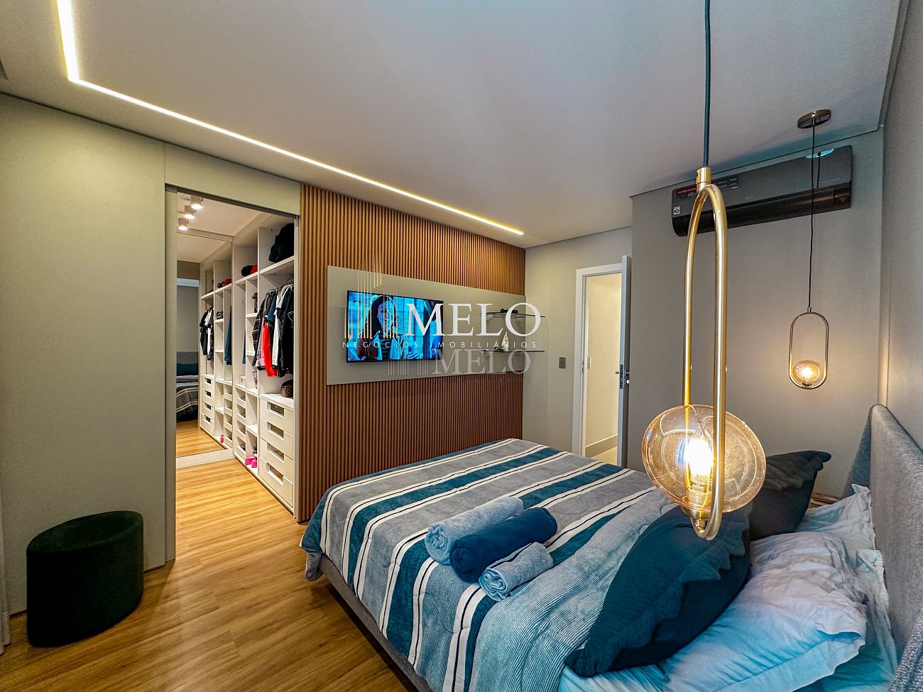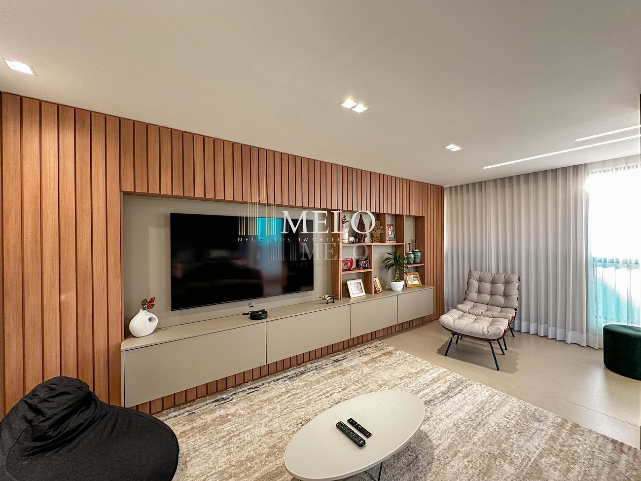 1° Pavimento: Sala ampla para dois ambientes, cozinha americana com armários, cooktop, forno, microondas, geladeira e bancada em quartzo branco, lavanderia com banheiro, banheiro social, 3 quartos com cama e armários planejados,1 suíte master com clouset.