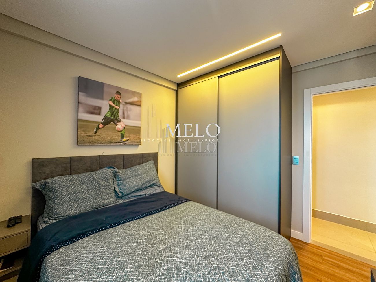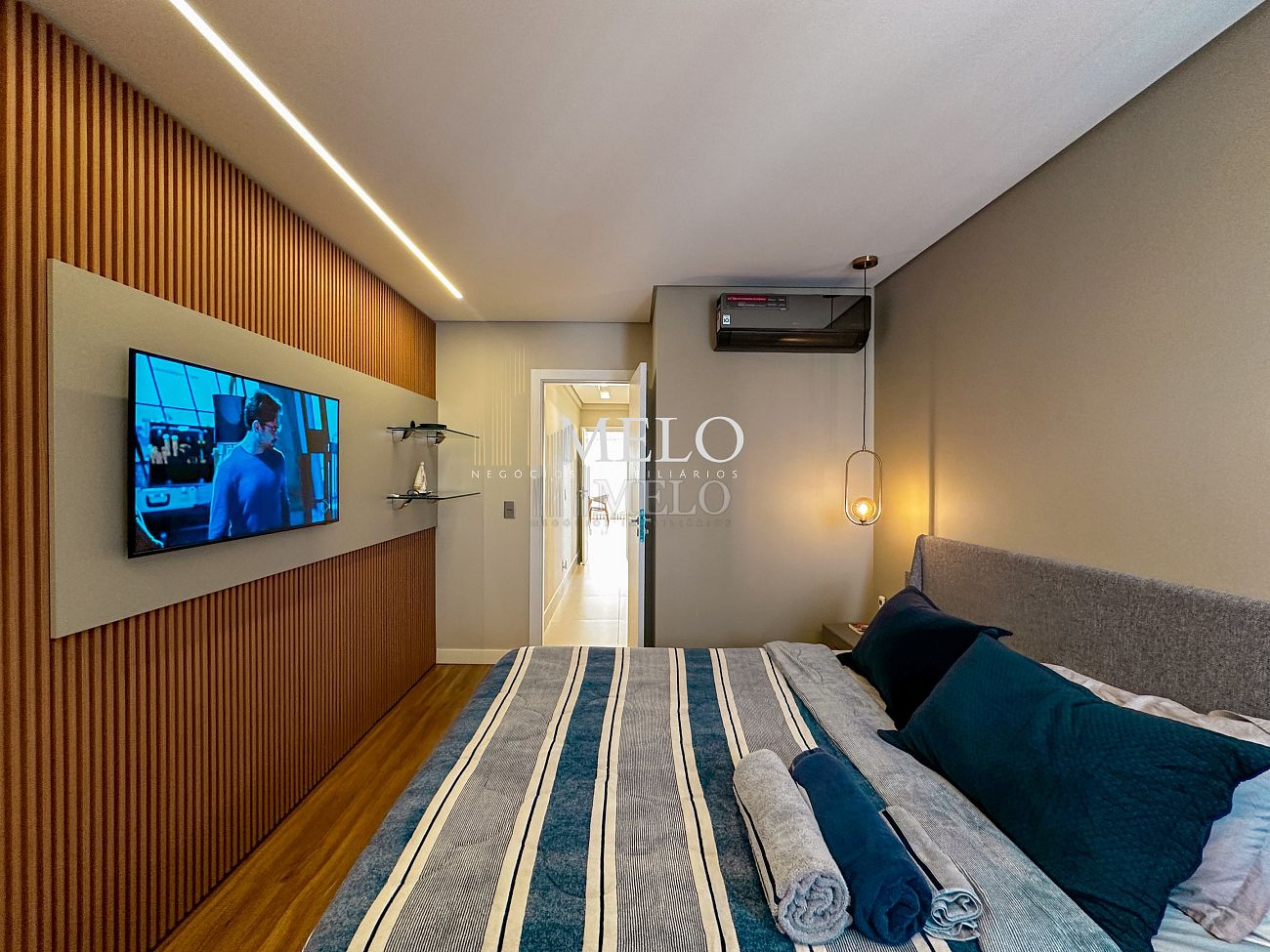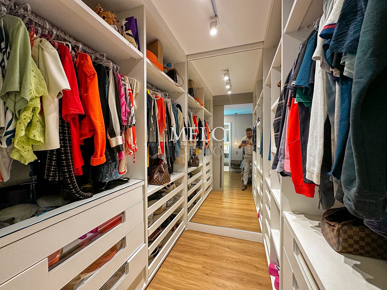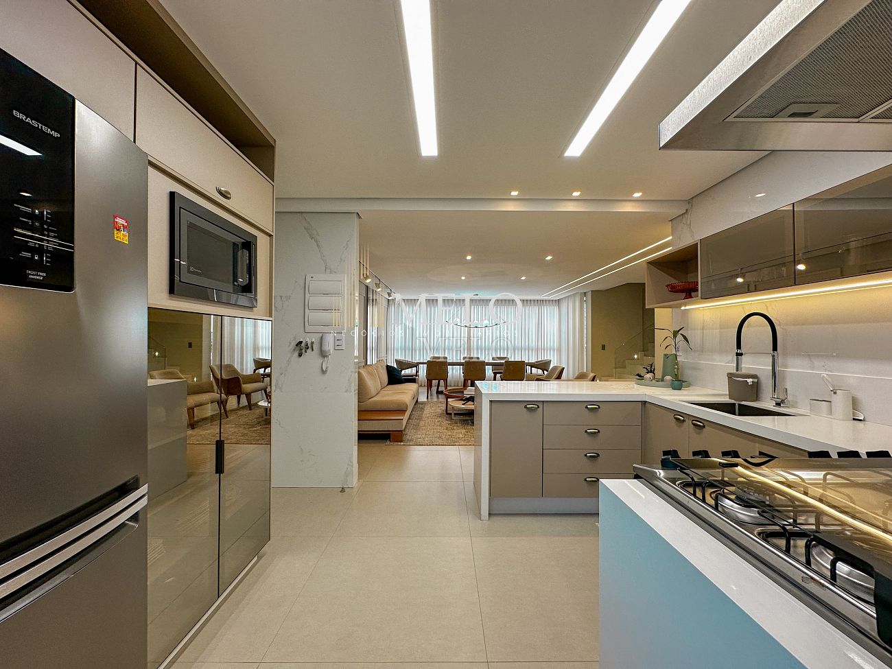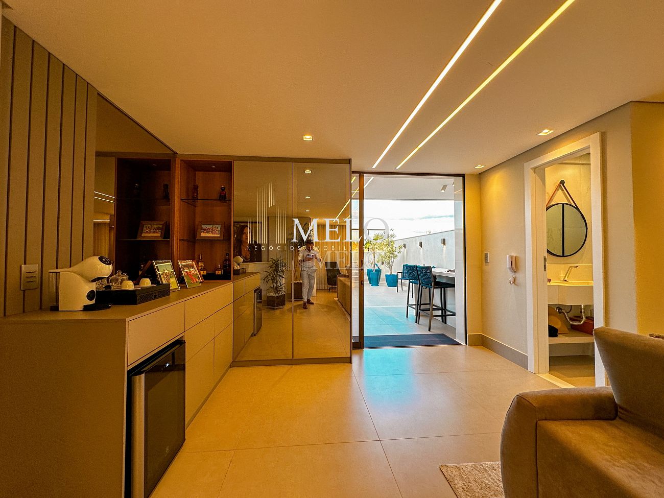 1° Pavimento: Sala ampla para dois ambientes, cozinha americana com armários, cooktop, forno, microondas, geladeira e bancada em quartzo branco, lavanderia com banheiro, banheiro social, 3 quartos com cama e armários planejados,1 suíte master com clouset.